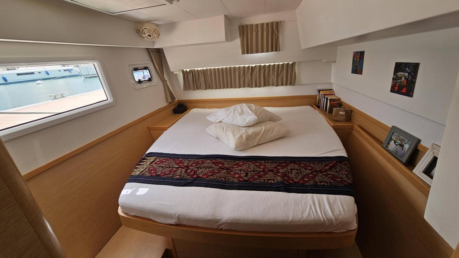 Lagoon 42 proposé en quatre cabines, avec salles d’eau privatives. La coque est spacieuse, le carré est lumineux avec une grande cuisine en L, et l’accès au cockpit est fluide grâce à une plateforme arrière abaissée.