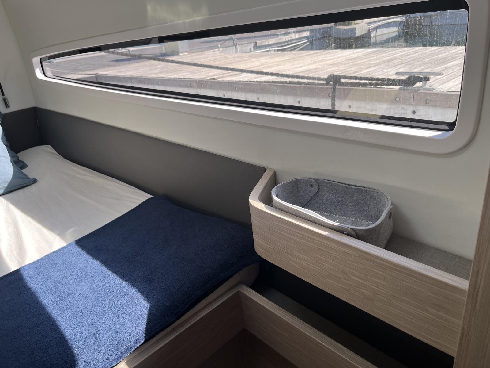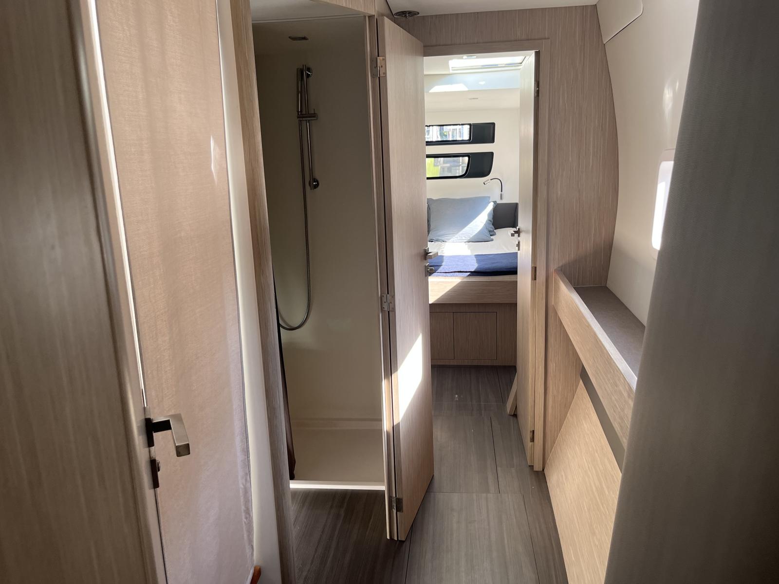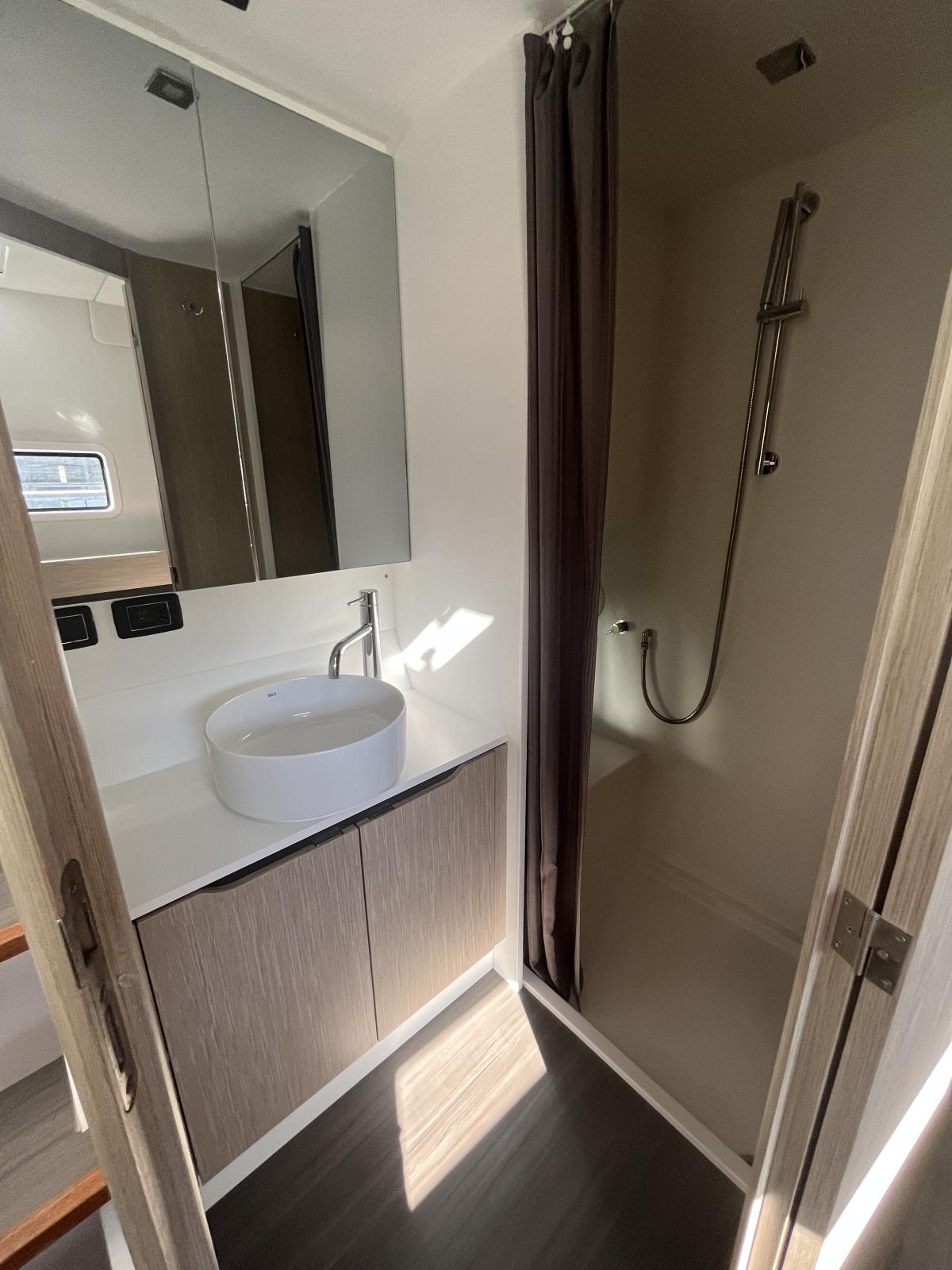 Il dispose de 4 cabines : dans la coque bâbord, deux cabines doubles et un cabinet de toilette/douche ainsi qu’une mini buanderie avec machine à laver 3kg.