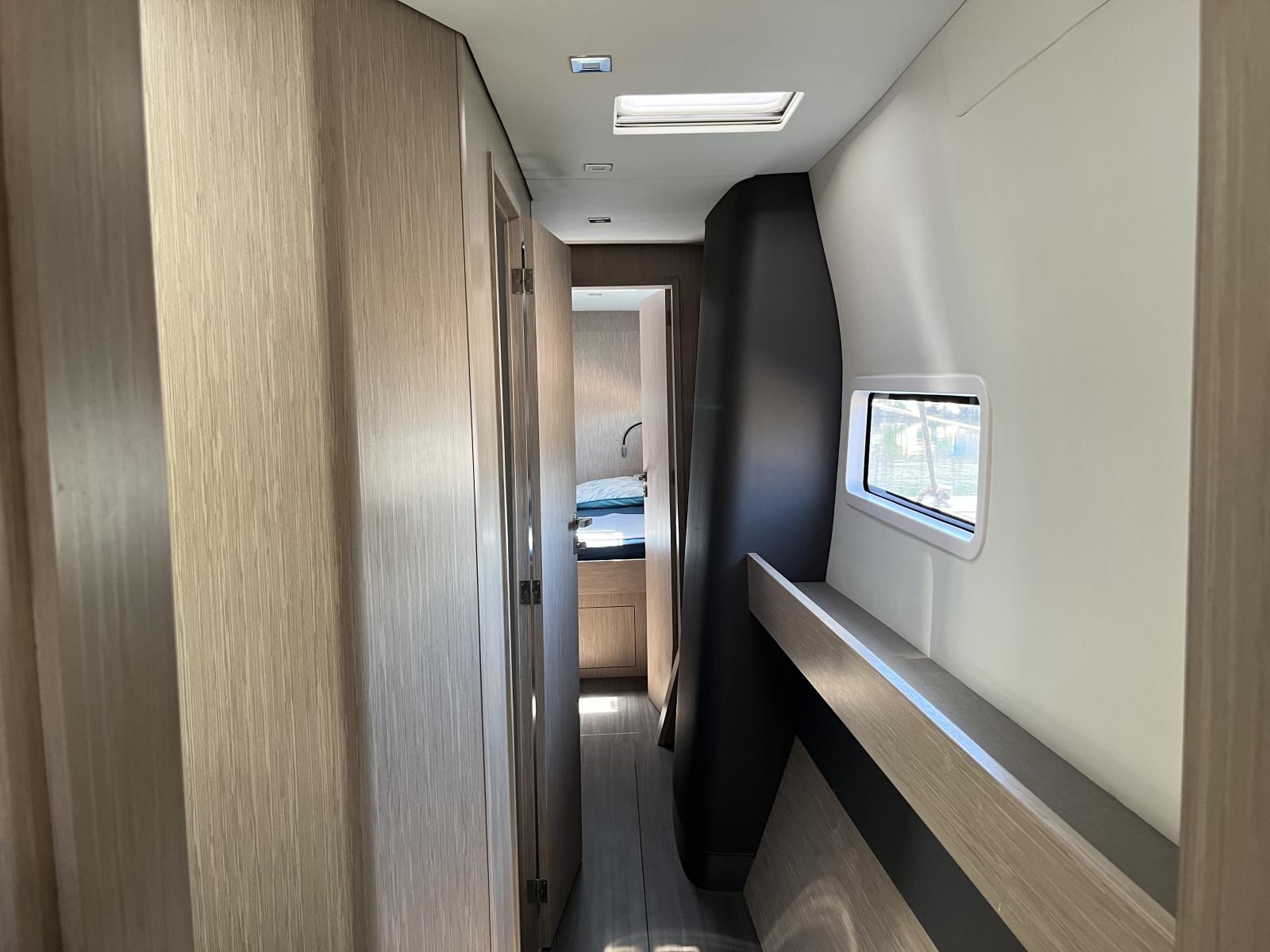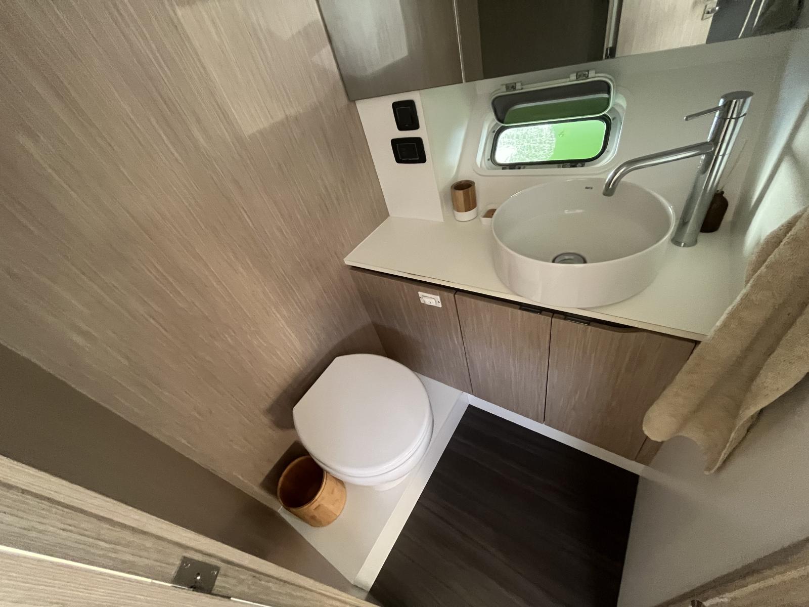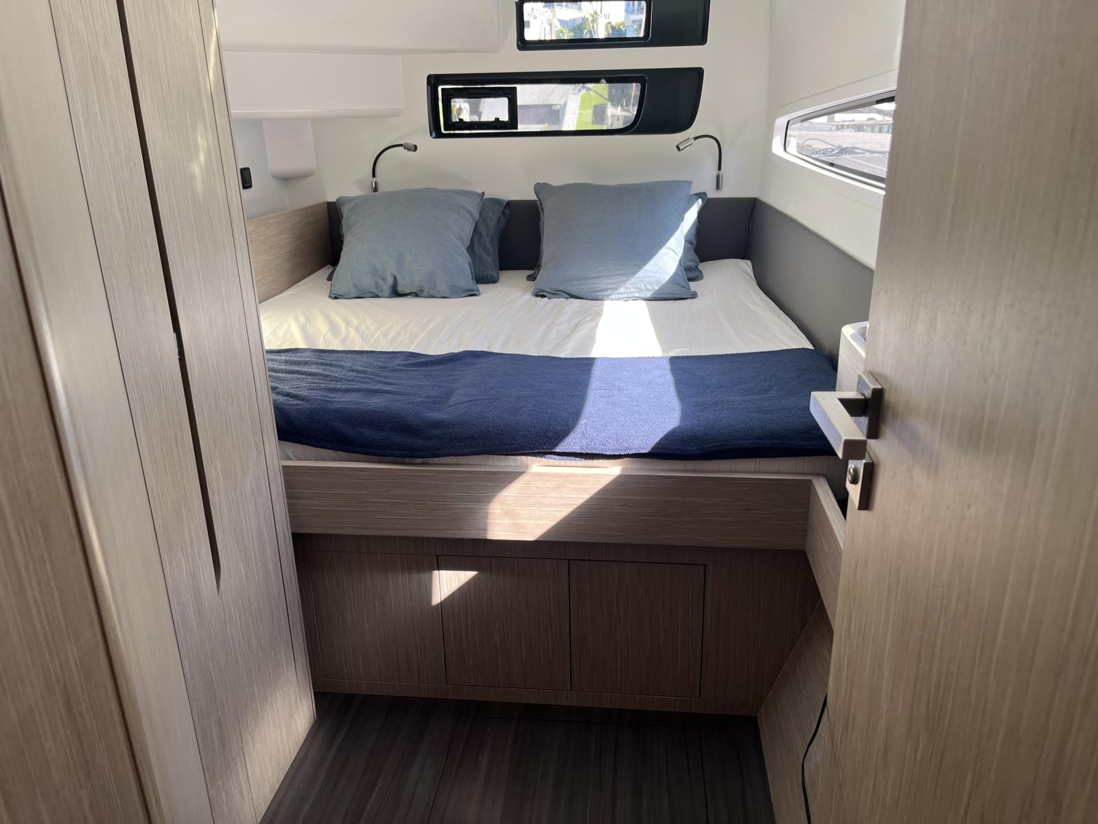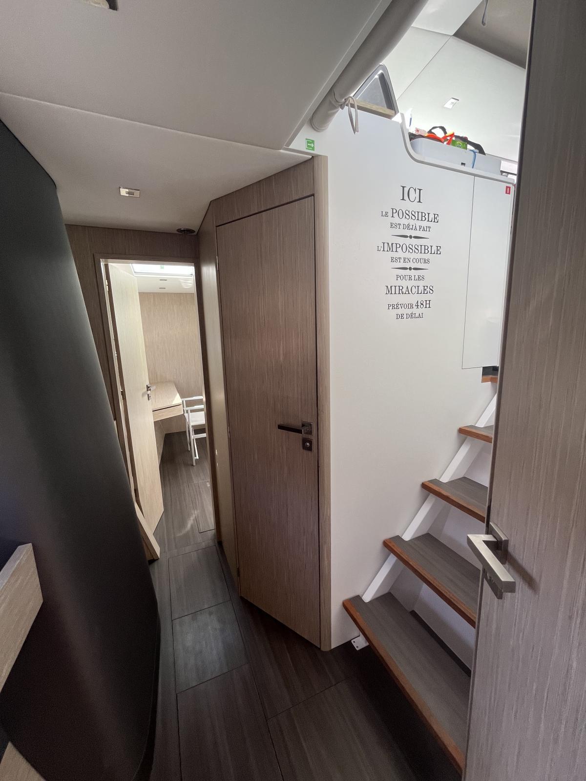 Il dispose de 4 cabines : dans la coque bâbord, deux cabines doubles et un cabinet de toilette/douche ainsi qu’une mini buanderie avec machine à laver 3kg.
