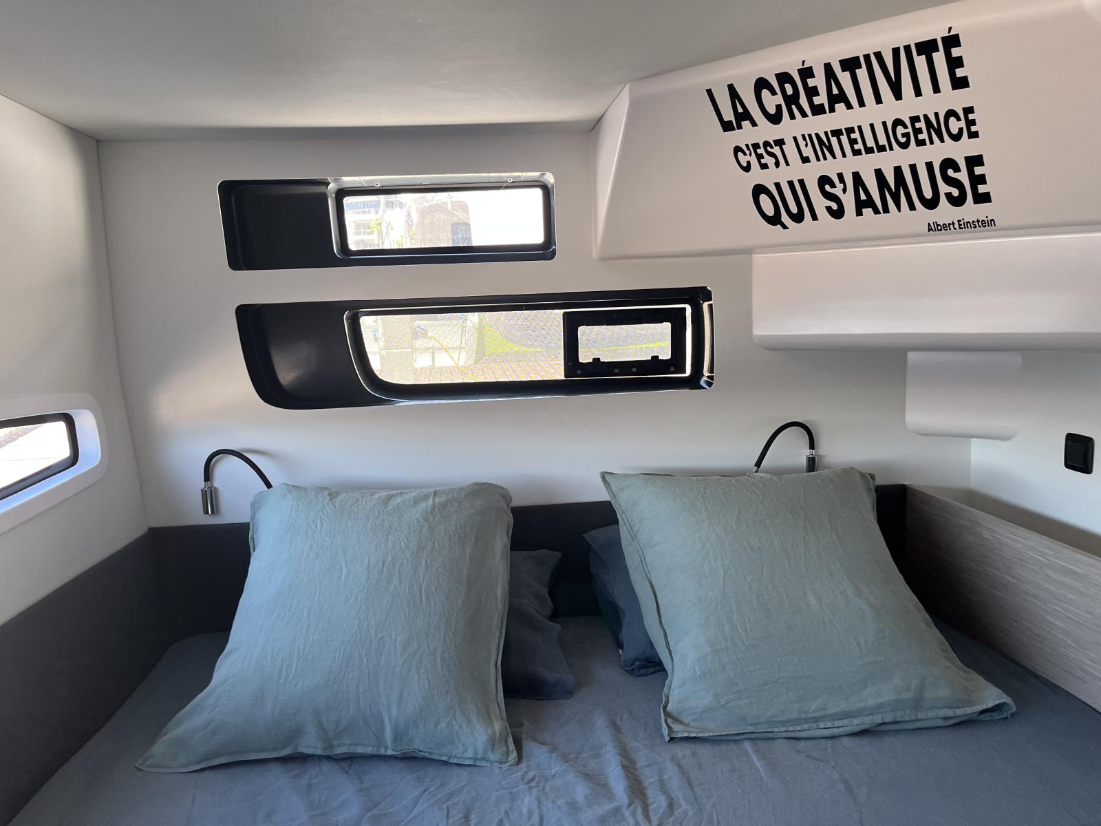 Version 4 cabines avec espace modulable bureau/lits simples, idéal pour grande croisière en famille ou activité charter.