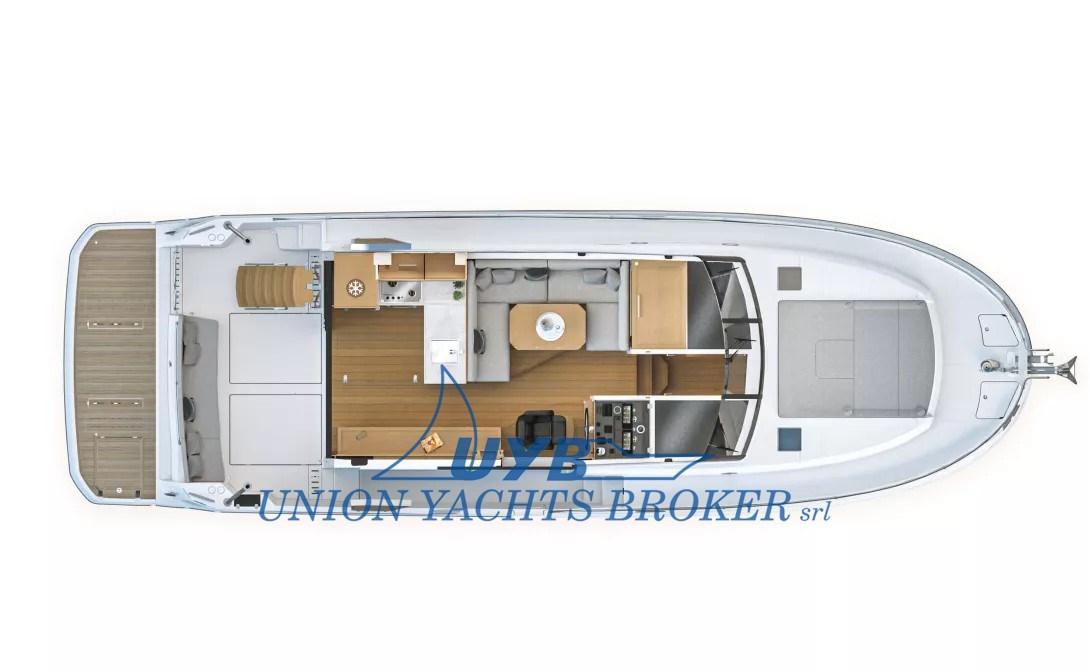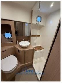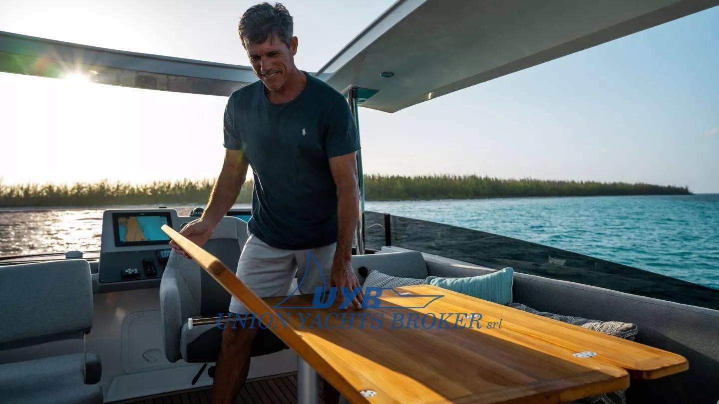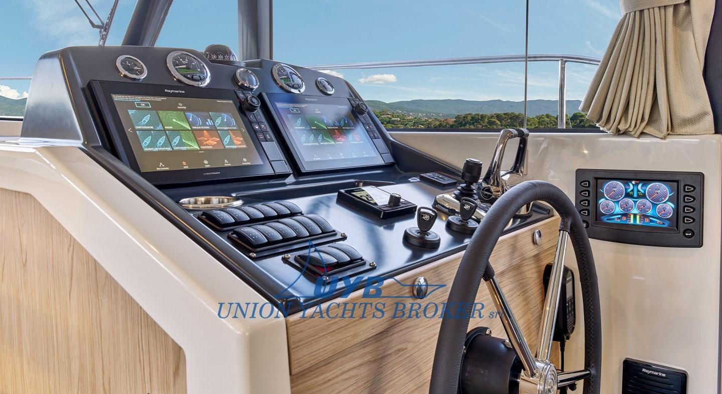 Alarme moteur, Alarme de pompe de cale, Alternateur, Eau sous pression, Douche de cockpit, Double barre à roue, Flaps électriques, Hard top, Passerelle, Plateforme arrière, Pompe de cale automatique, Porte latérale, Porte latérale, Cockpit en teck, Prise de quai, Onduleur, Guindeau électrique, Echelle de bain, Table pliante de salon, Corne.