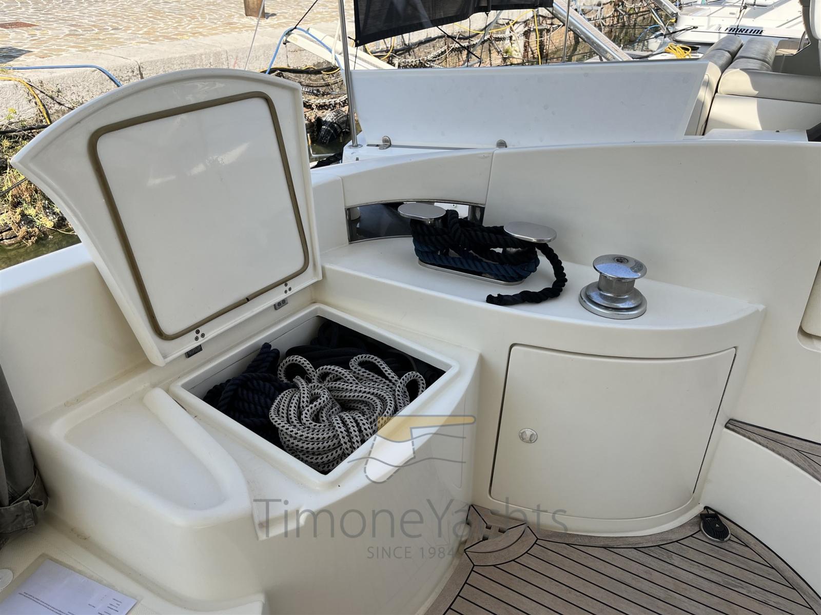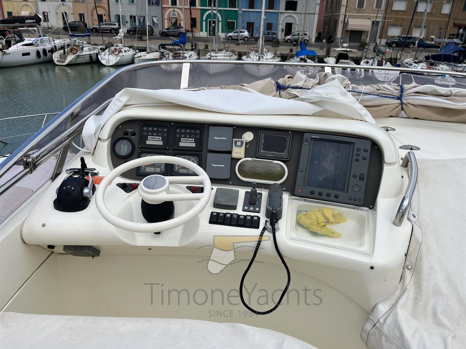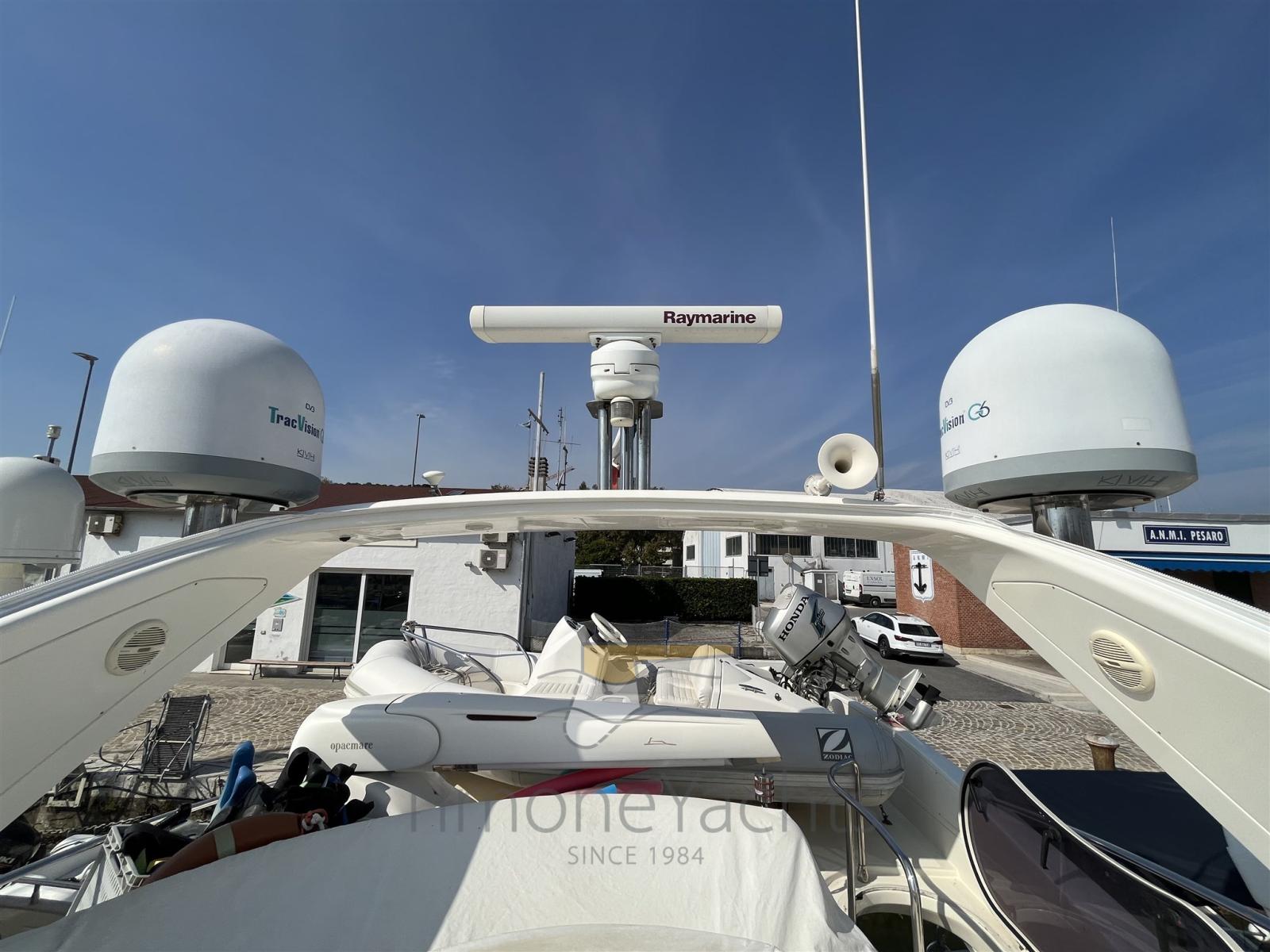Alarme moteur, Alarme de pompe de cale, Eau sous pression, Douche de cockpit, Double barre à roue, Phare de poursuite, Flaps hydrauliques, Extincteur(s) fixe(s), Indicateurs de flaps, Lavage de chaine, Éclairage de courtoisie, Passerelle (in teak), Plateforme arrière (in teak), Pompe de cale automatique, Pompe de cale manuelle, Cockpit en teck, Prise de quai, Onduleur, Rollbar, Guindeau électrique, Echelle de bain, table de cockpit, Annexe (Con fuori bordo), Filières avec sortie latèrale, Winch électrique arrière, Winch électrique avant.