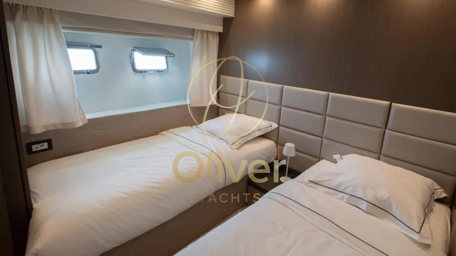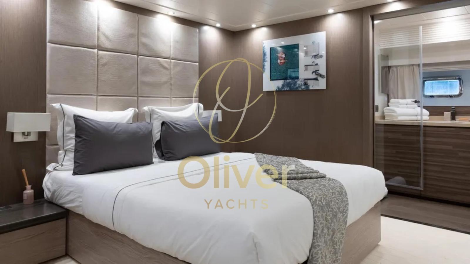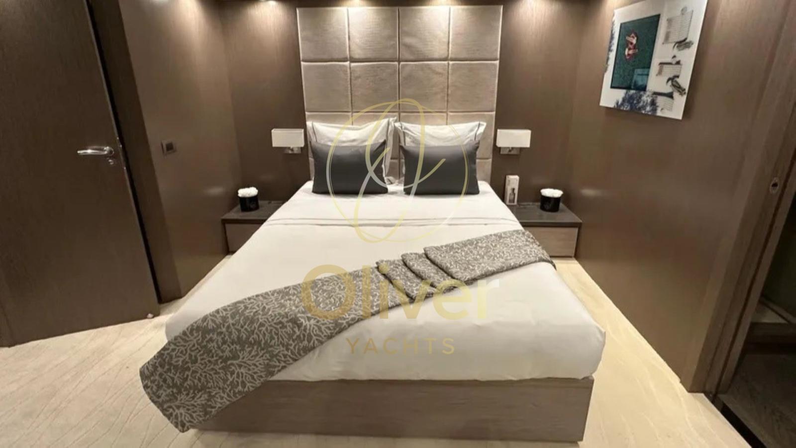 Le siège du propriétaire, situé au centre, est une véritable suite pleine poutre avec bureau, dressing et salle de bain attenante. La cabine VIP, également dotée d’une salle de bain attenante, est achevée de garde-robe sur mesure. Les deux cabines doubles proposent des lits simples, des armoires élégantes et des salles de bains attenantes avec douches. Au total, le bateau peut accueillir confortablement 9 passagers sur 10 dans 4 cabines. La zone d’équipage comprend 2 cabines avec 4 lits et des services dédiés, garantissant l’opérabilité et la discrétion.