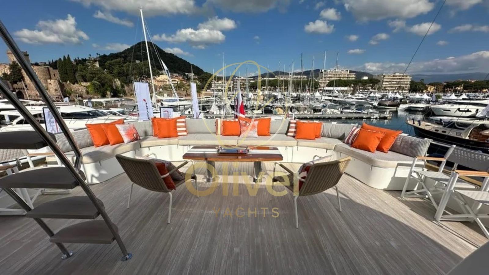 Sur le pont supérieur, un second salon offre un espace pour la détente ou les réceptions. La climatisation à cycle inversé (144 200 BTU) garantit le confort en toutes saisons. Ce yacht représente l’ultime pour ceux qui recherchent raffinement, praticité et espace, dans un environnement nautique soucieux de chaque détail.