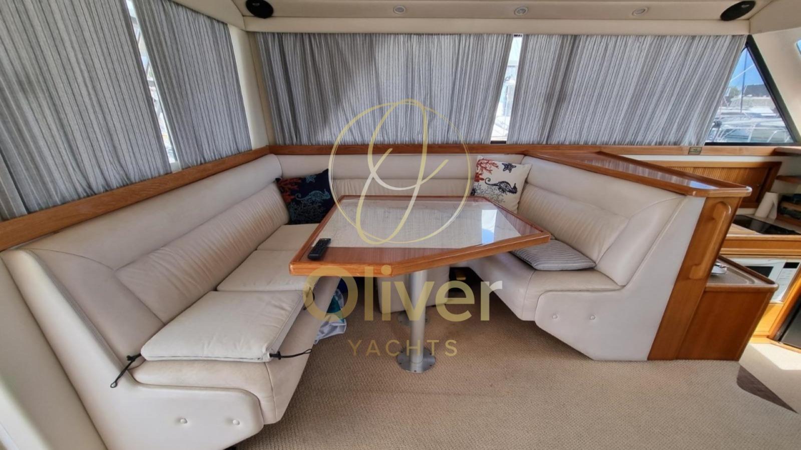 L’intérieur du Bertram 43 Cabriolet surprend par sa luminosité, son espace et sa rationalité. En entrant par le cockpit, vous entrez dans un salon accueillant à espace ouvert, meublé d’un canapé en forme de L, d’une table à manger et de meubles en bois clair, qui donne de la chaleur à l’environnement. Les grandes fenêtres latérales inondent l’espace de lumière naturelle, créant une continuité visuelle entre l’intérieur et l’extérieur.