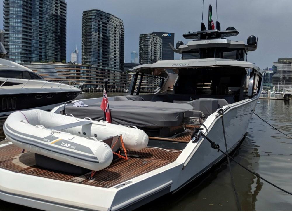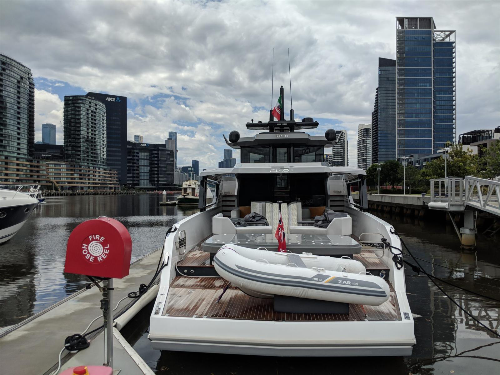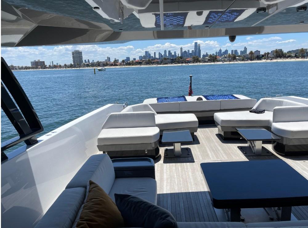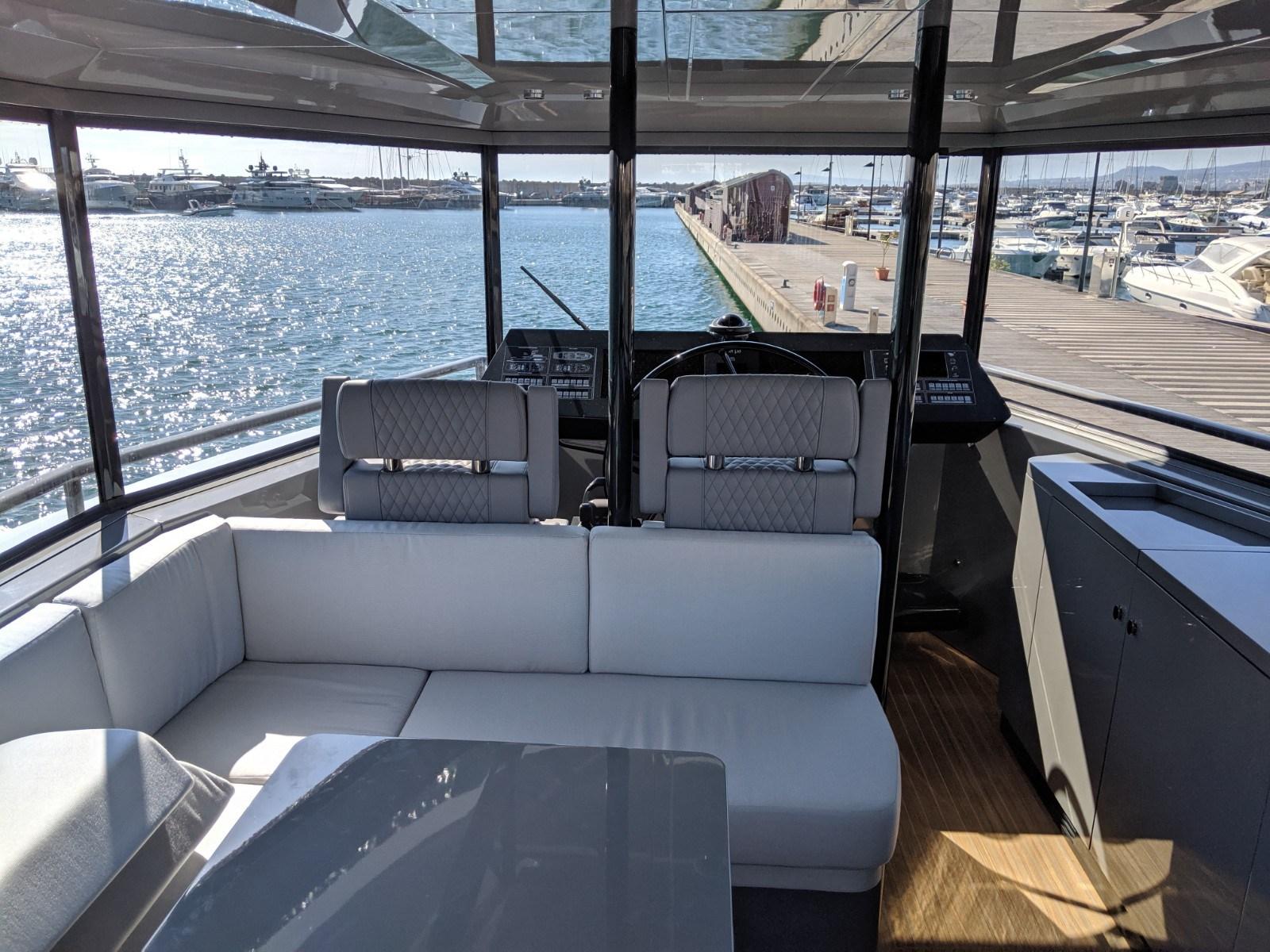Stabilisateur gyroscope Seakeeper, trappe de garage à tender à ouverture électrique, pont en teck dans le salon supérieur et la timonerie, fenêtres électriques dans la timonerie, porte verrouillable solide vers la timonerie