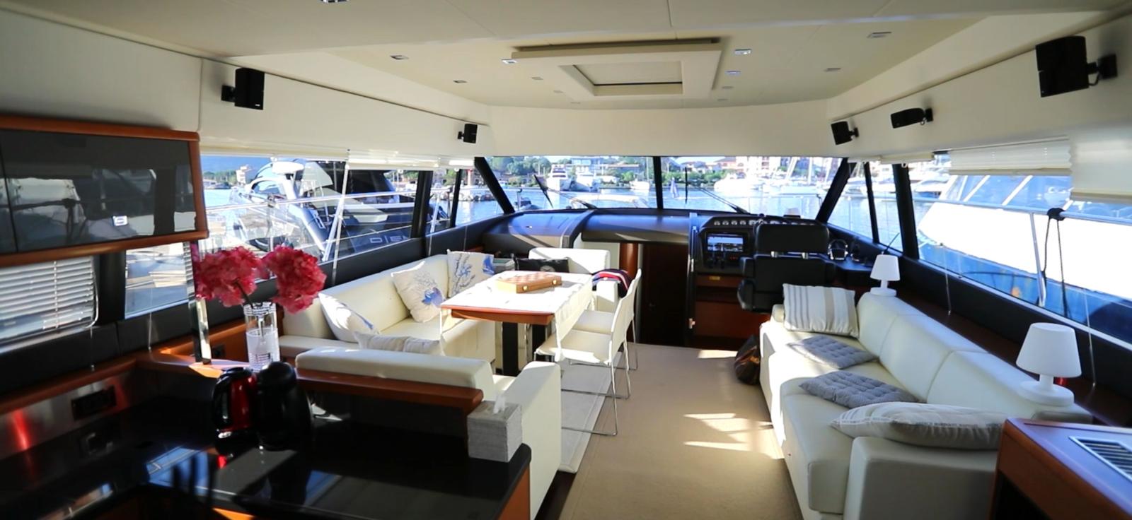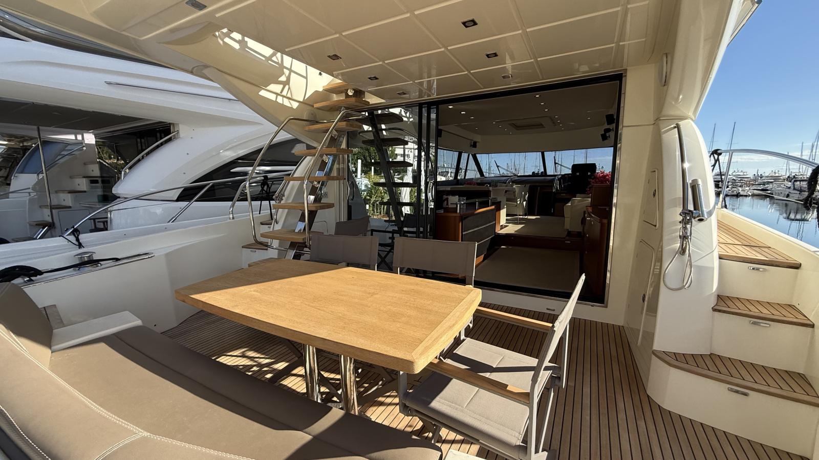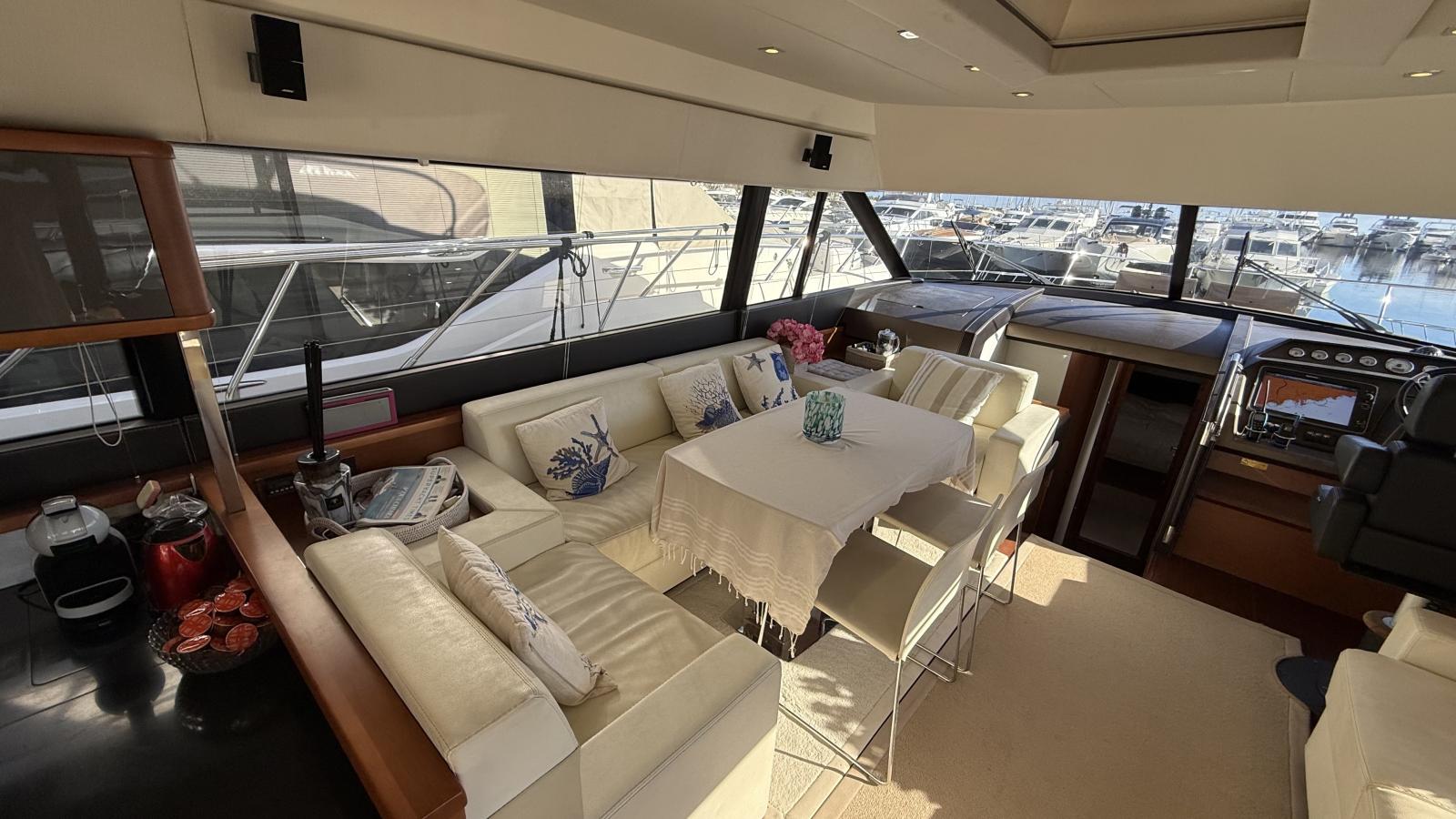 Le salon, baigné de lumière naturelle grâce à des vitrages panoramiques, se connecte harmonieusement à la cuisine arrière et au cockpit, créant un espace de vie intérieur-extérieur élégant. Le flybridge est équipé d'un bar humide, de bains de soleil, d'un coin repas et d'une deuxième station de pilotage.