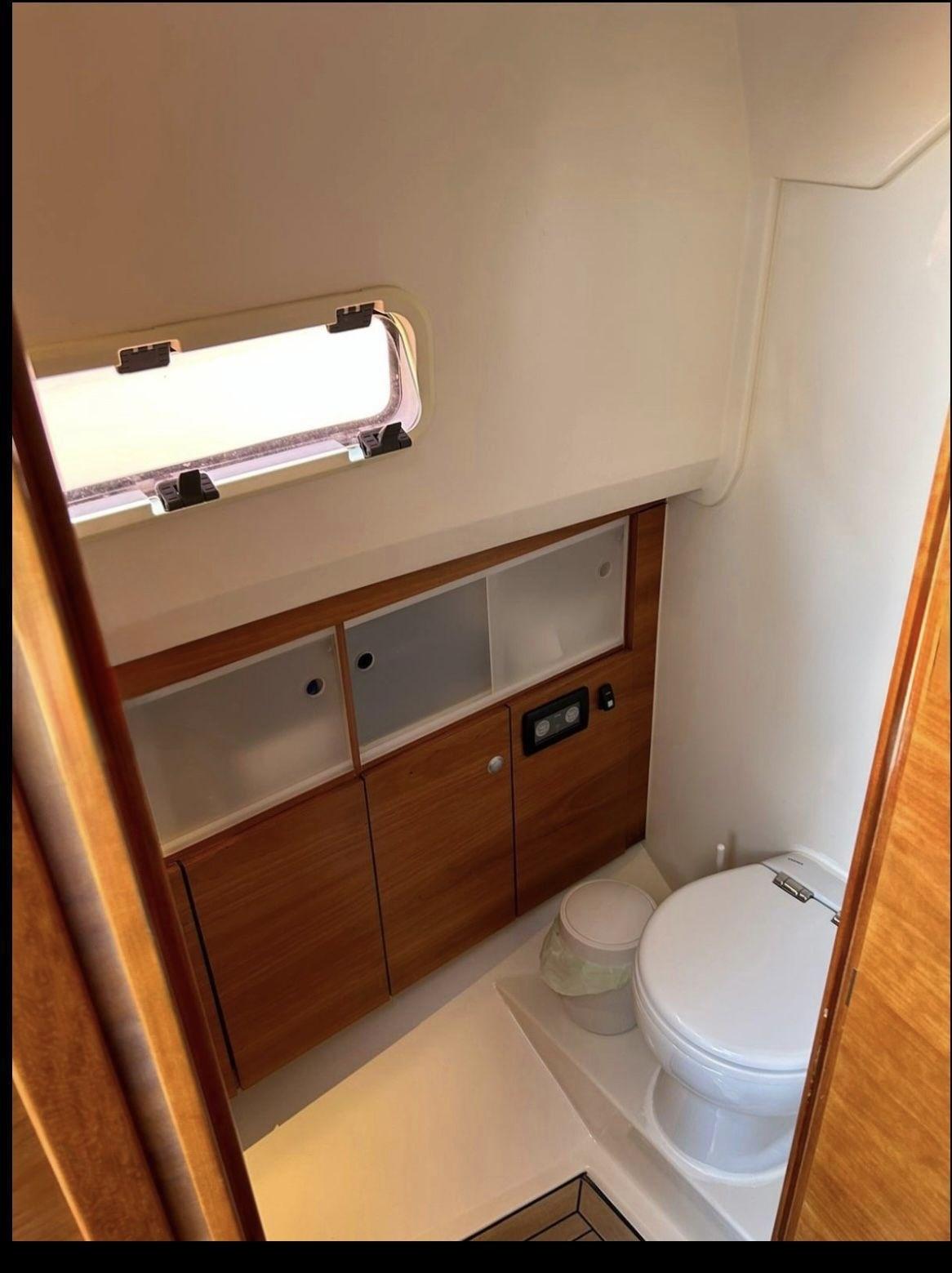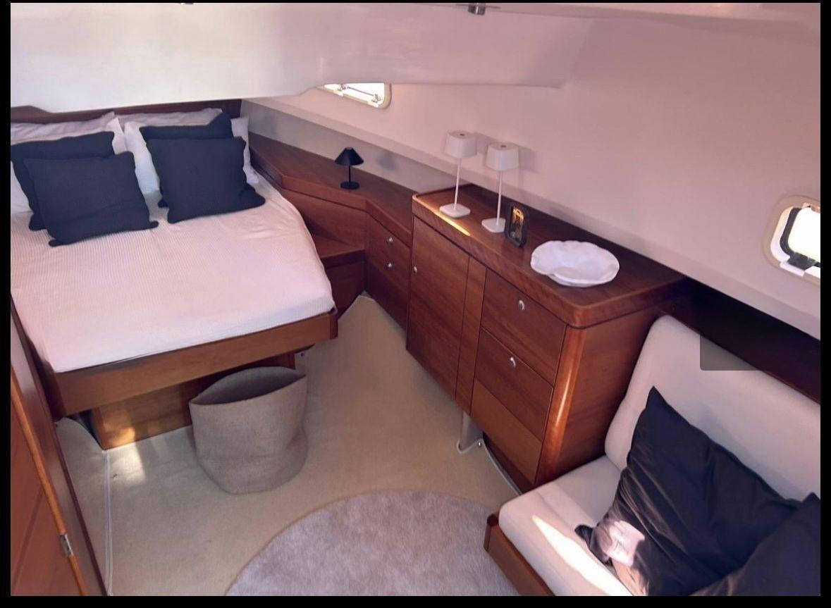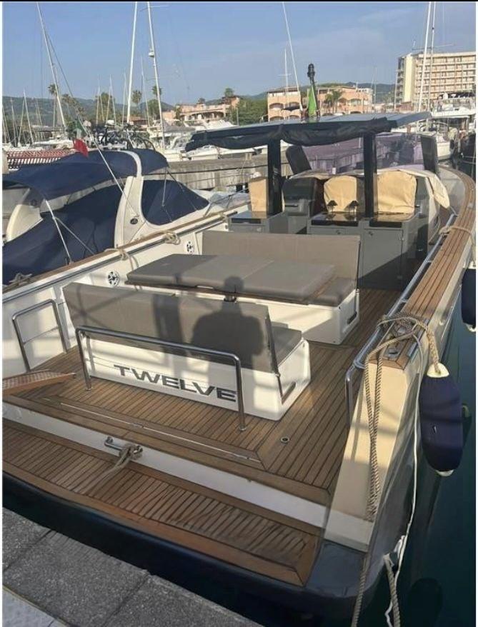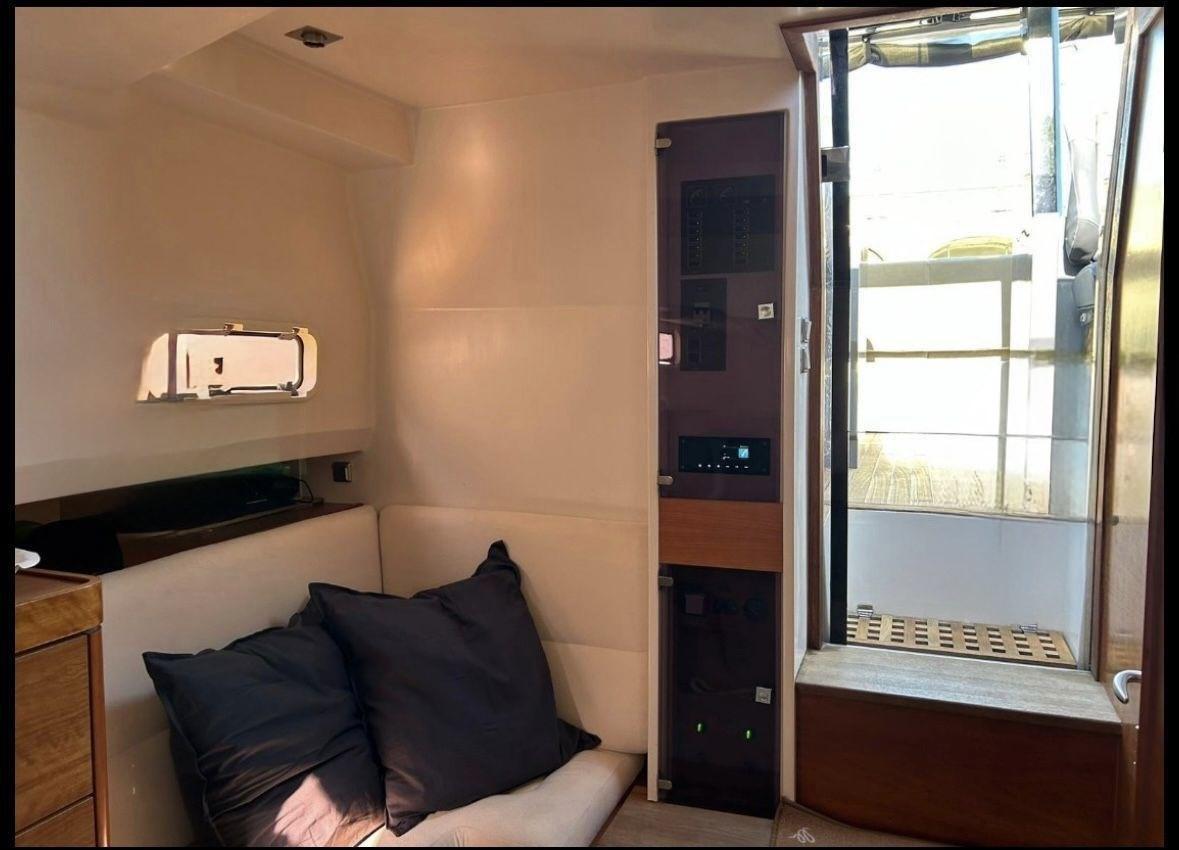 Alarme moteur, Alarme de pompe de cale, Ancre (10kg + 50m SS chain with hydraulic arm system), Eau sous pression, 6 Batteries (2x90 Ah (engines) + 4x160 Ah AGM (service)), 6 Taquets pliants, Système de vidange, Passavant en teck, Douche de cockpit, Flaps électriques (Volvo trim tabs), Extincteur(s) fixe(s) (firebuoy), Indicateurs de flaps, Lavabo dans le cockpit, Éclairage de courtoisie ((Option)), Spots sous-marins ((Option)), Plateforme arrière (extended and fixed), 2 Pompe de cale automatique, Porte latérale (sliding), Cockpit en teck, Prise de quai, Guindeau électrique, Echelle de bain, table de cockpit (on electric pedestal convetible into sunpad), 2 Filières avec sortie latèrale, Corne, T-Top (painted Jet black).