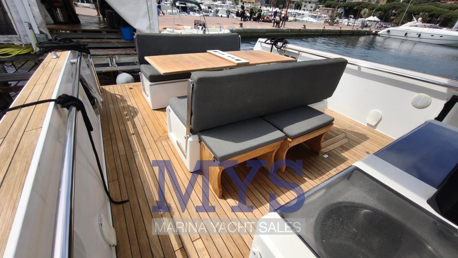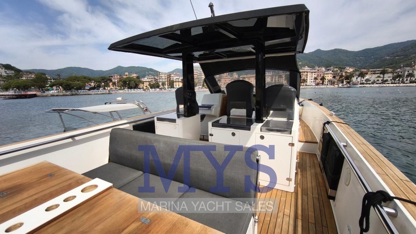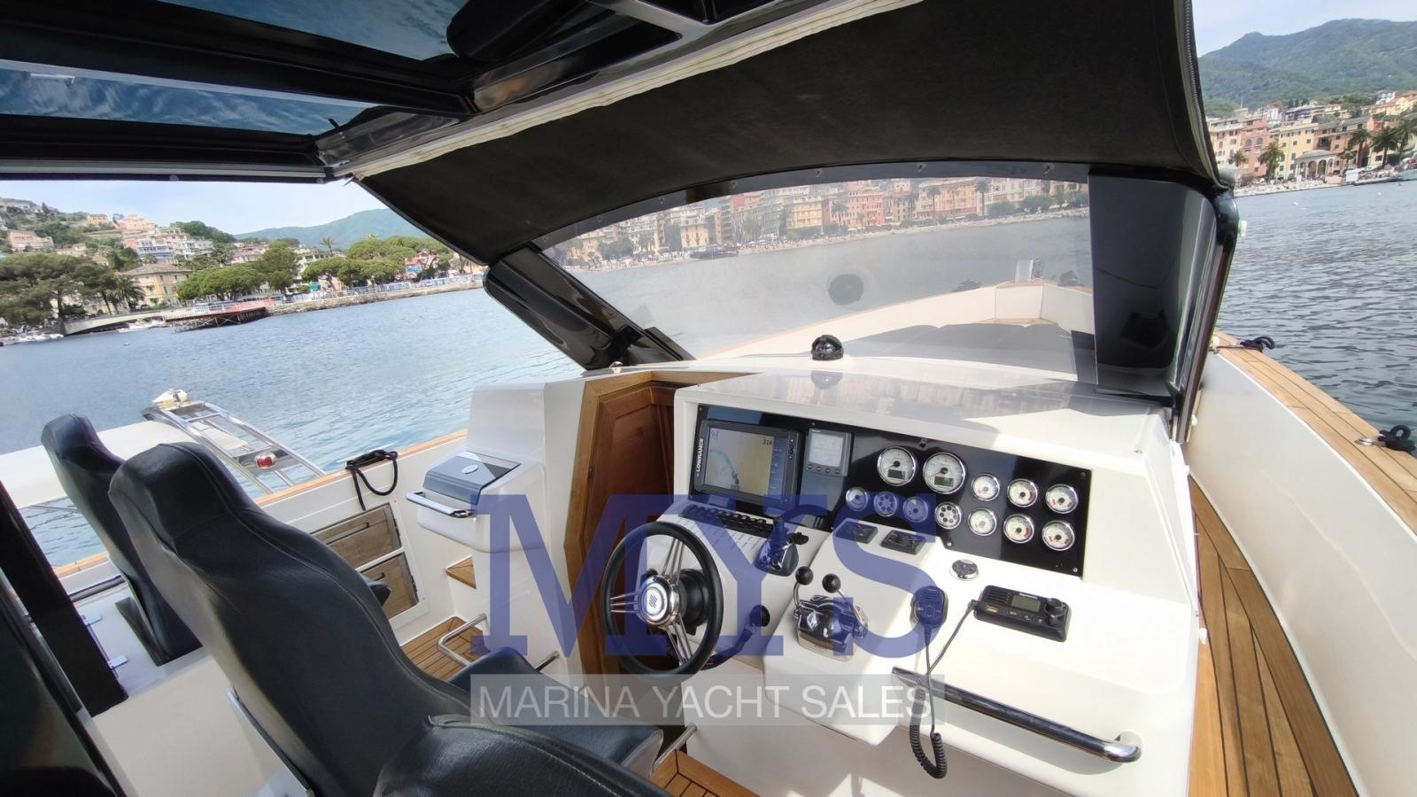 Alarme gaz, Alarme moteur, Alarme de pompe de cale, Ancre (10 kg + 70 mt di catena), Ouverture du compartiment moteur électrique, Eau sous pression, Batteries (4x145Ah per servizi + 2x100Ah per motore tutte 2024), Système de vidange, Passavant en teck, Douche de cockpit, Flaps hydrauliques, Lavabo dans le cockpit, Éclairage de courtoisie, Passerelle (non funzionante), Plateforme arrière (in teak), 2 Pompe de cale automatique, Pompe de cale manuelle, Pont en teck, Porte latérale, Cockpit en teck, Prise de quai, Guindeau électrique, Echelle de bain, table de cockpit (abbattibile), Corne, T-Top (rigido con parabrezza panoramico), Pont en teck.