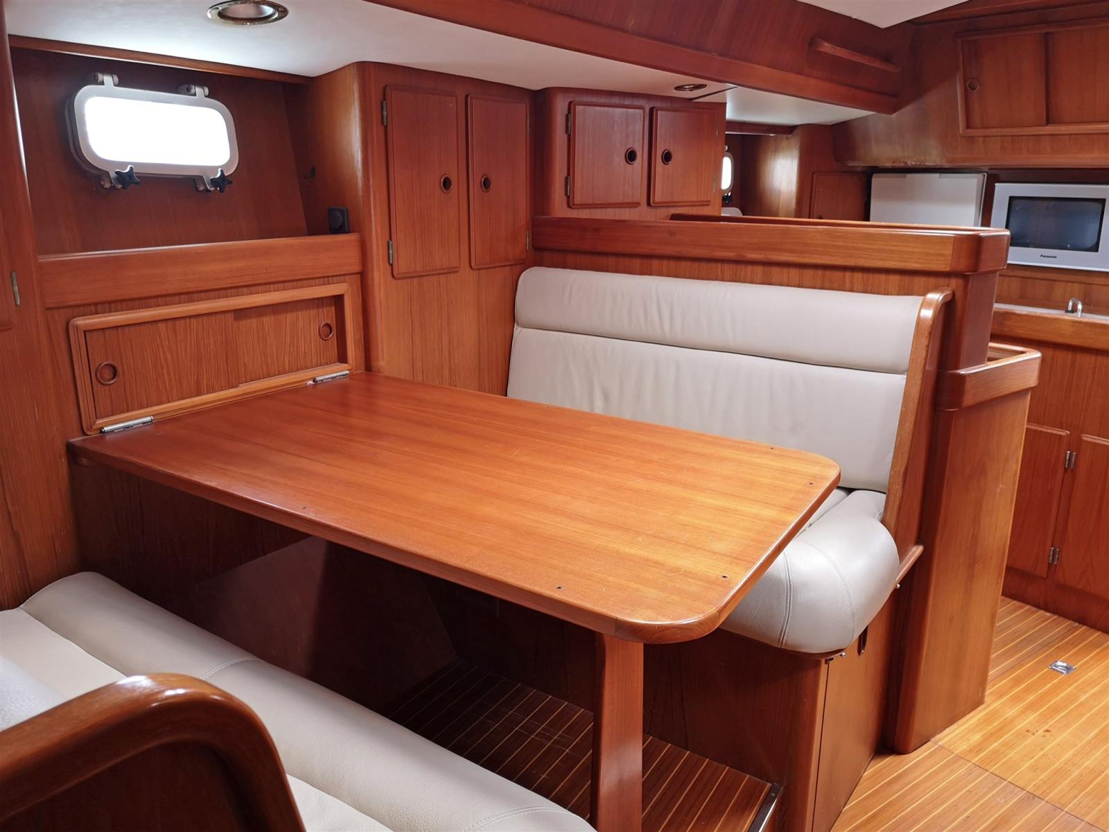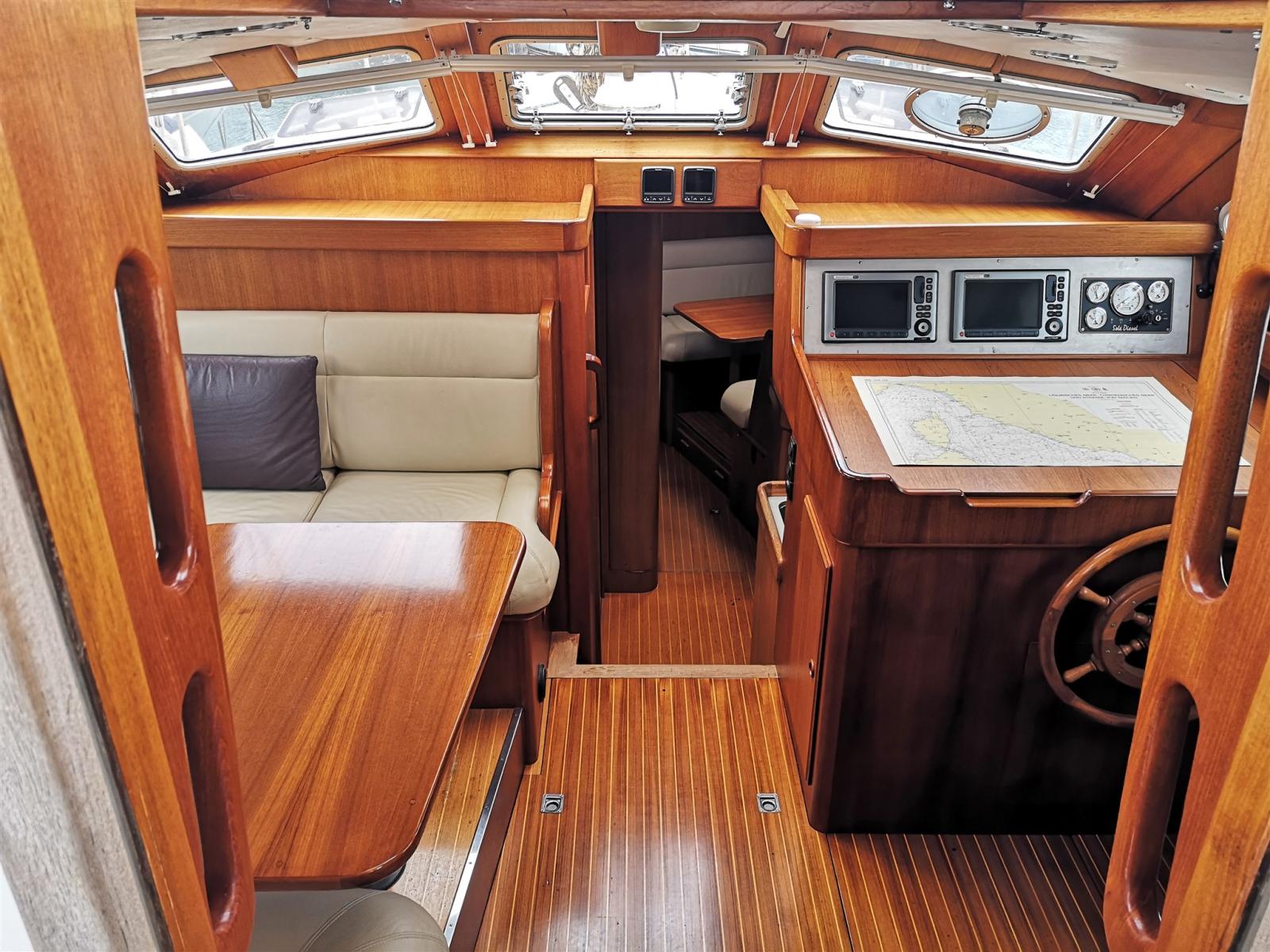 Salon dinette avec table en C et canapé, poste de pilotage opposé et table à cartes