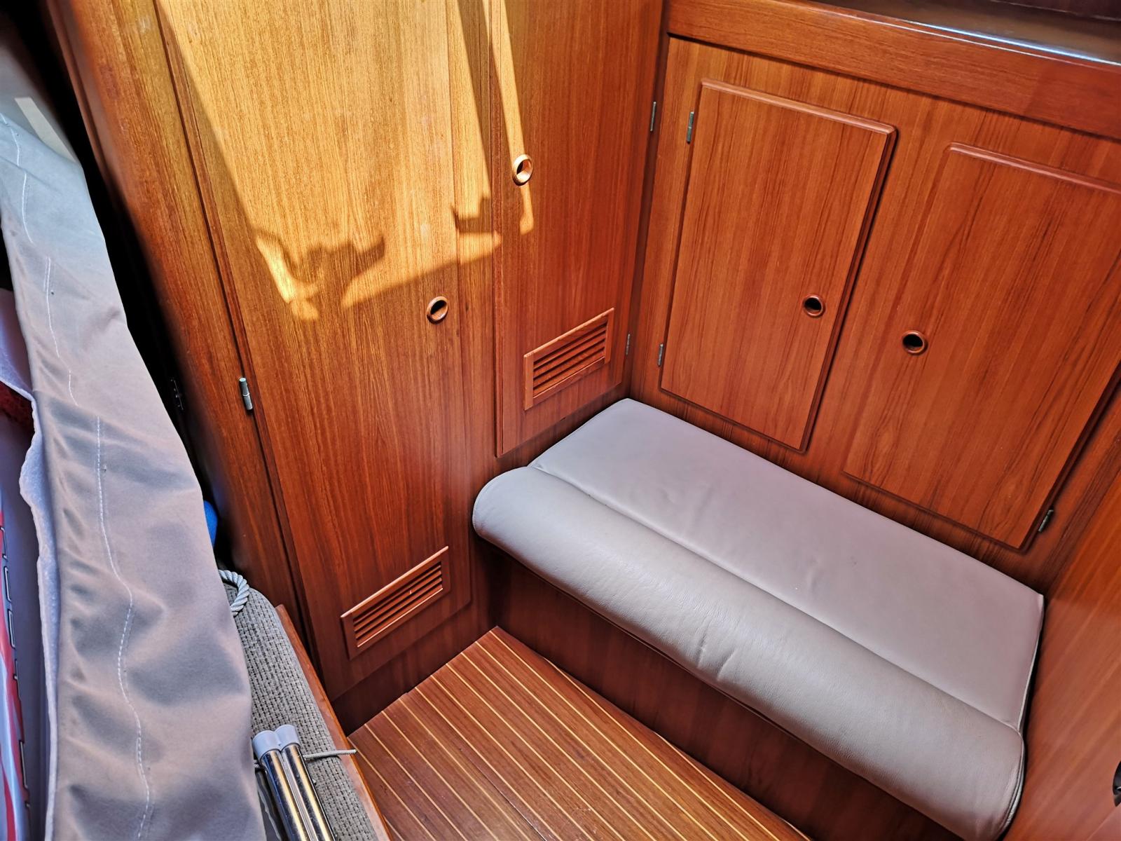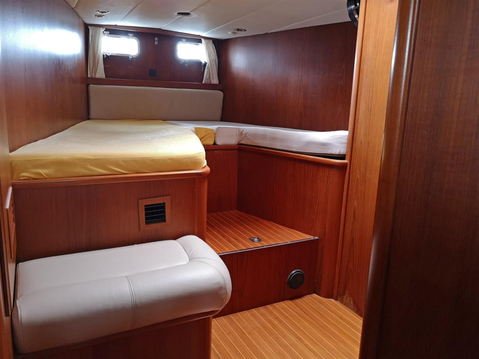 Cabine avant avec lit superposé côté gauche, canapé et armoires
