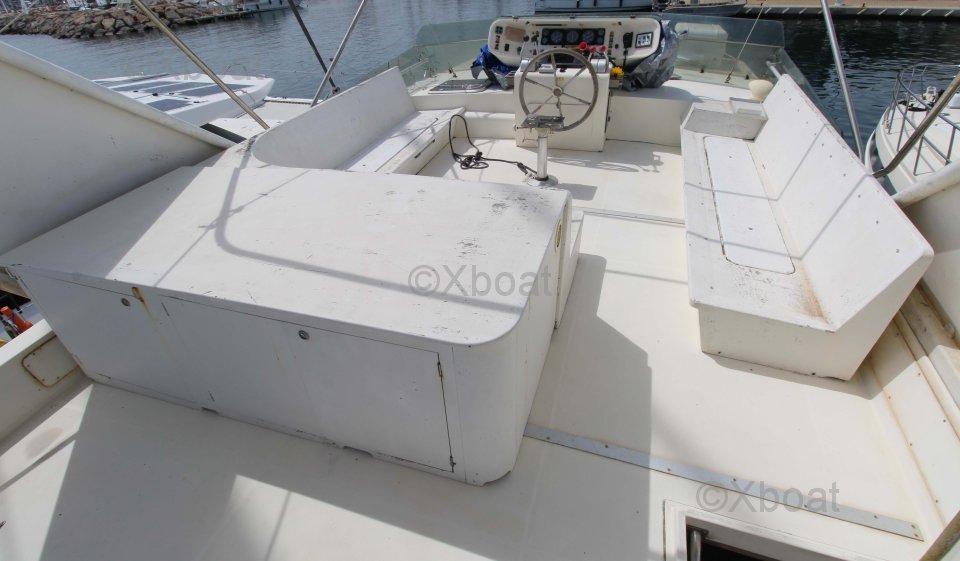 Cette vedette GUY COUACH 1800 offre un grand confort à la mer. Elle dispose d'un poste de pilotage au fly, avec un grand espace de vie. Le salon de pont ouvre sur le cockpit par une large baie vitrée. À l'avant, une table à manger fait face à la cuisine, le tout au niveau du poste de pilotage intérieur.
