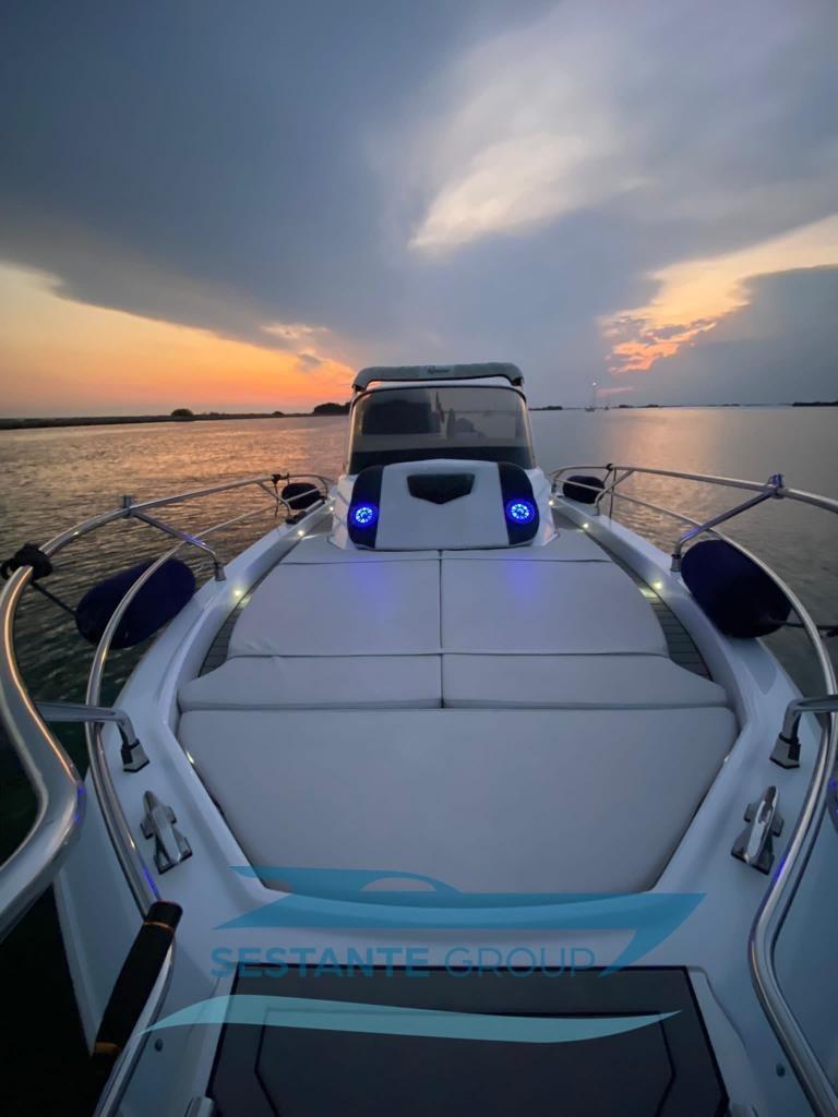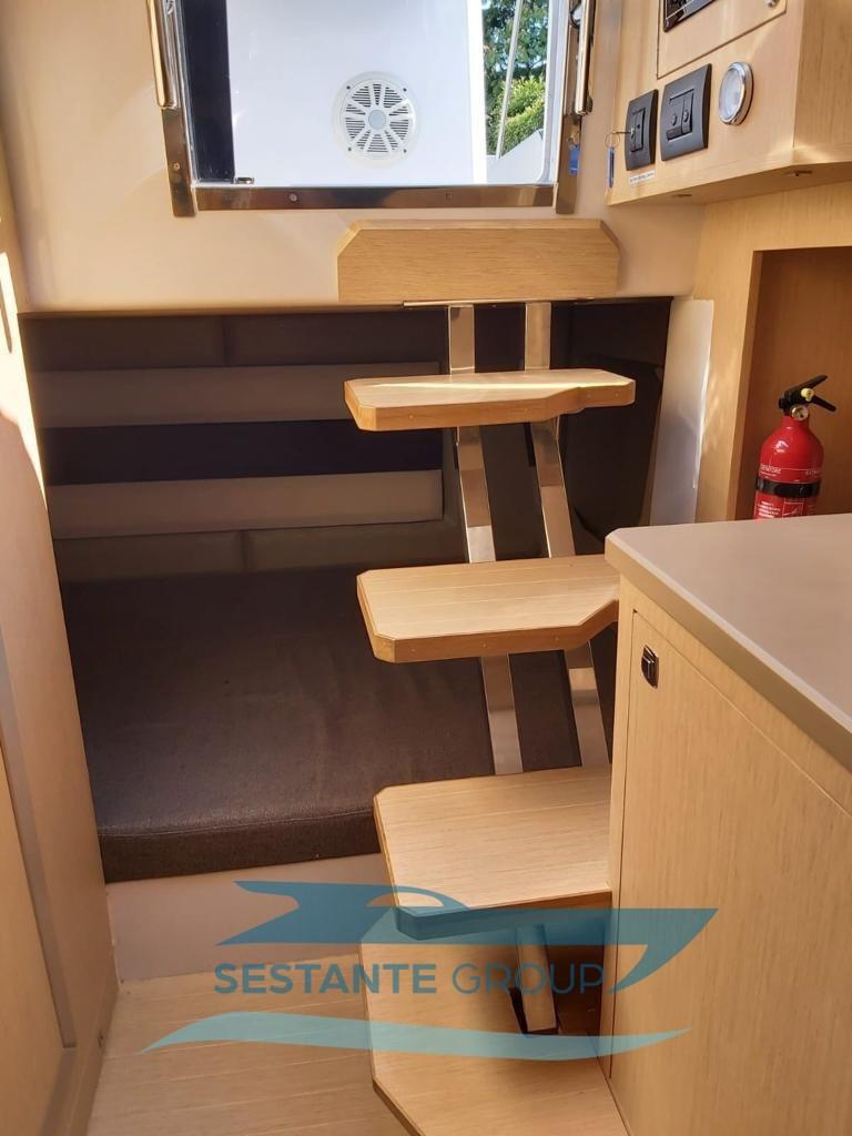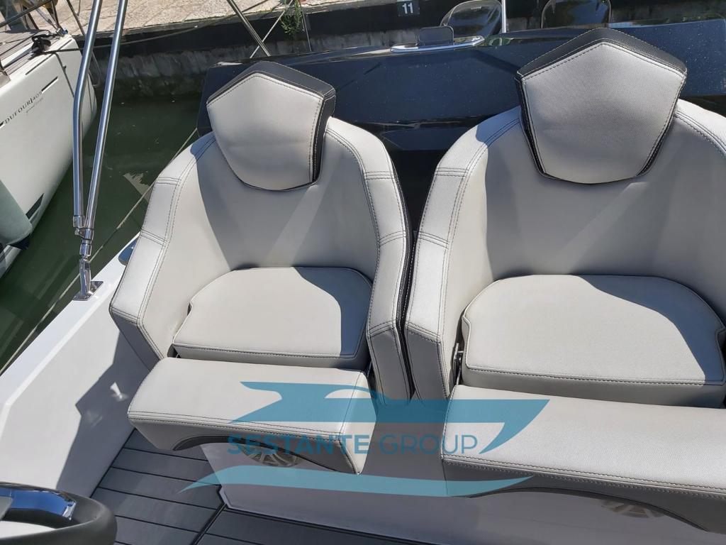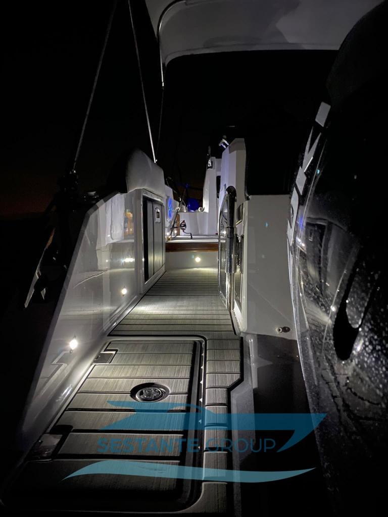 Alarme moteur, Eau sous pression, 3 Batteries (100 Ah), Couleur spéciale, Douche de cockpit, Lavabo dans le cockpit, Éclairage de courtoisie, Spots sous-marins, Pompe de cale automatique, Pont en teck (Seadek), Porte latérale, Cockpit en teck (Seadek), Prise de quai, Guindeau électrique, Echelle de bain, table de cockpit, Table pliante de salon, Corne.