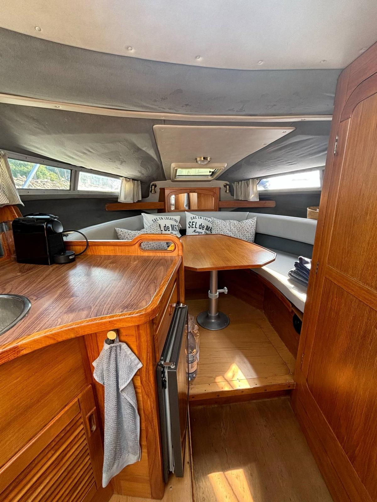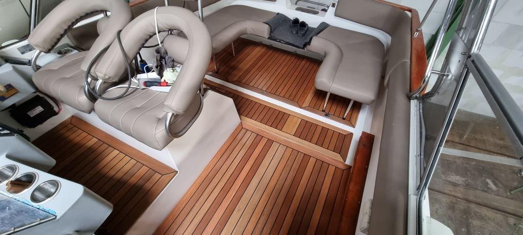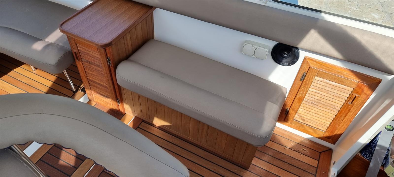 Chargeur de batterie (2024), Indicateurs de flaps (Bennet electric), Plateforme arrière, Cockpit en teck, Prise de quai, Guindeau électrique (Lofrance), table de cockpit.