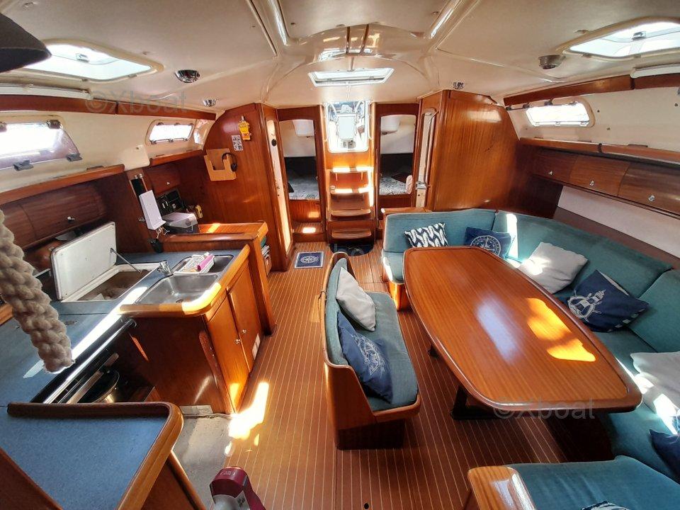 Bateau très spacieux et confortable, performant, très bien équipé, prêt pour le long voyage. Ce bateau est grand, très grand, et on s’y perdrait presque. Le cockpit est un véritable salon en plein air, et depuis les deux barres à roues, on a l’impression de barrer un 60 pieds. A l’intérieur, rien à dire, tout y est, confort, luminosité, espace, le tout couronné par une excellente ventilation.