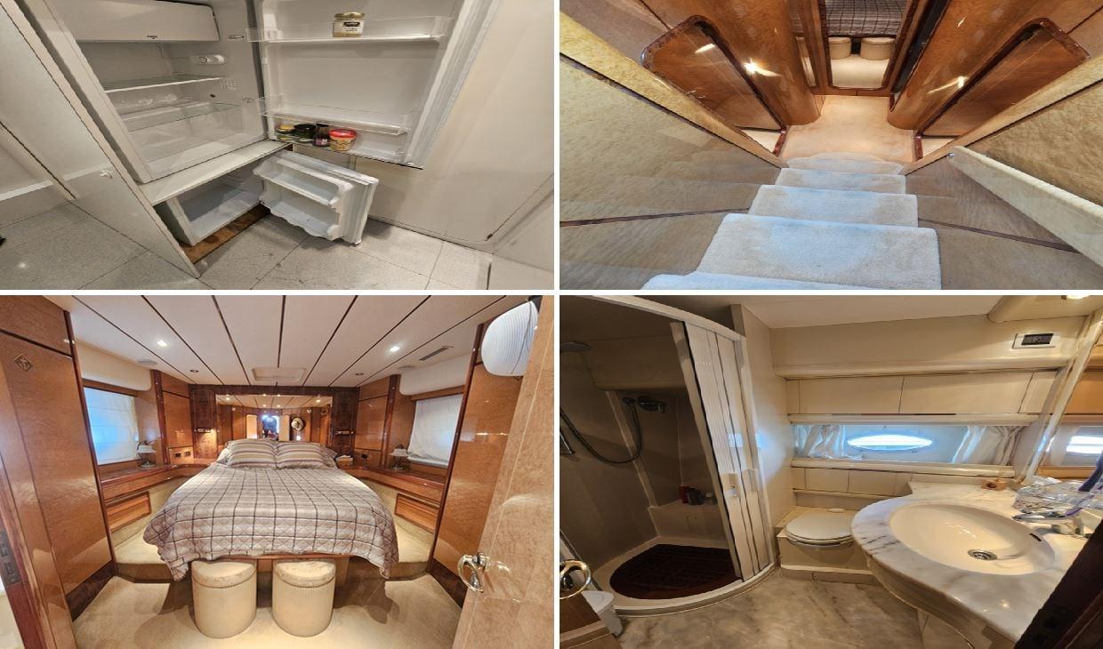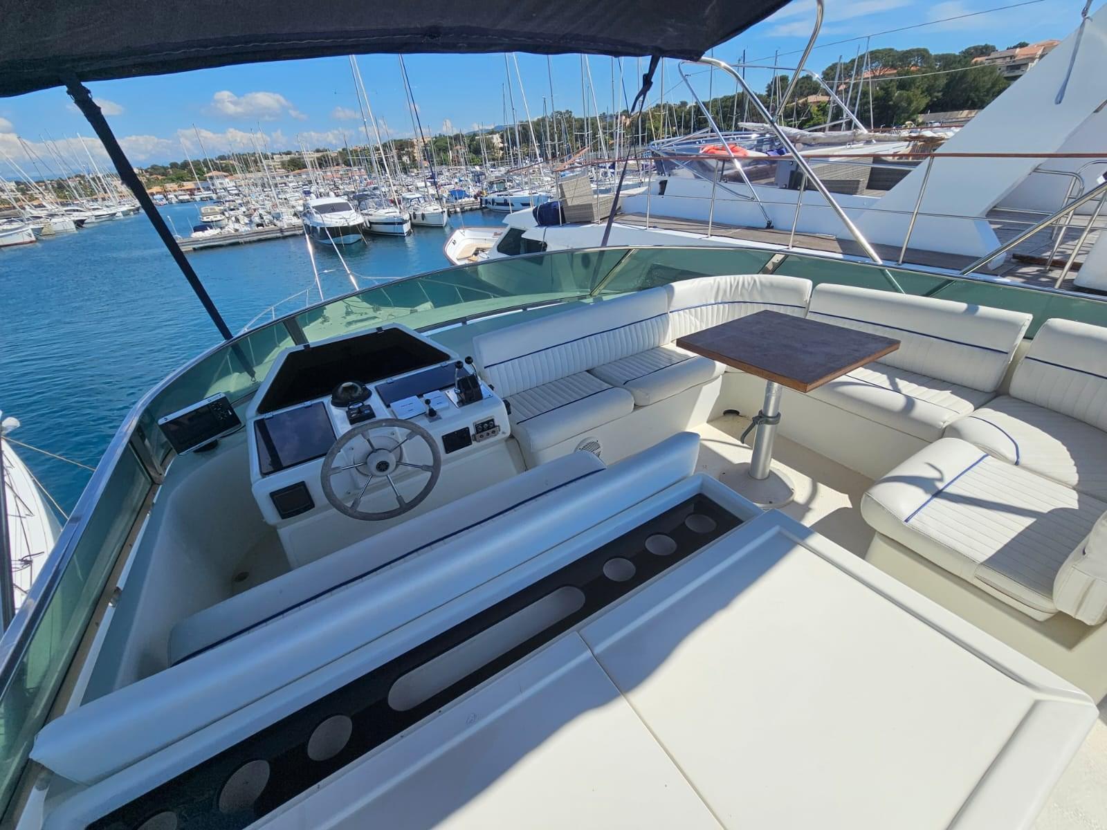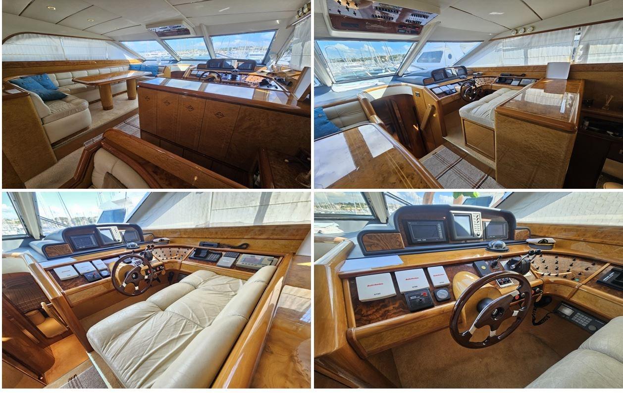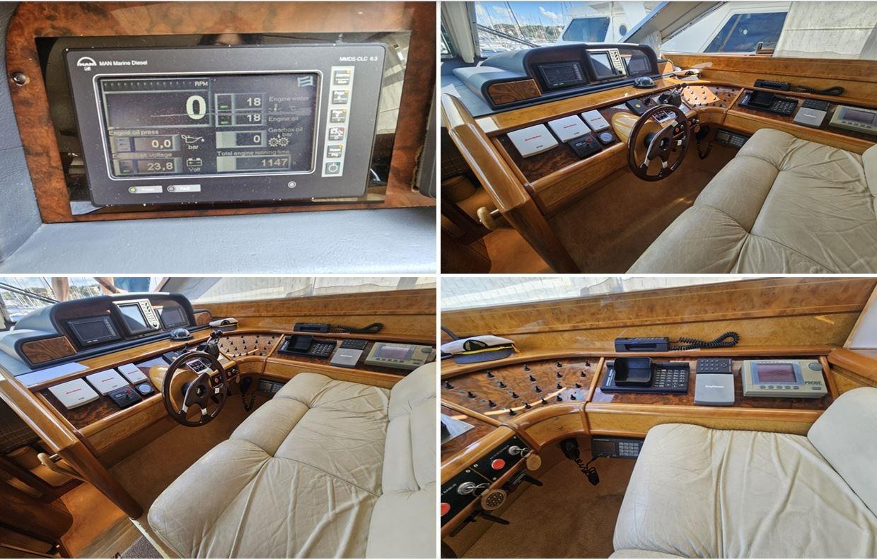 Alarme moteur, 8 Batteries, Douche de cockpit, Double barre à roue, Grue de flybridge, Passerelle, Cockpit en teck, Prise de quai, Connexion eau sous pression à quai, Guindeau électrique, Echelle de bain, table de cockpit, Winch électrique arrière.