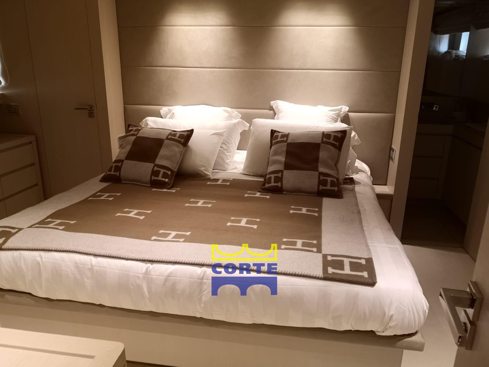 Alarme moteur, Alarme de pompe de cale, Ligne d'arbre de rechange, Eau sous pression, Douche de cockpit, Double barre à roue, Phare de poursuite, Flaps électriques, Bossoirs, Bossoirs pour annexe, Grue de flybridge, Extincteur(s) fixe(s), Éclairage de courtoisie, Passerelle (elettroidraulica a scomparsa), Plateforme arrière (di poppa), Pompe de cale automatique, Porte latérale, Porte latérale, Cockpit en teck, Prise de quai, Connexion eau sous pression à quai, Répétiteur électronique, Guindeau électrique, Echelle de bain, Stabilisateurs (Zero Speed), table de cockpit, Annexe, Corne, Winch électrique arrière, Winch électrique avant.