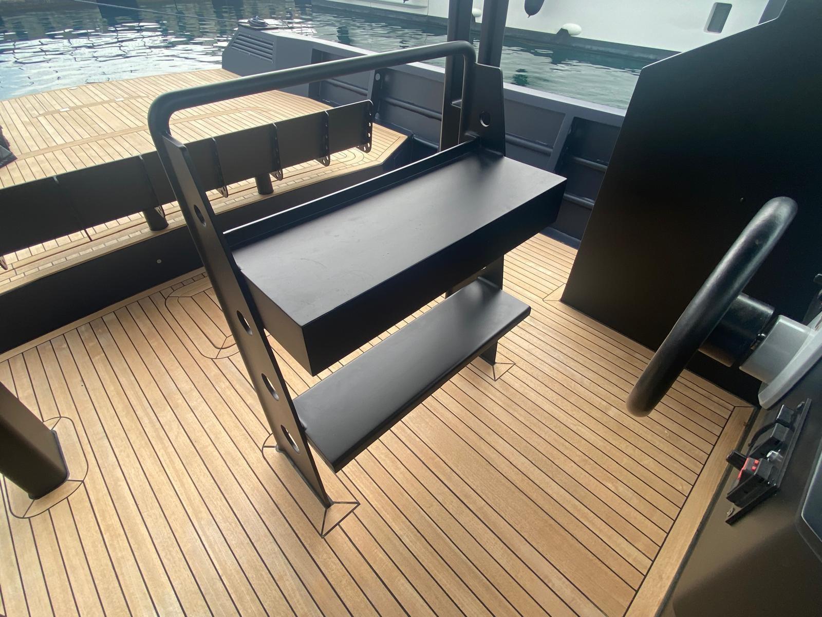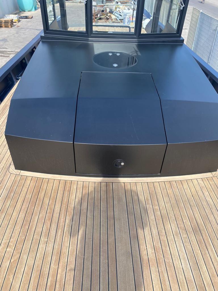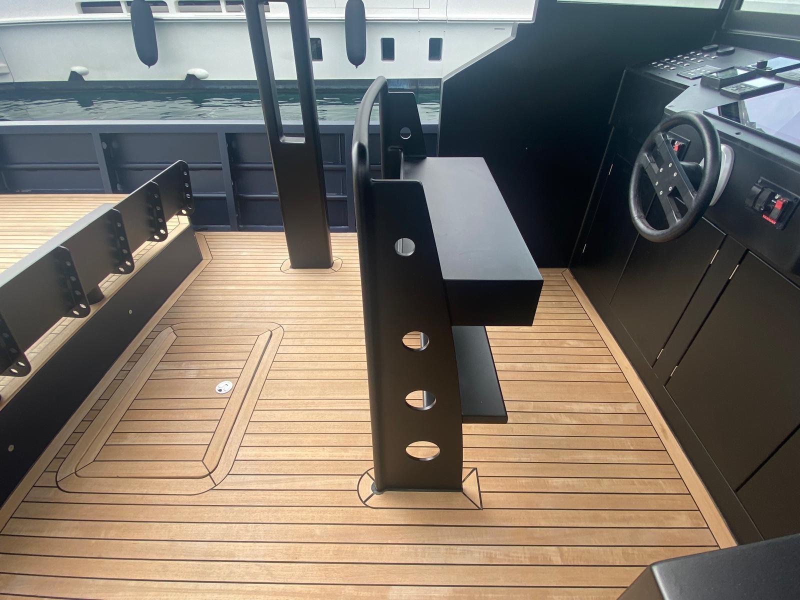Le cahier des charges de ce projet exigeait d’excellentes performances en cas de mer agitée, une robustesse de construction, une facilité d’entretien et un souci du détail obsessionnel. Coque bleu foncé avec tambours noirs. Coque peinte 2020. Peinture du plat-bord interne et de la superstructure 2022. traceur de cartes 2021.