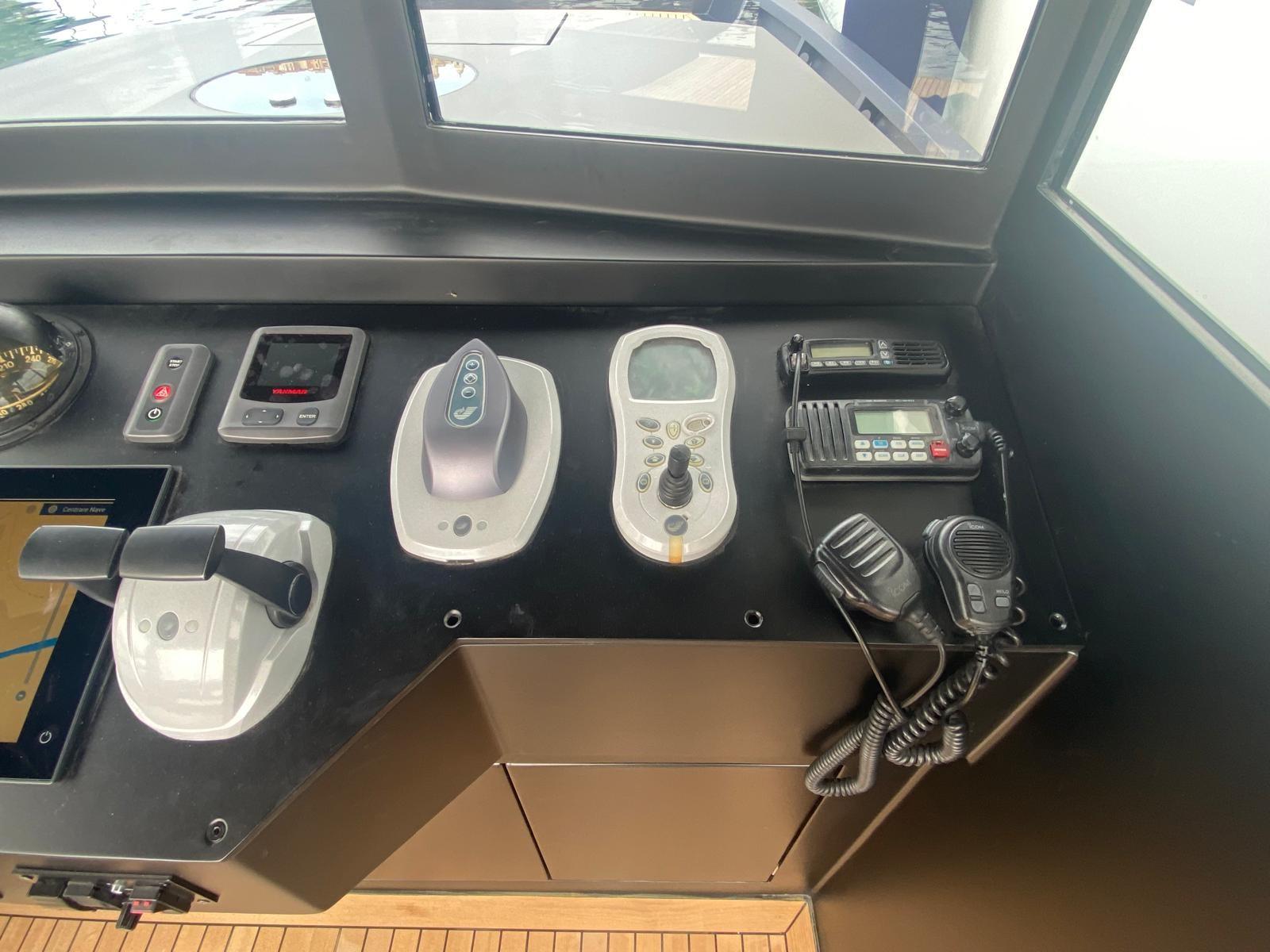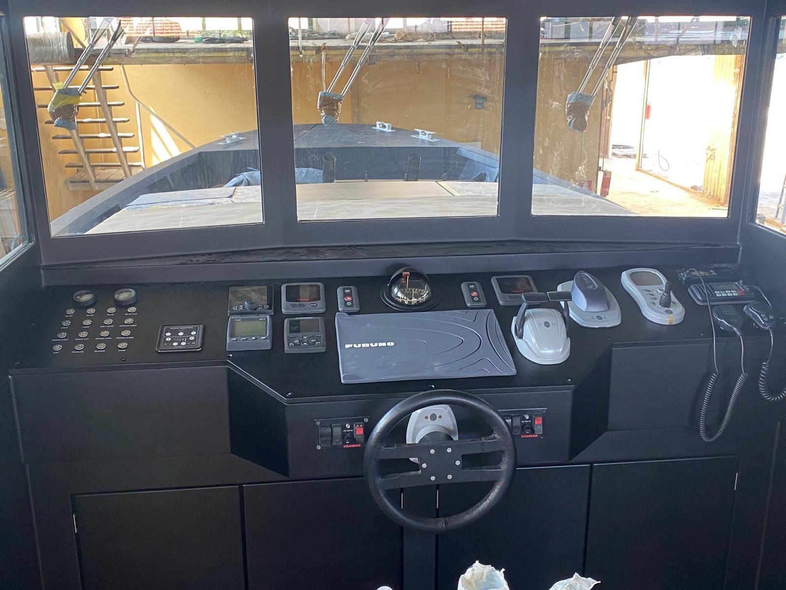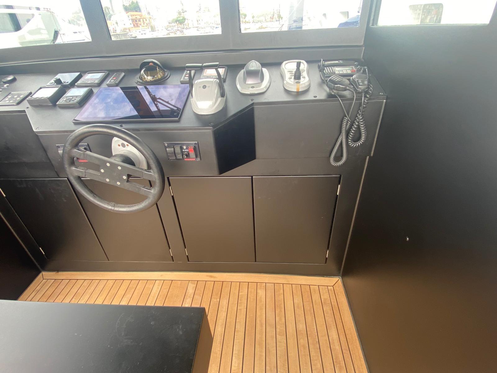 Le cahier des charges de ce projet exigeait d’excellentes performances en cas de mer agitée, une robustesse de construction, une facilité d’entretien et un souci du détail obsessionnel. Coque bleu foncé avec tambours noirs. Coque peinte 2020. Peinture du plat-bord interne et de la superstructure 2022. traceur de cartes 2021.