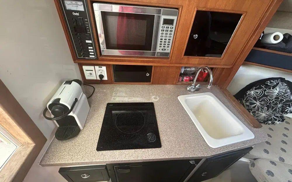 Coin cuisine : évier, réfrigérateur, micro-ondes, plaque, cafetière Krups
