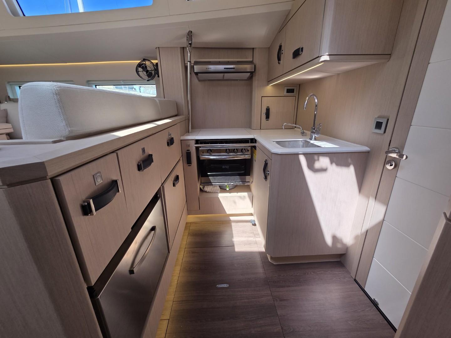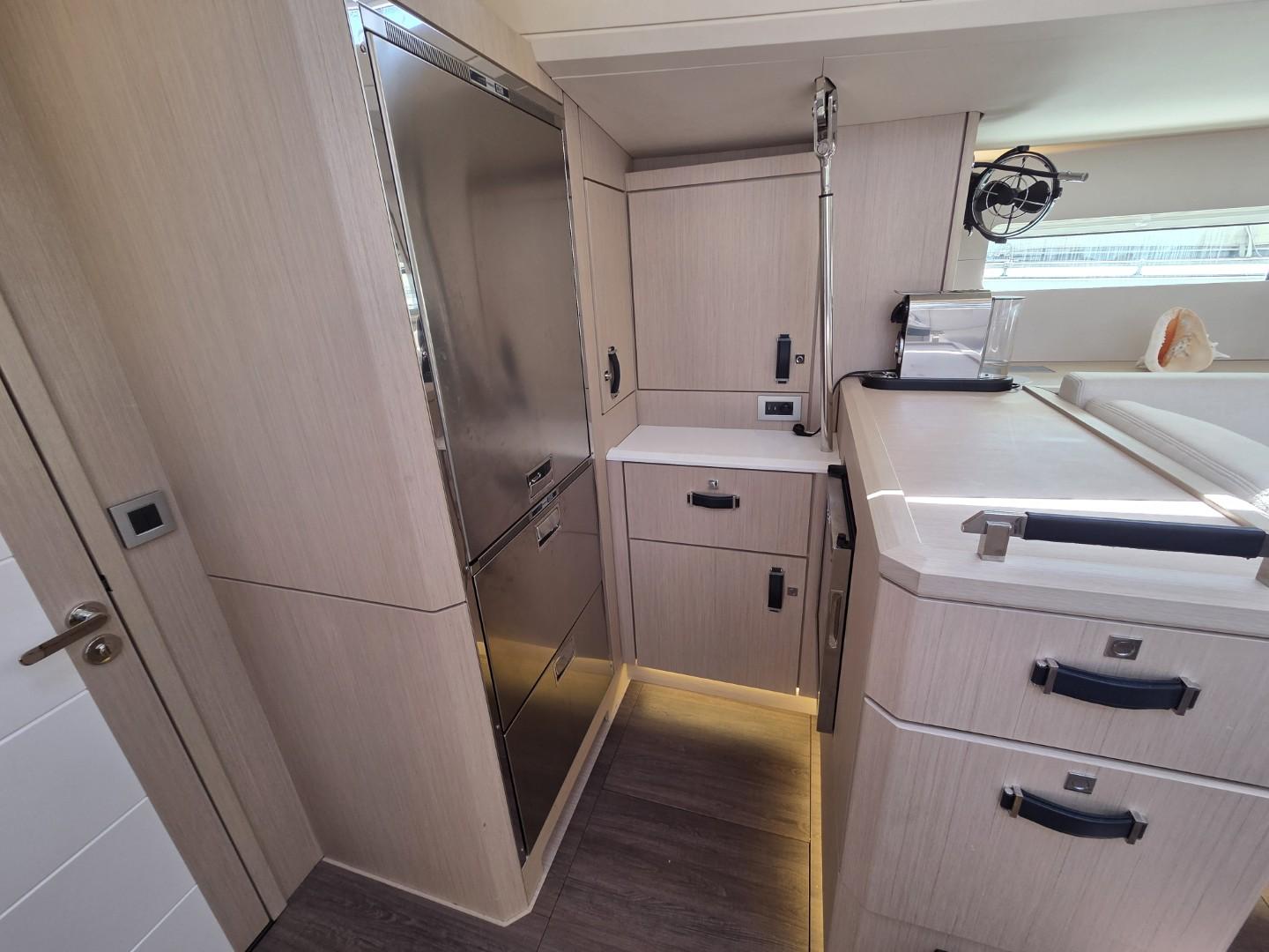 Réfrigérateur intérieur 300L avec partie congélateur, machine à glaçons, lave linge et sèche linge, lave vaisselle, machine à café Nespresso, plaques électriques induction, cave à vin Winecooler 24V 12 bouteilles.