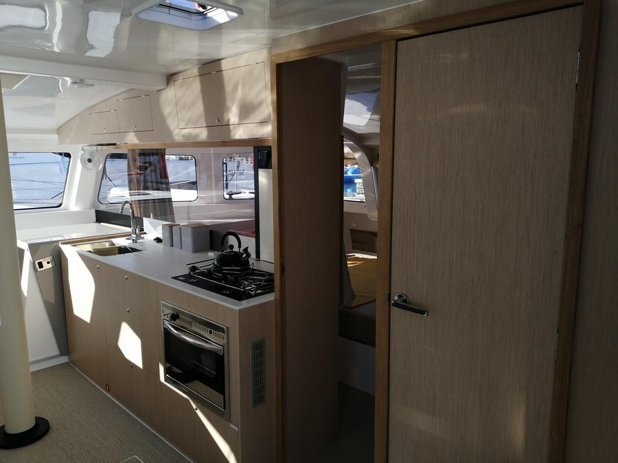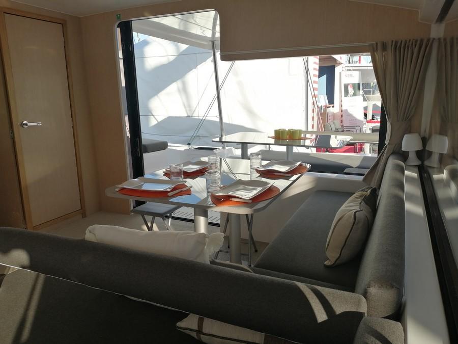 À l'intérieur, le NEEL 43 se distingue par ses espaces de vie généreux, ses larges baies vitrées et ses hublots offrant une vue imprenable sur l'environnement. L'aménagement intérieur est optimisé pour offrir un confort maximal et une simplicité d’entretien appréciée des propriétaires voyageant en autonomie.