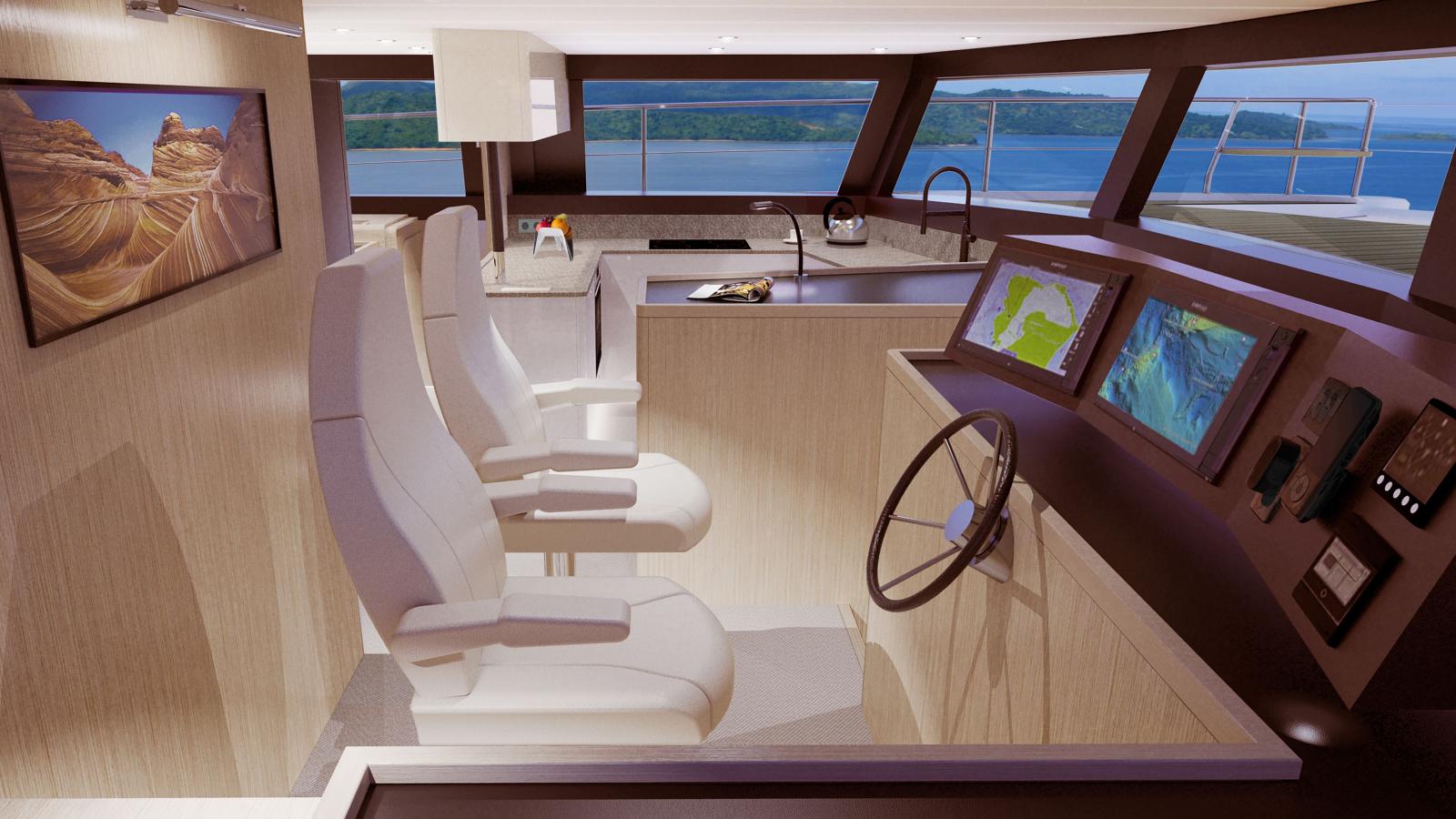Le cockpit est spacieux et accueillant. De bains de soleil permettent de