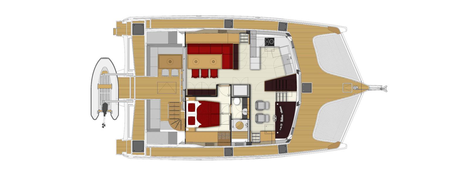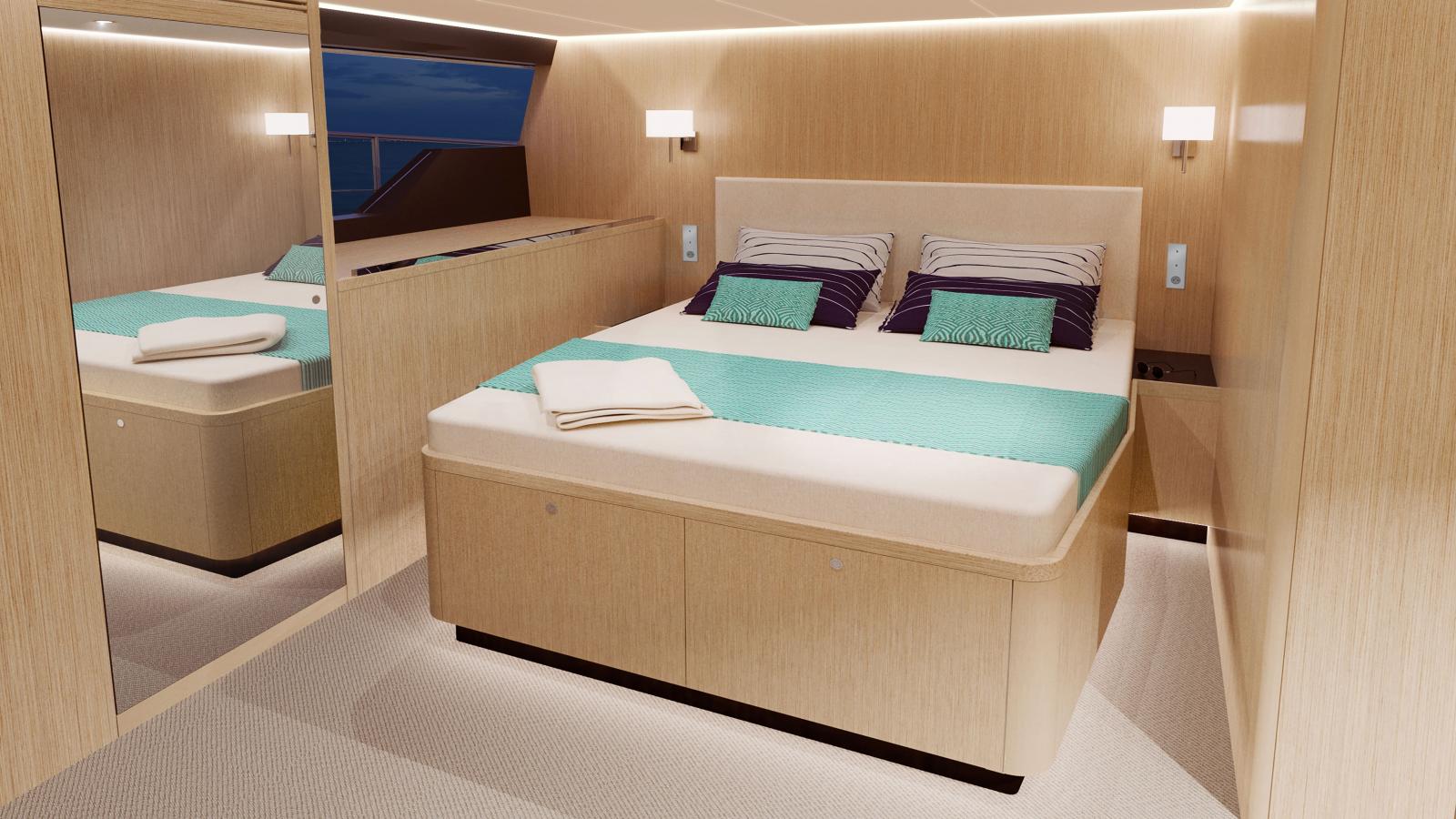 L'aménagement intérieur comprend une cabine propriétaire de plain-pied et quatre cabines doubles avec douches et toilettes privatives, offrant confort et intimité, ainsi qu'une vue panoramique à 270° sur l'horizon.