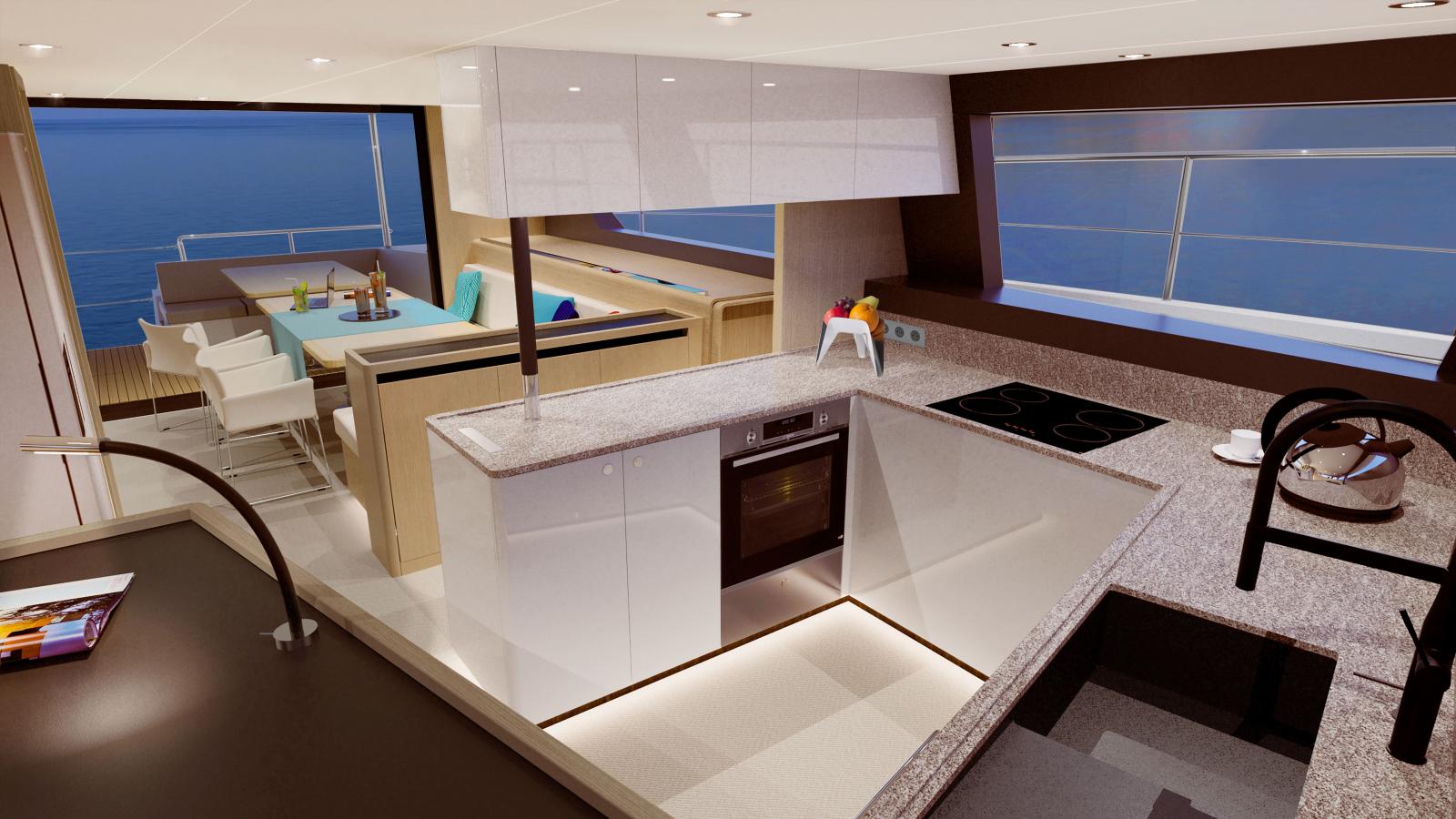 L'entretien est simplifié grâce à une cale technique spacieuse. Le flybridge propose un espace de plus de 20 m², avec des passavants larges pour la sécurité et des trampolines pour la détente. Le cockpit est spacieux avec une vue panoramique.