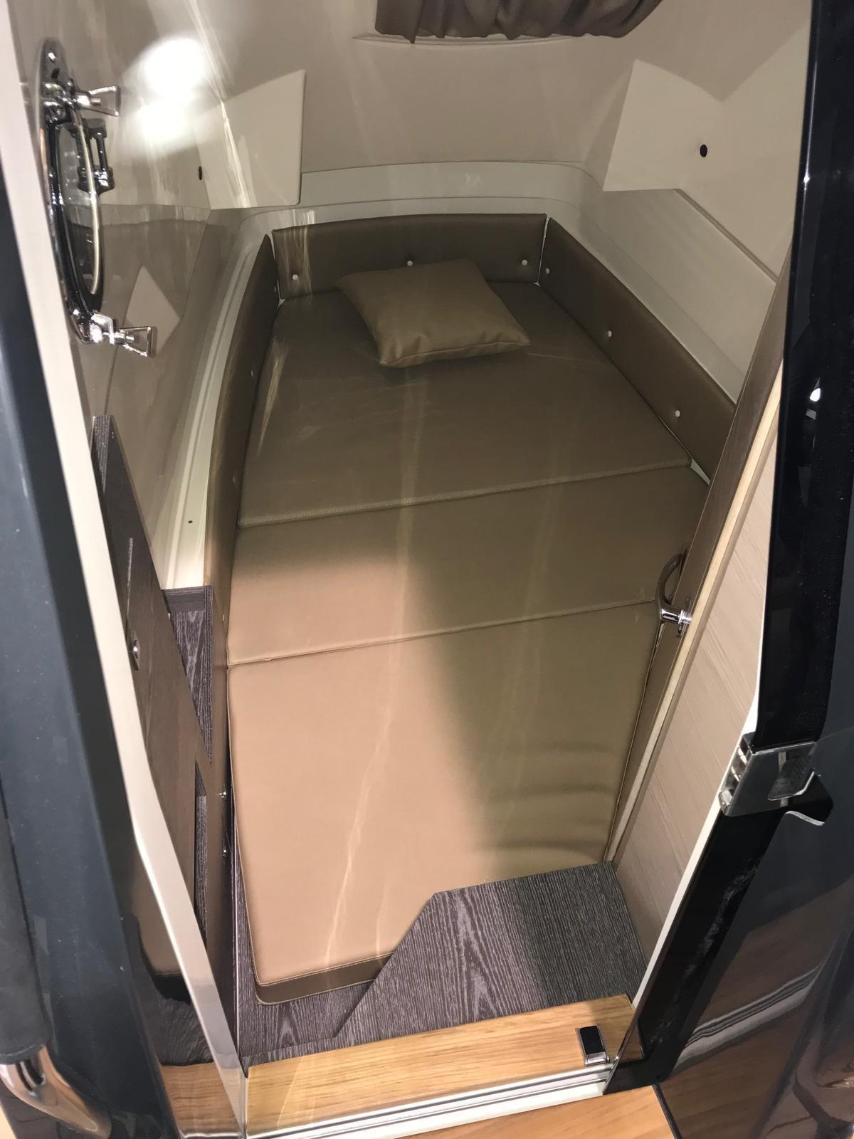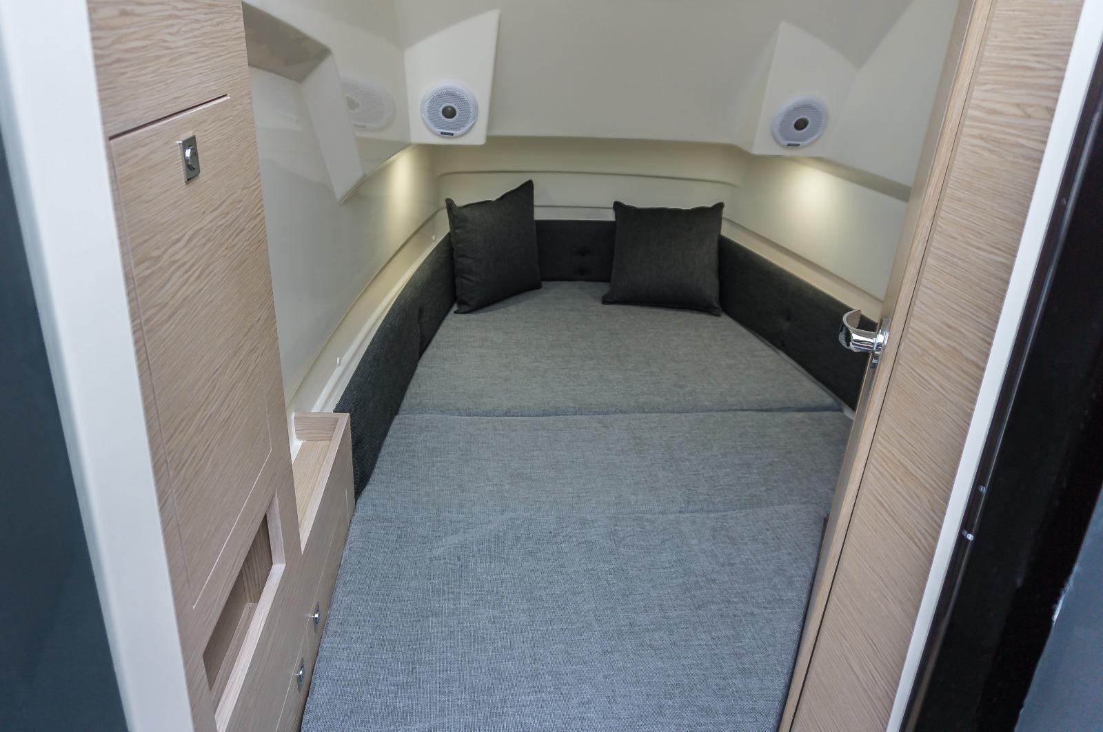 Équipement standard Hublots latéraux en verre trempé Configuration complète de la cabine avec mobilier, meubles et coussins Compas encastré avec éclairage Console complète avec tableau de bord pour les commandes et les instruments Mains courantes dans la console en acier inoxydable Coussins extérieurs complets à cellules fermées Réfrigérateur à tiroirs