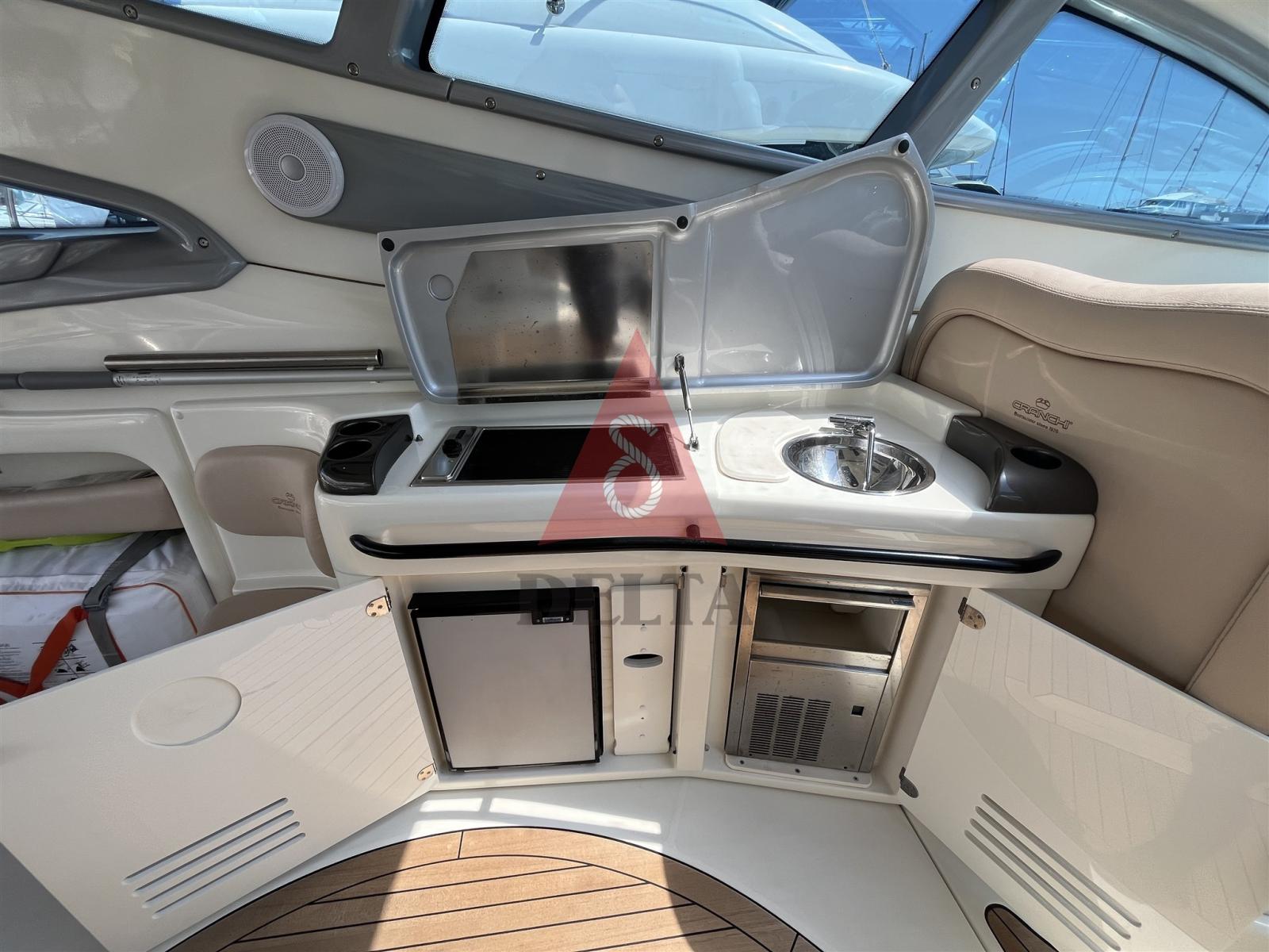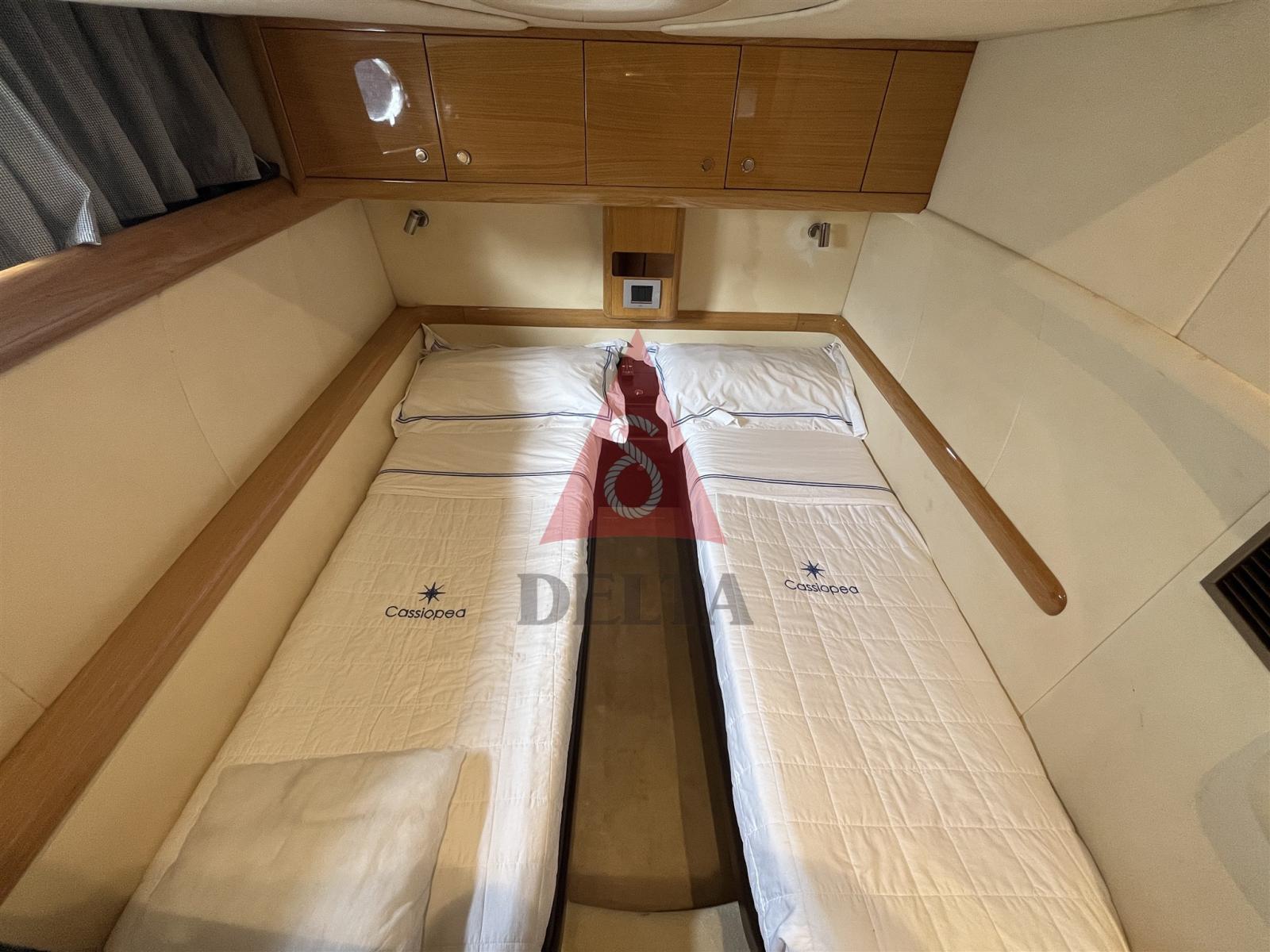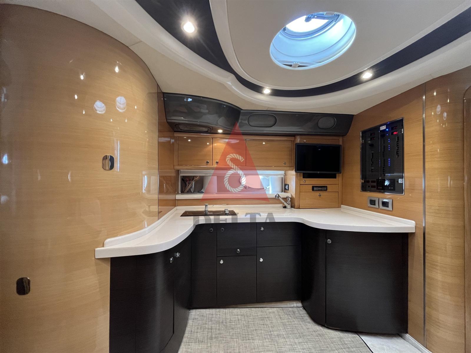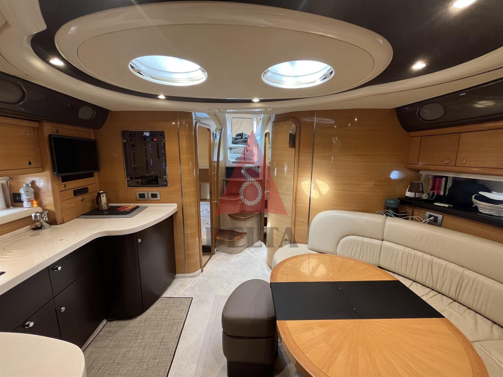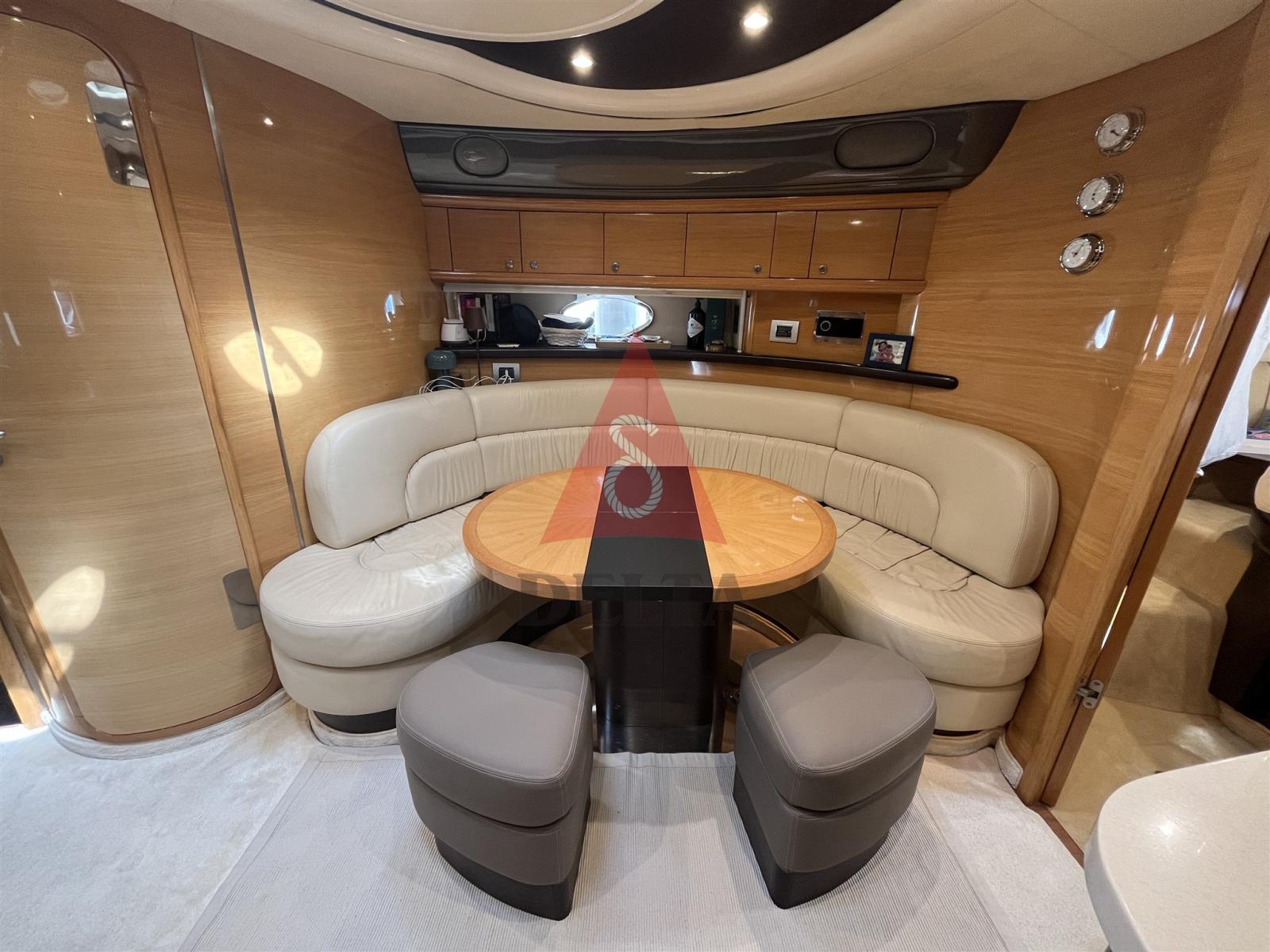 Alarme moteur, Alarme de pompe de cale, Ancre (20 Kg), Eau sous pression, Douche de cockpit (Calda/Fredda), Propulseur de poupe (Side Power), Propulseur d'étrave (Side Power), Phare de poursuite, Flaps hydrauliques, Garage à annexe, Hard top, Extincteur(s) fixe(s), Indicateurs de flaps, Lavage de chaine, Lavabo dans le cockpit, Éclairage de courtoisie, Spots sous-marins, Passerelle (idraulica telescopica con telecomando), Plateforme arrière, Pompe de cale automatique, Pompe de cale manuelle, Cockpit en teck, Prise de quai, Connexion eau sous pression à quai, Onduleur, Guindeau électrique (Lofrans con radiocomando), Echelle de bain, table de cockpit, Corne, 2 Winch électrique arrière, Winch électrique avant.