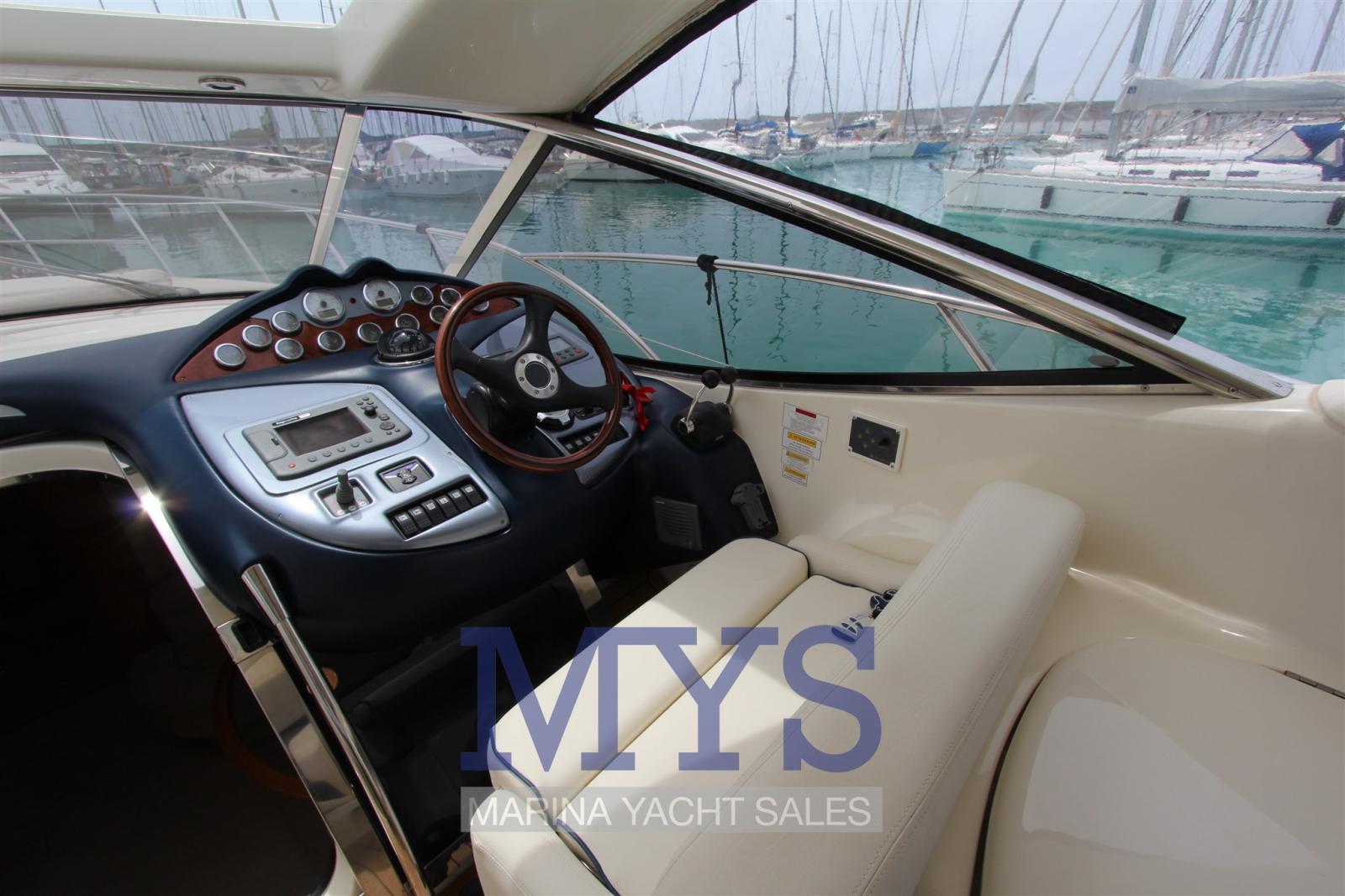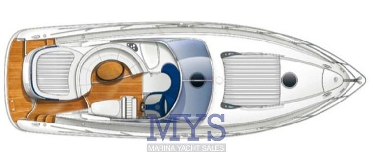 Alarme moteur, Alarme de pompe de cale, Eau sous pression, Couleur spéciale (Facsia blù), Douche de cockpit, Flaps hydrauliques, Garage à annexe, Hard top (Elettrico), Éclairage de courtoisie, Passerelle (Idraulica), Plateforme arrière, Pompe de cale automatique, Porte latérale, Cockpit en teck, Prise de quai, Guindeau électrique, Echelle de bain, table de cockpit, Corne.