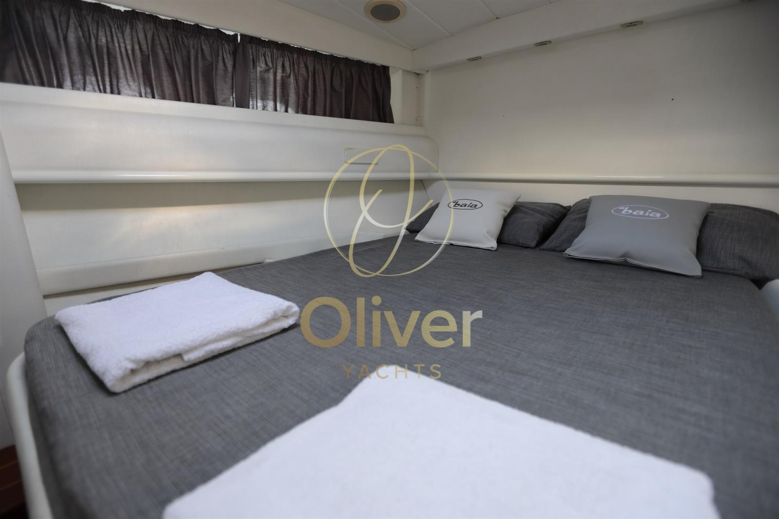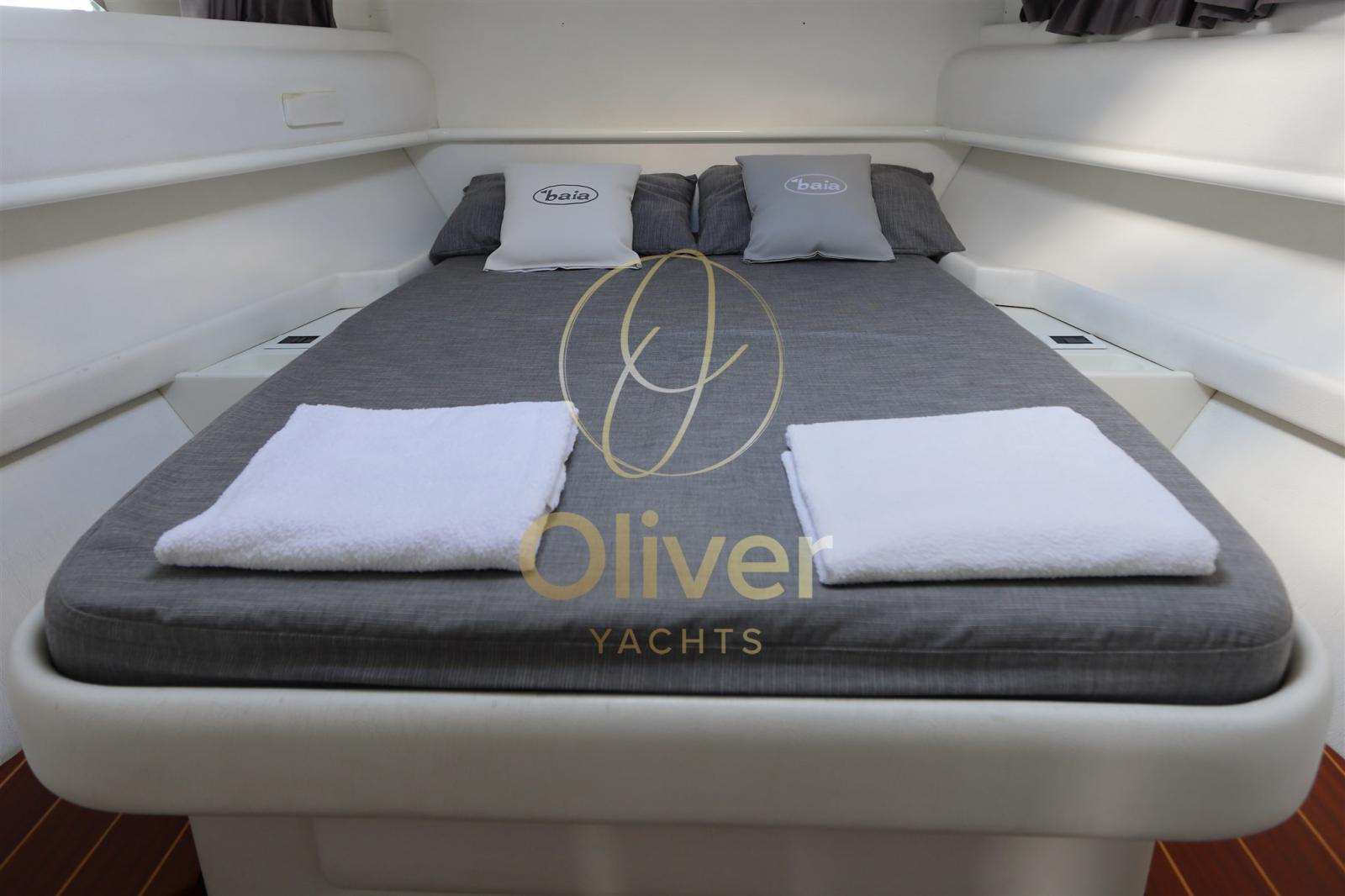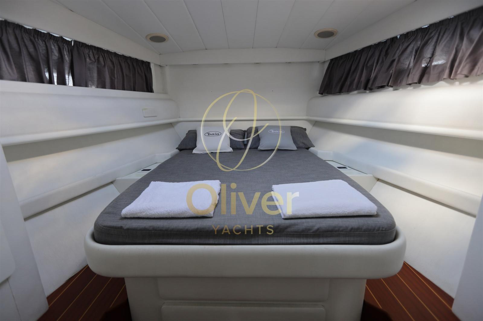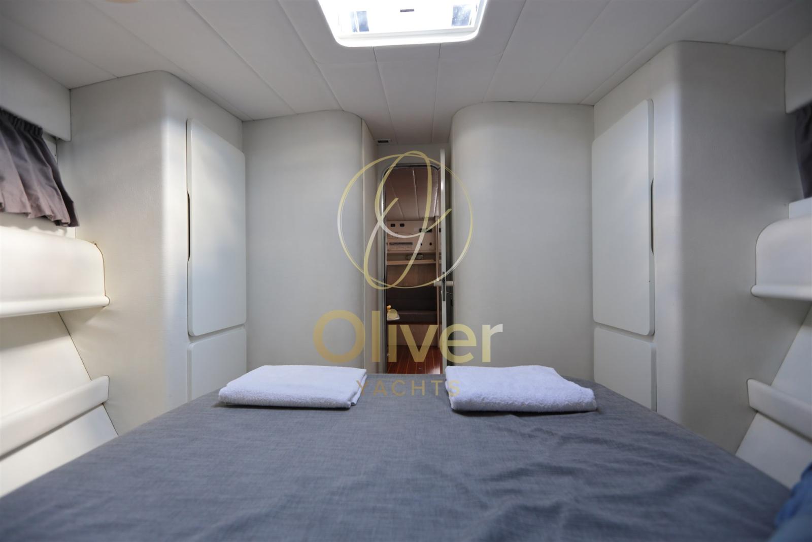 La zone de couchage comprend une cabine propriétaire bien proportionnée, avec un lit double et des armoires, finies avec des tissus et des surfaces coordonnés. Il existe également une cabine individuelle pour le marin, accessible séparément, qui peut également être utilisée comme compartiment technique ou espace de rangement.