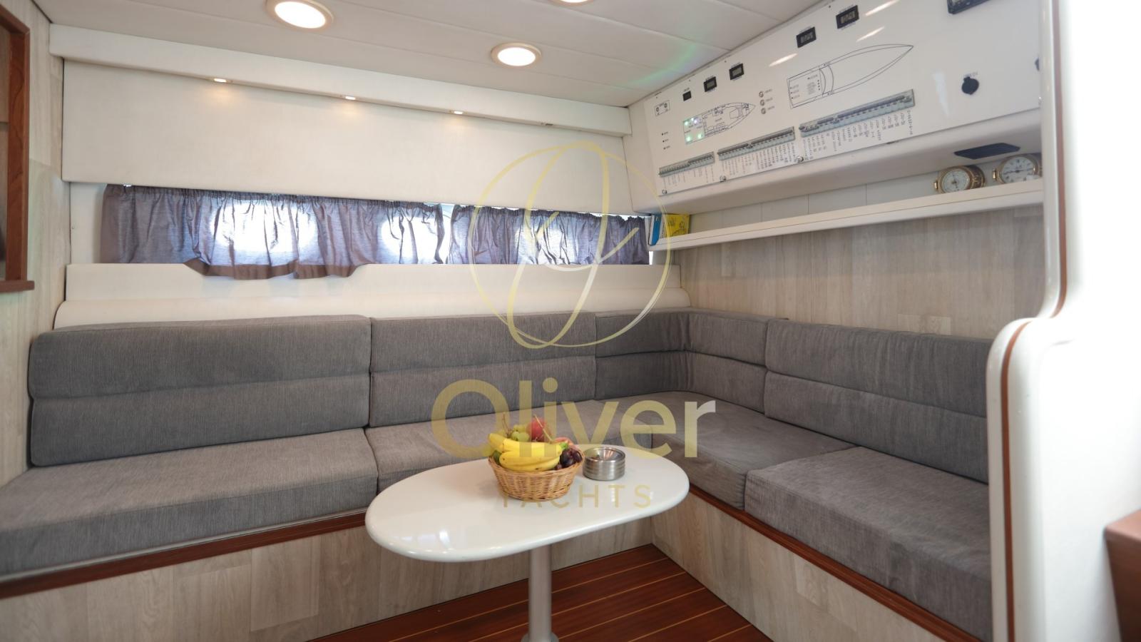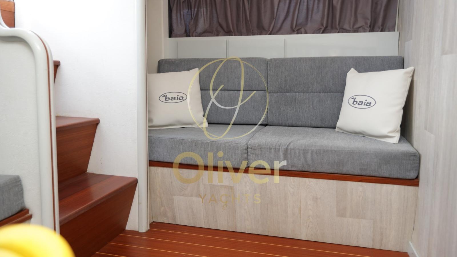 L’aménagement actuel comprend un espace de vie confortable avec un grand canapé en forme de « U », un canapé en ligne et un bar, parfait pour socialiser ou se détendre. Les hublots latéraux permettent à la lumière naturelle d’éclairer l’intérieur, créant une atmosphère aérée et sophistiquée.