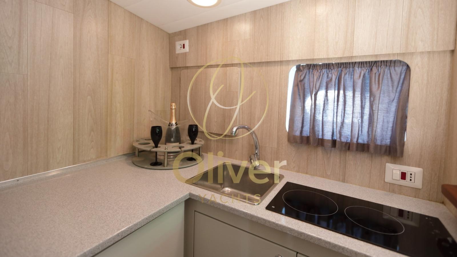 La salle de bain a été entièrement redessinée et positionnée sur la gauche, à la place de l’ancienne cabine d’invités. Il dispose désormais d’une douche séparée, d’un lavabo moderne et d’équipements de style contemporain, avec une optimisation de l’espace et une facilité d’utilisation. À la place de l’ancienne salle de bain, une cuisine séparée a été créée, équipée d’une double plaque de cuisson, d’un réfrigérateur à tiroirs et de nombreux compartiments de rangement. Cette configuration offre plus d’intimité entre les espaces de service et ceux dédiés à la vie à bord.