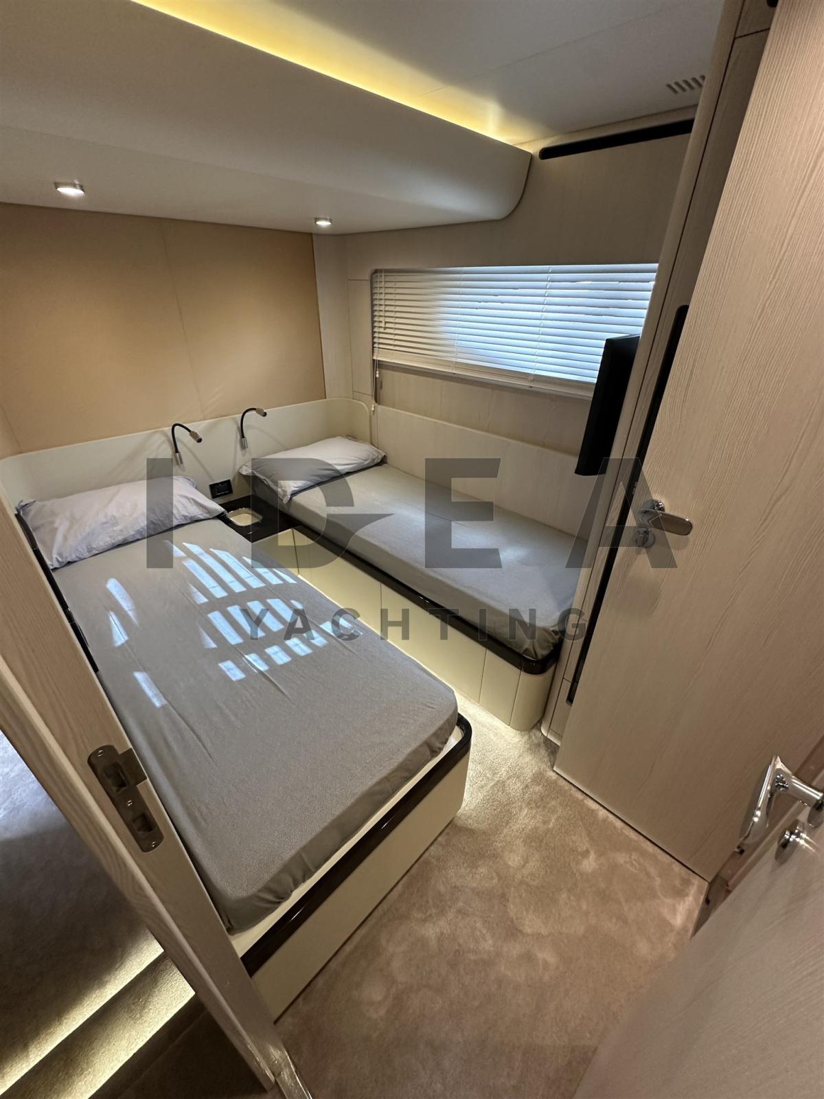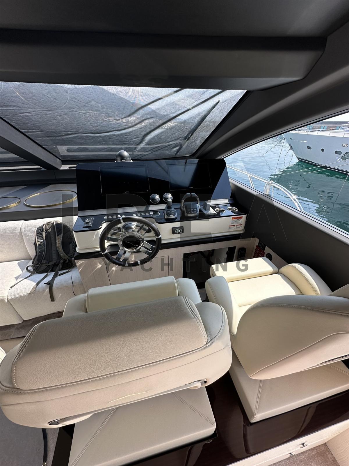 Bimini (on the bow with carbon poles), Sellerie complète, Coussin avant, Sellerie de fly, sellerie de cockpit, Rideaux occultants, Taud électrique.