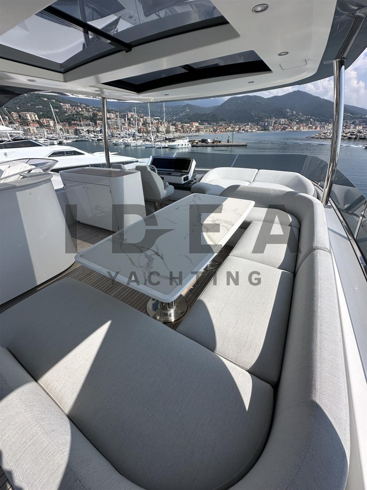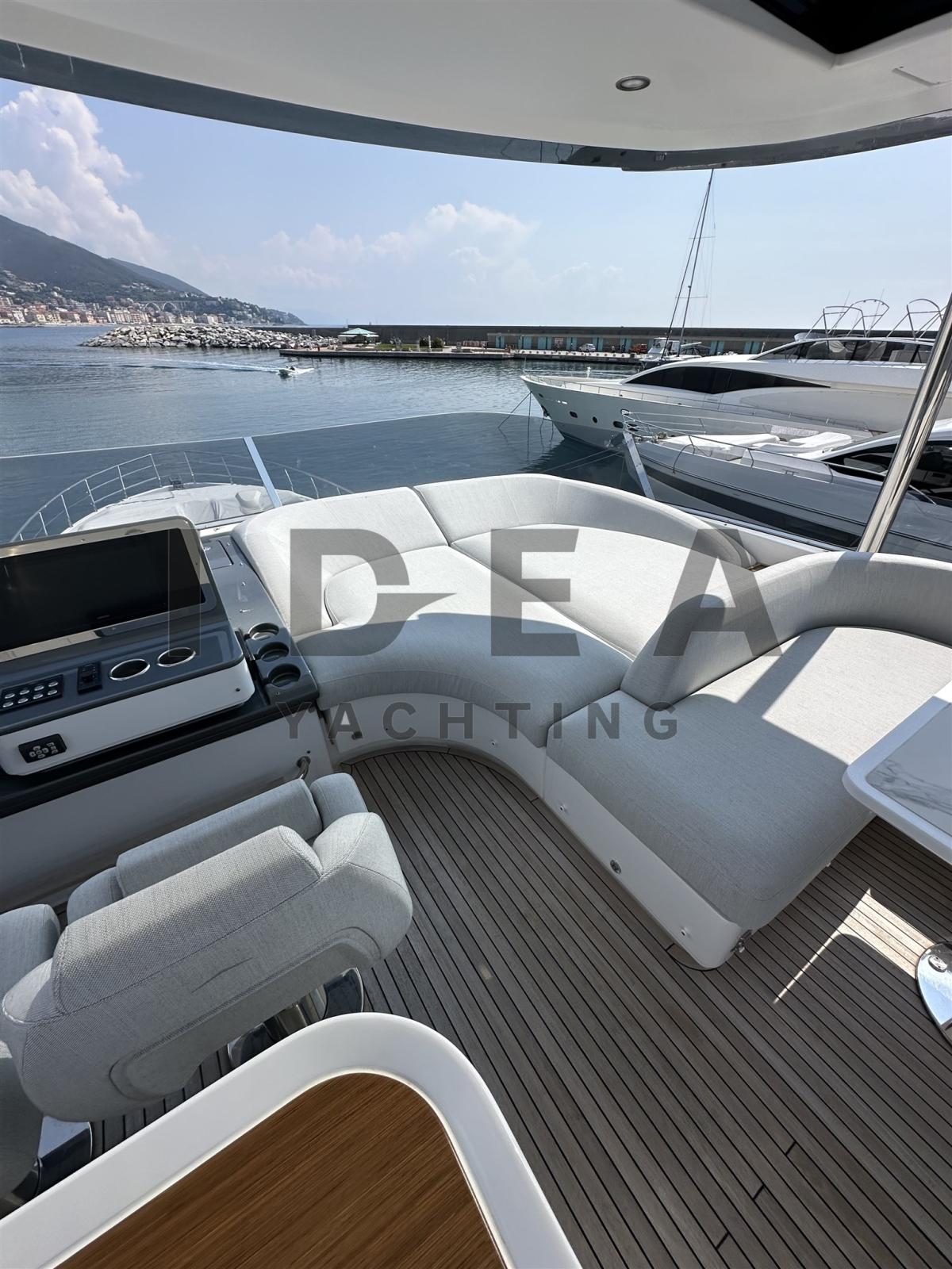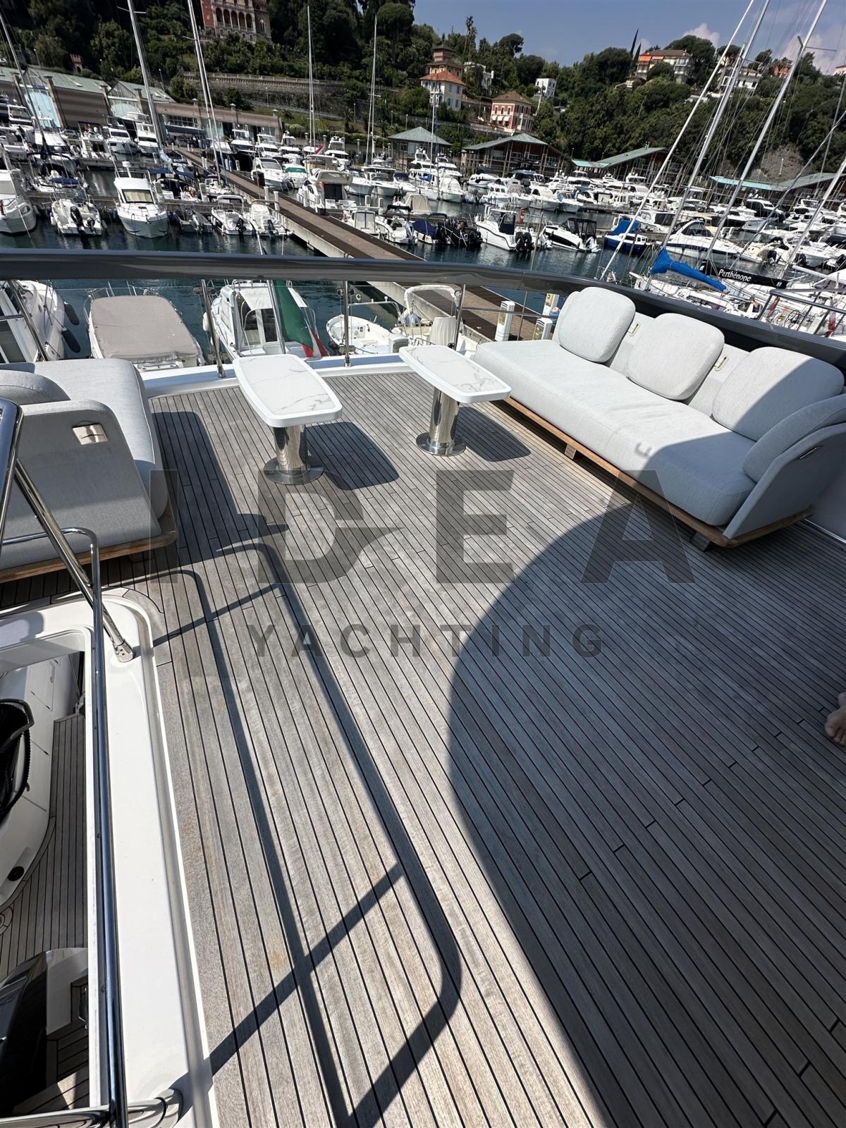 Alarme gaz, Alarme moteur, Alarme de pompe de cale, Eau sous pression, Passavant en teck, Douche de cockpit, Double barre à roue, Phare de poursuite (electric), Hard top, Extincteur(s) fixe(s), Éclairage de courtoisie, 7 Spots sous-marins, Passerelle (Opacmare hydraulic telescopic), Plateforme arrière (hydraulic), Pompe de cale automatique, Pompe de cale manuelle, Porte latérale, Porte latérale, Cockpit en teck, Prise de quai, Connexion eau sous pression à quai, Onduleur, Guindeau électrique, Echelle de bain, Stabilisateurs (Seakeeper NG26), table de cockpit, Corne, 2 Winch électrique arrière, Winch électrique avant.