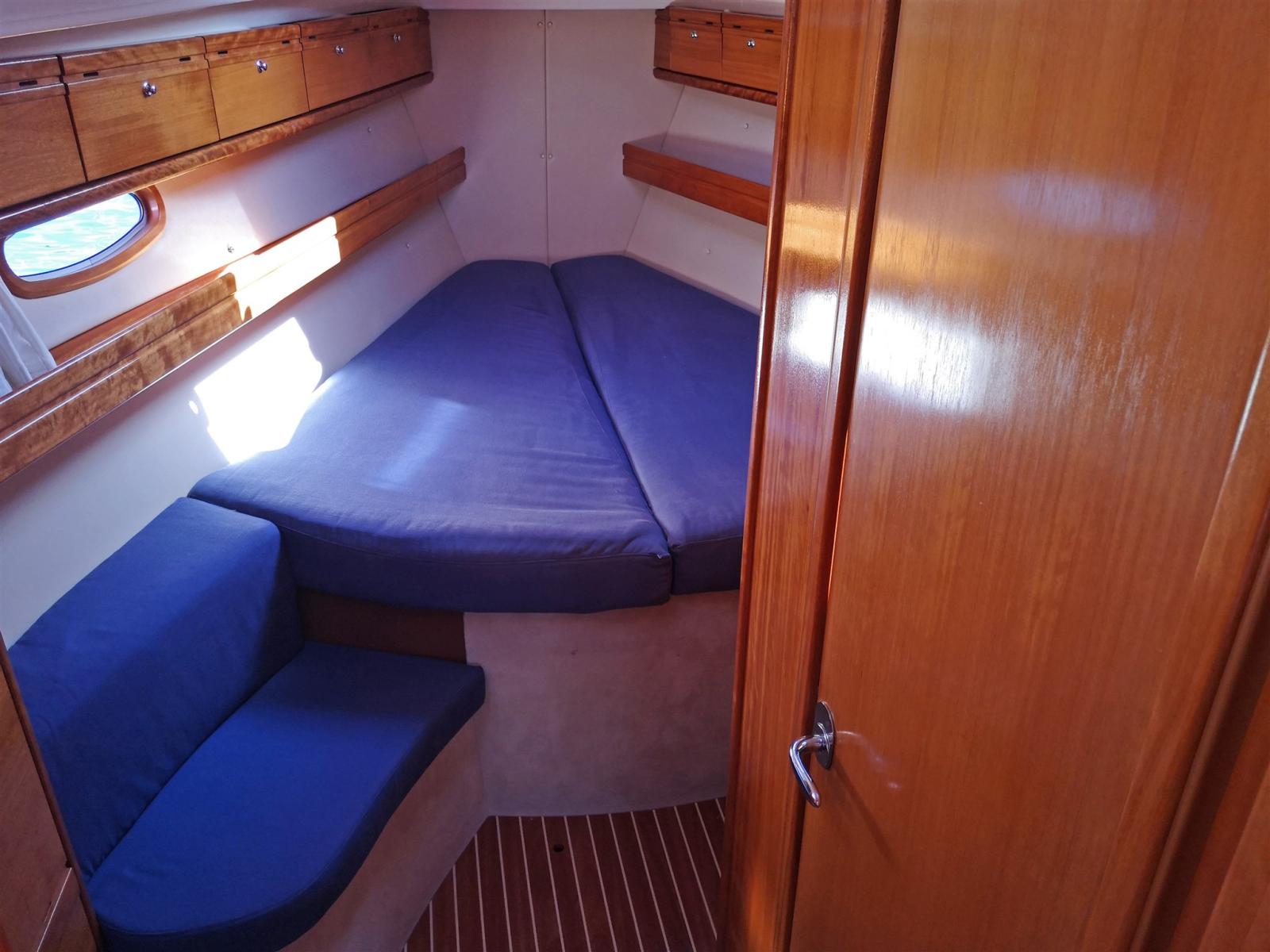 Cabine du propriétaire à l’avant avec lit double en V, siège latéral, armoire à deux portes et salle de bain privée avec lavabo, toilettes marines et douche.