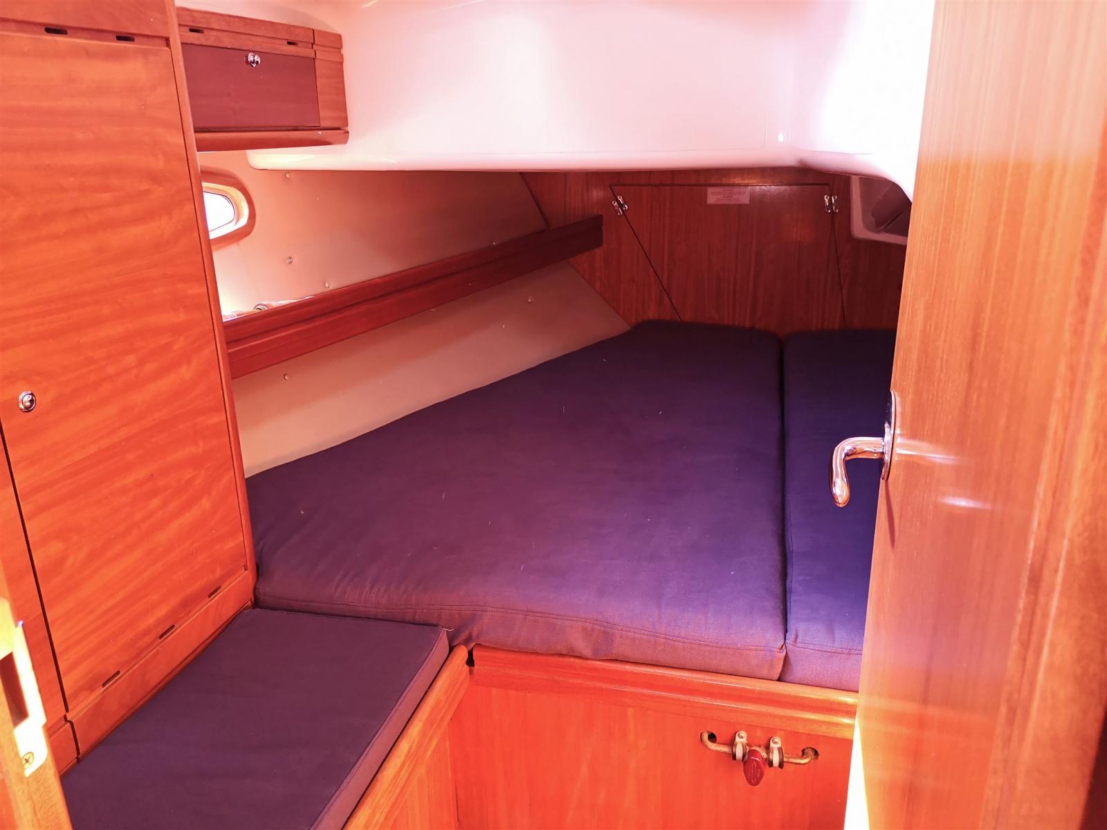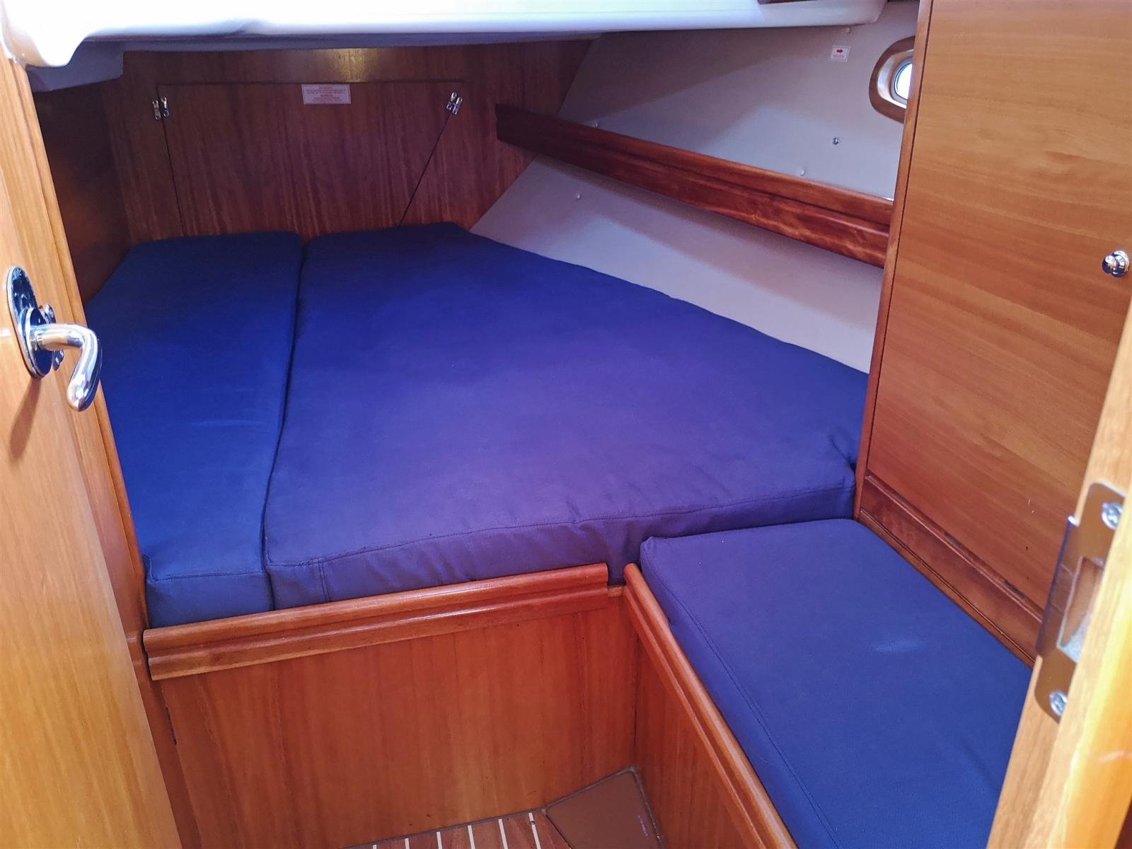 Cabine arrière droite avec lit double, sièges bordés et garde-robe