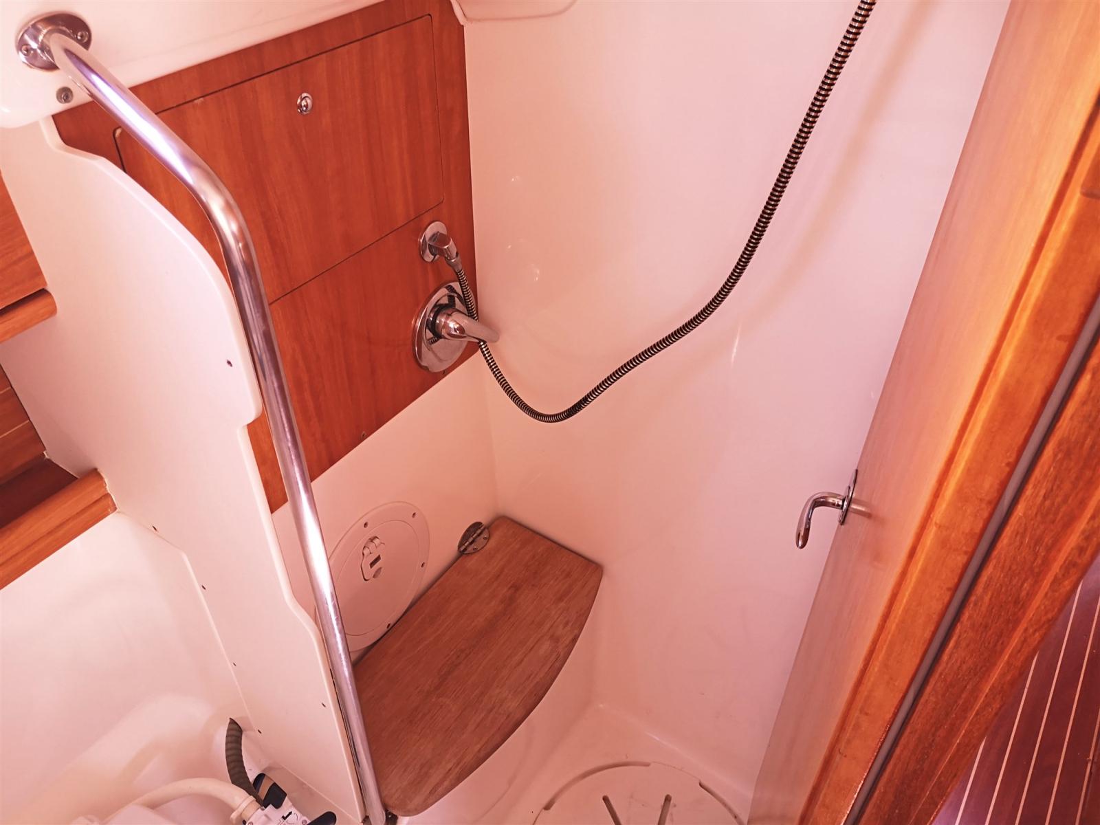Salle de bain arrière gauche avec lavabo, toilettes marines manuelles et cabine de douche