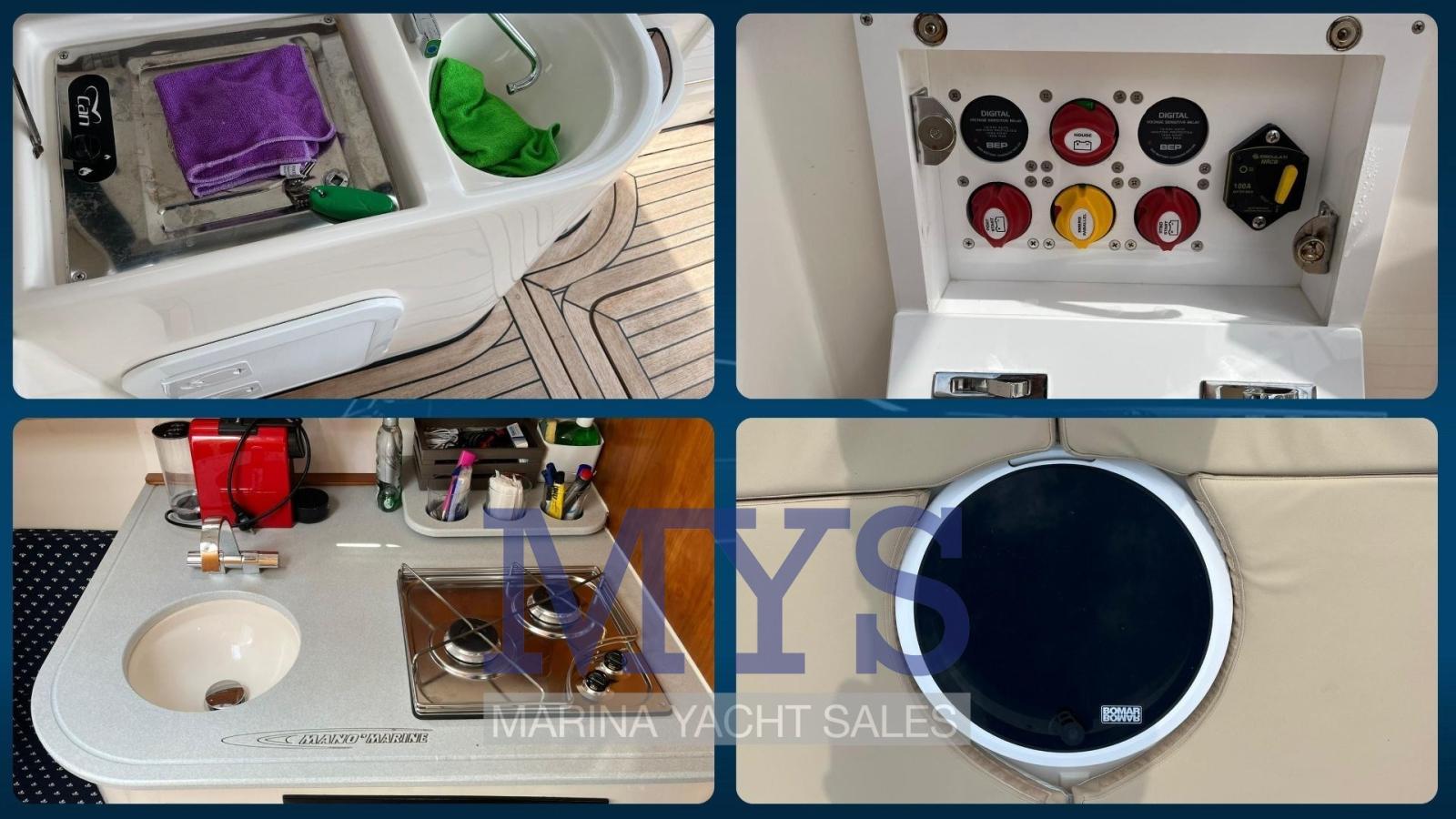 Alarme gaz, Alarme de pompe de cale, Ancre (kg. 7,5 + 50 mt di catena nuova 2024), 3 Batteries (x 150 Ah nuove 2024), Chargeur de batterie (nuovo 2024), Douche de cockpit (nuova 2024), Flaps hydrauliques, Lavabo dans le cockpit (+ 1 fuoco a gas nuovo 2024), Éclairage de courtoisie (nuove 2024), Spots sous-marins, Plateforme arrière (in teak), Pompe de cale automatique (nuova 2024), Pompe de cale manuelle, Porte latérale, Cockpit en teck (nuovo 2024), Guindeau électrique (nuovo 2024), Table pliante de salon, Corne.