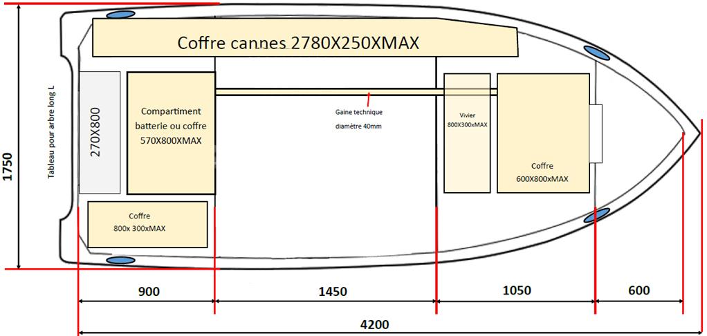 - un coffre latéral tribord pour rangement de canne jusqu'à 2,5 mètres de long, accastillage Inox, ferme à clef.