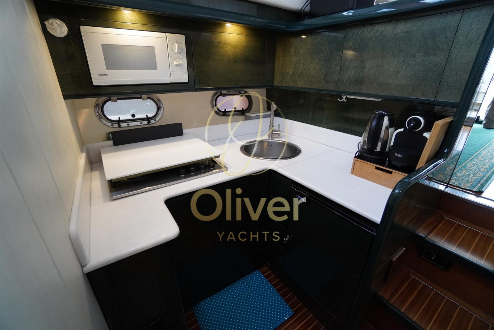 En entrant dans la dînette, nous trouvons un canapé en forme de L avec une table à bâbord, à tribord il y a une grande console qui abrite la télévision et un grand réfrigérateur. La porte vitrée donne une grande luminosité à la pièce et la laque verte des meubles se démarque. Vers la proue, sur la gauche, nous trouvons le poste de pilotage, en descendant 3 marches, vous entrez dans la grande cuisine en forme de U dans laquelle elle est aujourd’hui installée dans une cuisinière électrique, mais dans l’équipement du bateau, il y a aussi une cuisinière à gaz à 4 feux. Dans les armoires de cuisine, il est prévu l’installation d’un deuxième réfrigérateur.