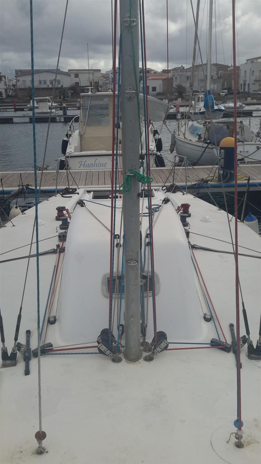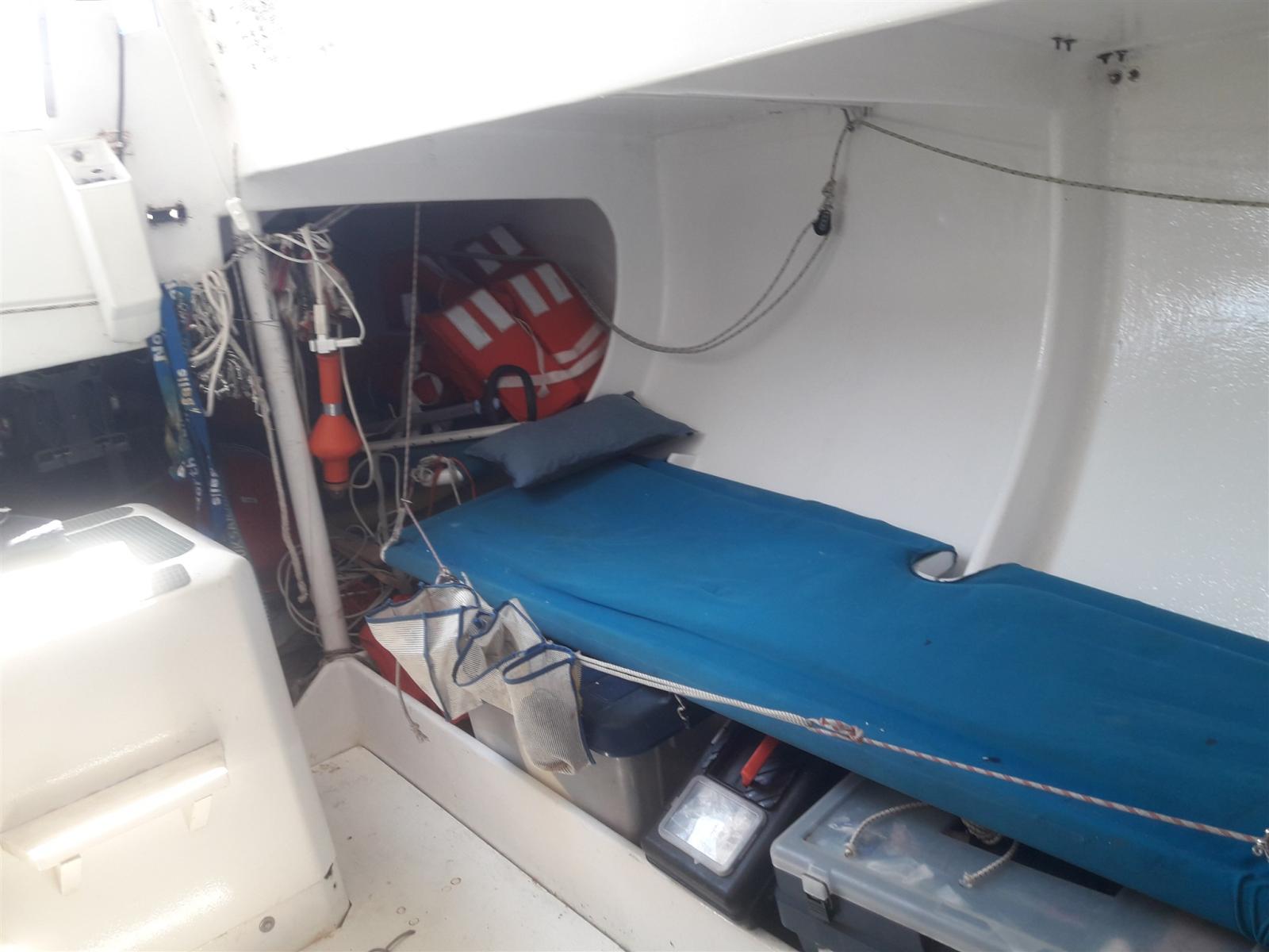 dans très peu d’exemples, dont celui-ci semble être le seul sur le marché aujourd’hui. 4 lits, toilettes chimiques, pilote automatique et station éolienne. Équipé d’environ 15 voiles, dont certaines sont pratiquement neuves en Kevlar et de 2 poteaux de spi qui atteignent à peu près la valeur du bateau lui-même. Gréement refait en 2016. Equipement de pont Harken et Ronstan. 2 formes par prise. 1 échelle artisanale. Moteur Volvo-Penta 18 cv à voilier avec hélice repliable reconditionné en 2021