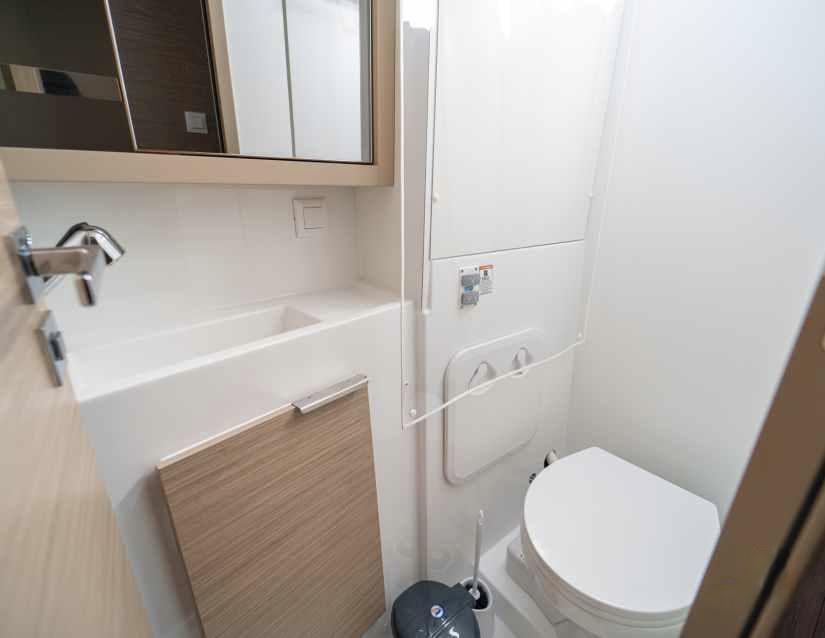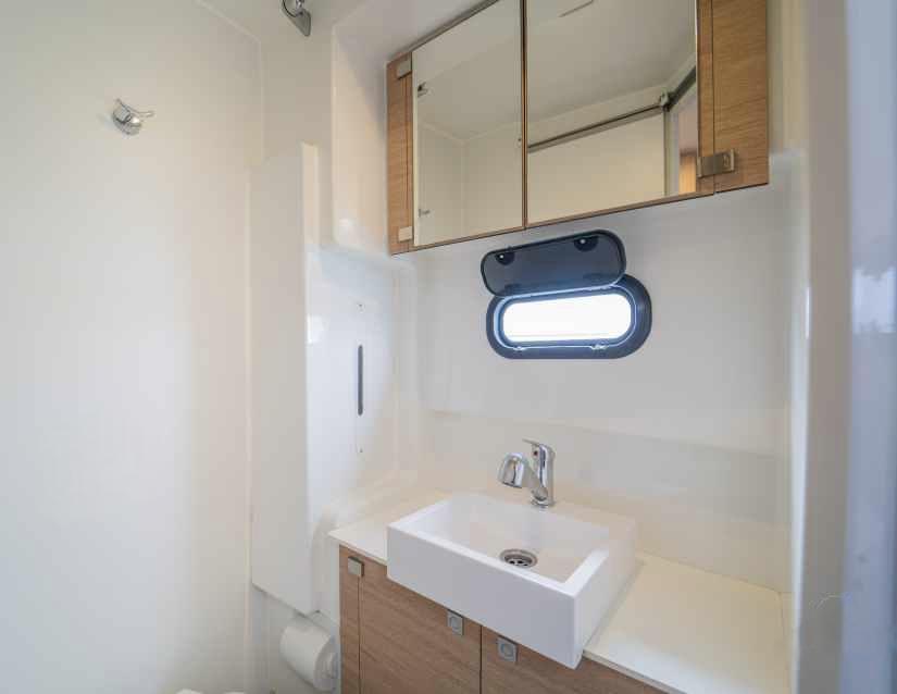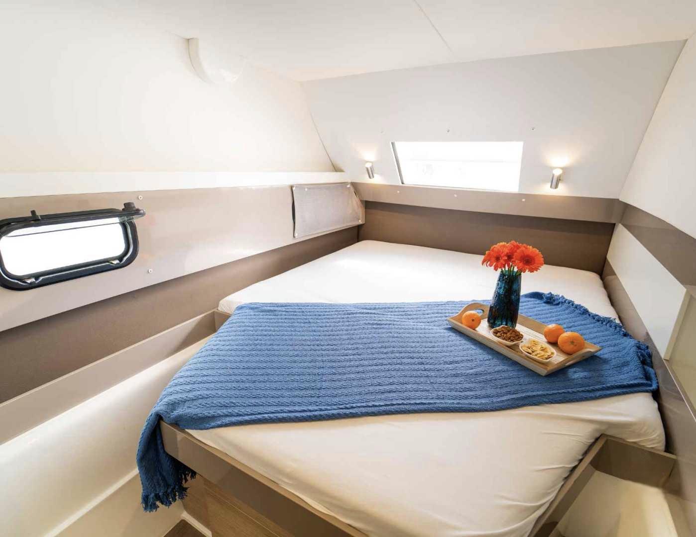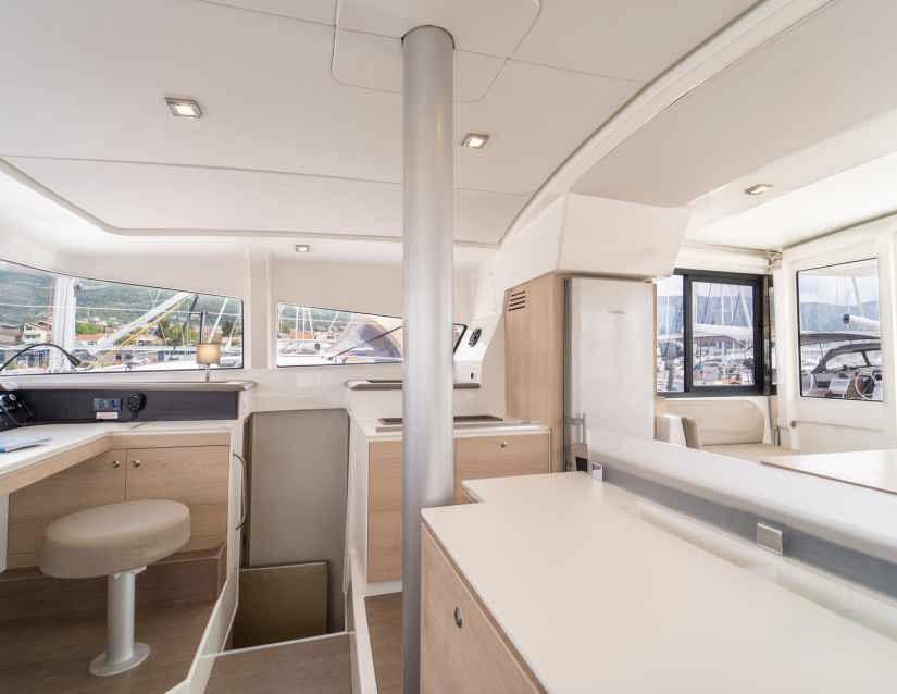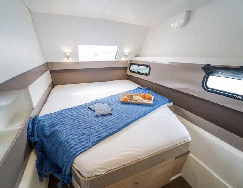 Le carré, ouvert sur l’extérieur grâce à la porte rigide basculante, se prolonge naturellement vers le cockpit, créant un vaste espace de vie unique sur ce segment de catamaran. À l’avant, le cockpit rigide avec table et bains de soleil offre une zone de détente supplémentaire, idéale au mouillage comme en navigation. La cuisine en L est équipée d’un grand réfrigérateur/congélateur à tiroirs, d’une plaque de cuisson, d’un four, d’un double évier et de nombreux rangements, pour une autonomie optimale.