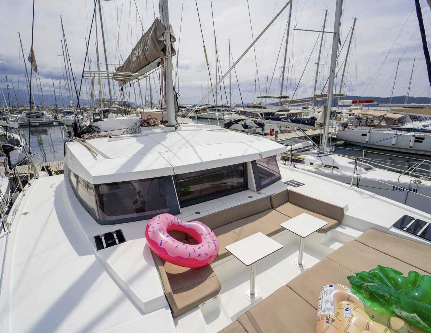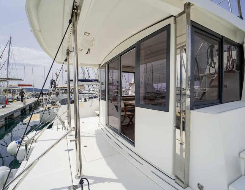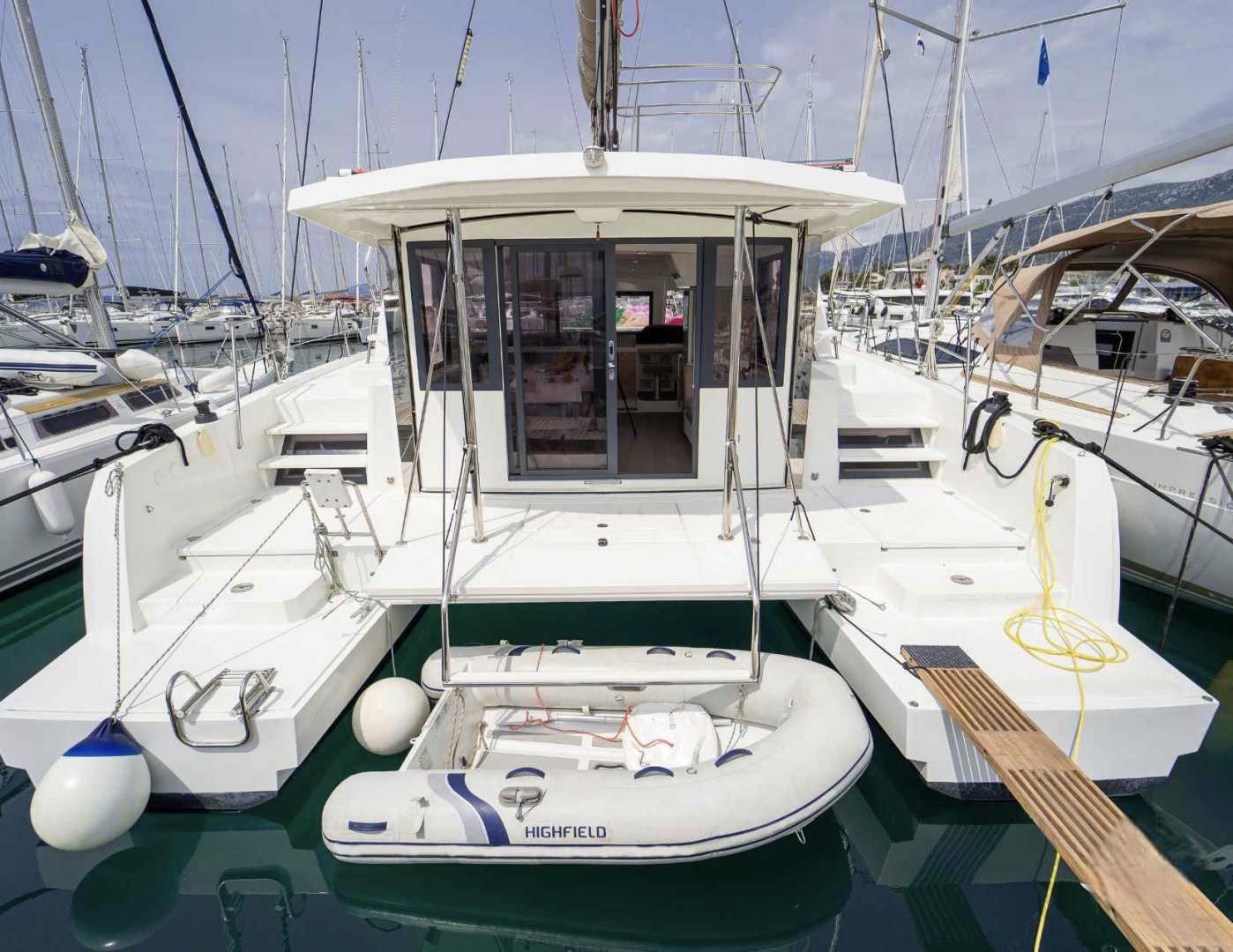 Ce catamaran est doté de: winch électrique, guindeau, électronique (GPS, pilote automatique, VHF, AIS), panneaux solaires, bimini rigide, sellerie extérieure, annexe, et plus encore. Ses performances en navigation et son agencement en font un bateau idéal pour naviguer en Méditerranée ou envisager un programme transatlantique.