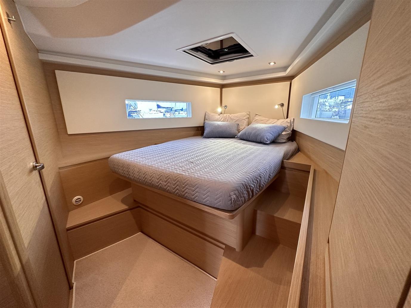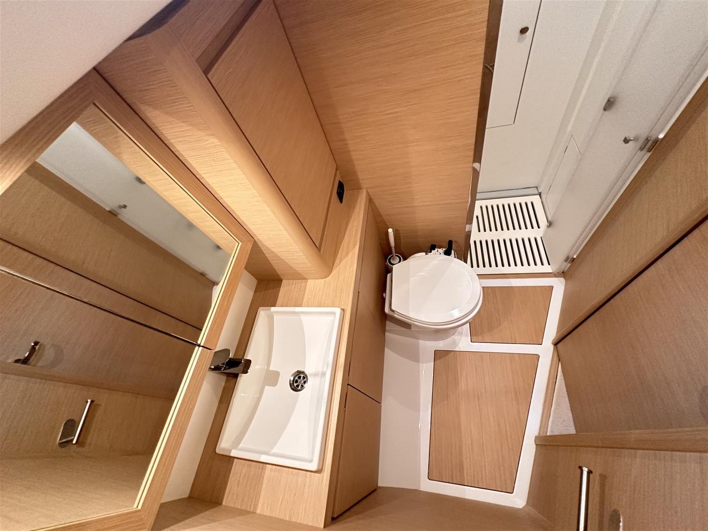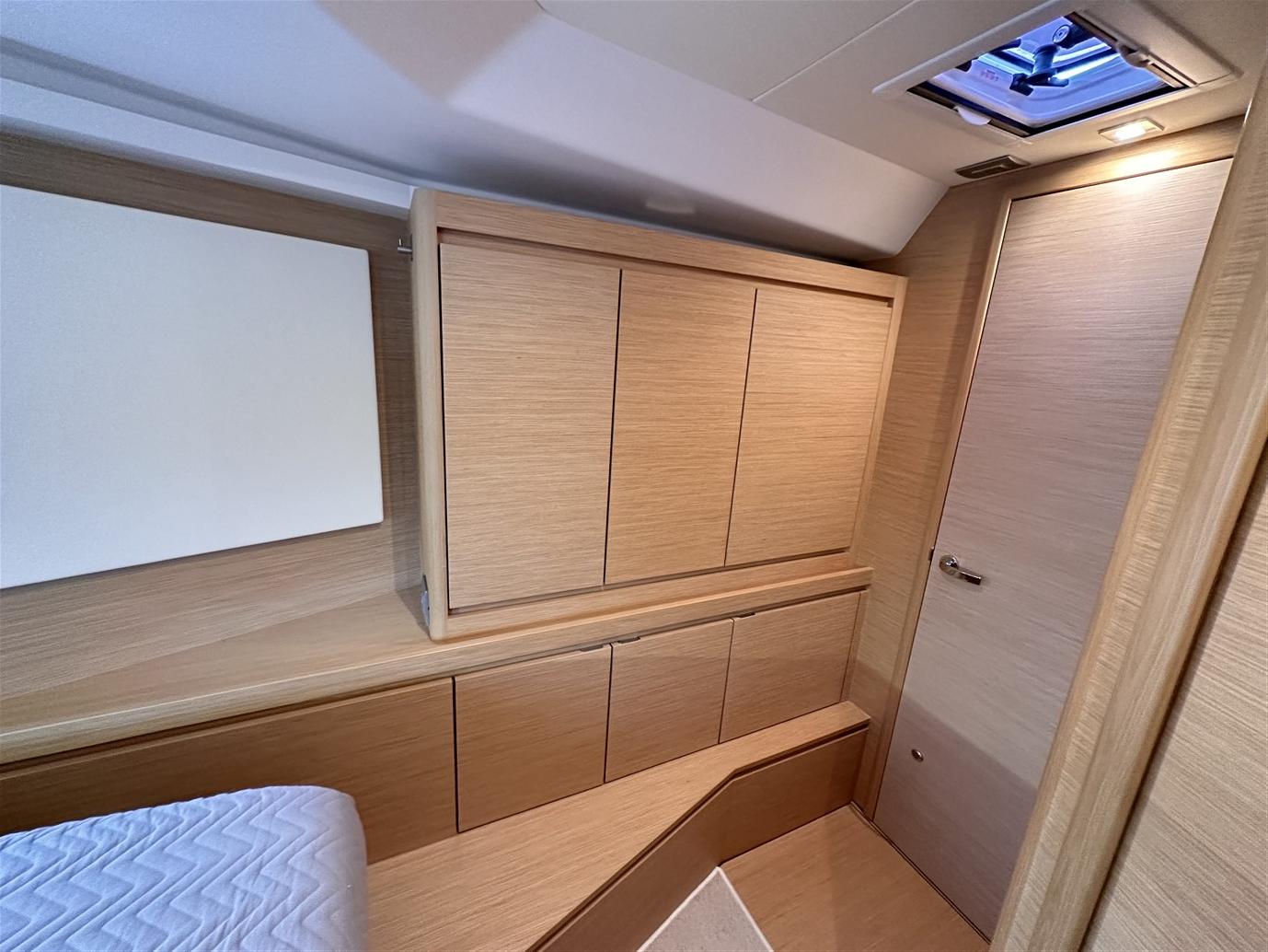 Configuré dans la version exclusive à deux cabines, en plus de l’habituelle et très généreuse cabine propriétaire avec salle de bain attenante à l’avant, nous trouvons la deuxième cabine (en fait une deuxième cabine propriétaire) et la grande salle de bain avec salle de douche séparée à l’arrière. Dans le cockpit, en revanche, il y a un grand coffre où vous pouvez ranger confortablement tout ce dont vous avez besoin pour votre croisière.