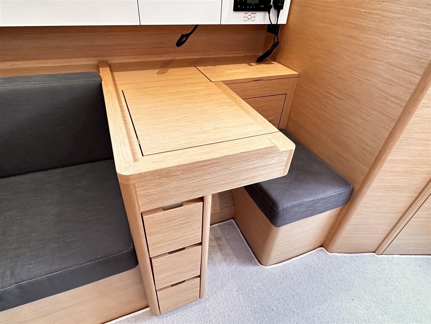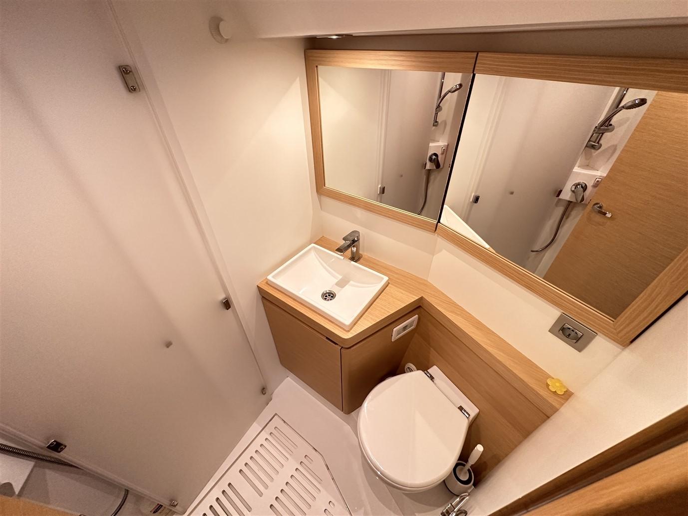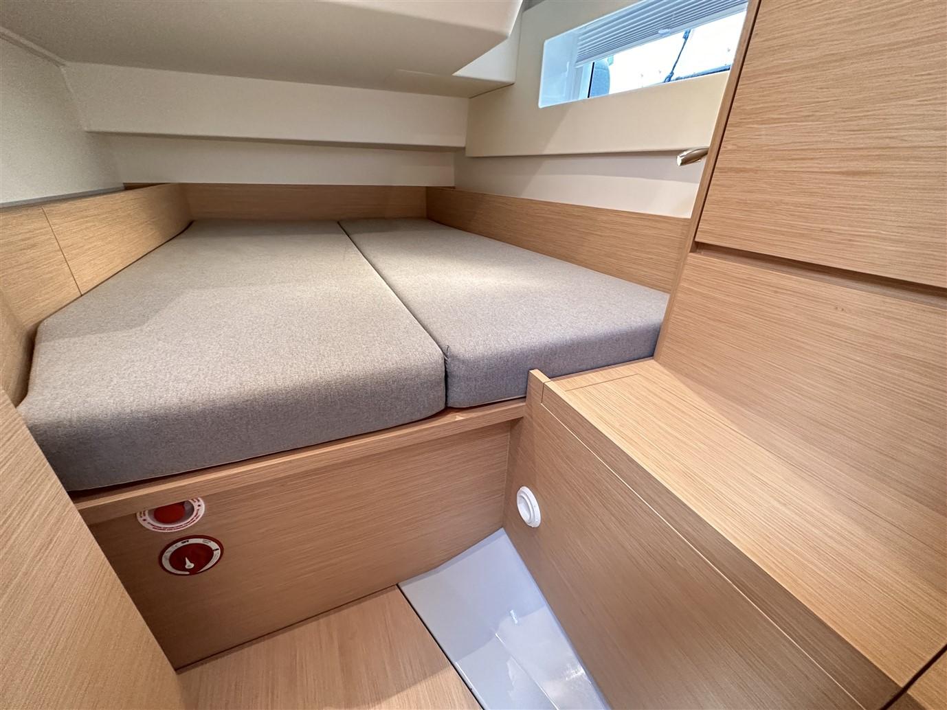 Configuré dans la version exclusive à deux cabines, en plus de l’habituelle et très généreuse cabine propriétaire avec salle de bain attenante à l’avant, nous trouvons la deuxième cabine (en fait une deuxième cabine propriétaire) et la grande salle de bain avec salle de douche séparée à l’arrière. Dans le cockpit, en revanche, il y a un grand coffre où vous pouvez ranger confortablement tout ce dont vous avez besoin pour votre croisière.