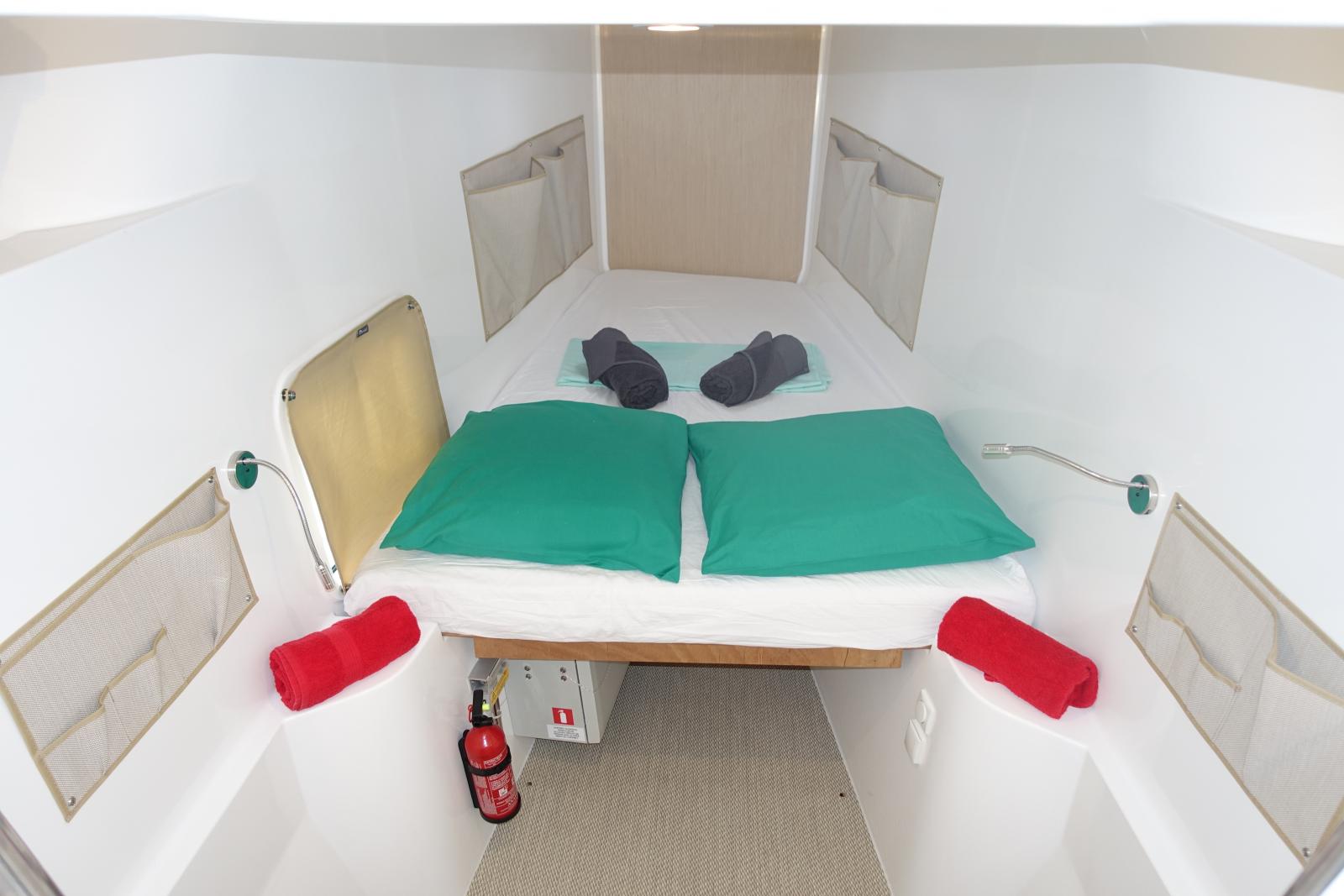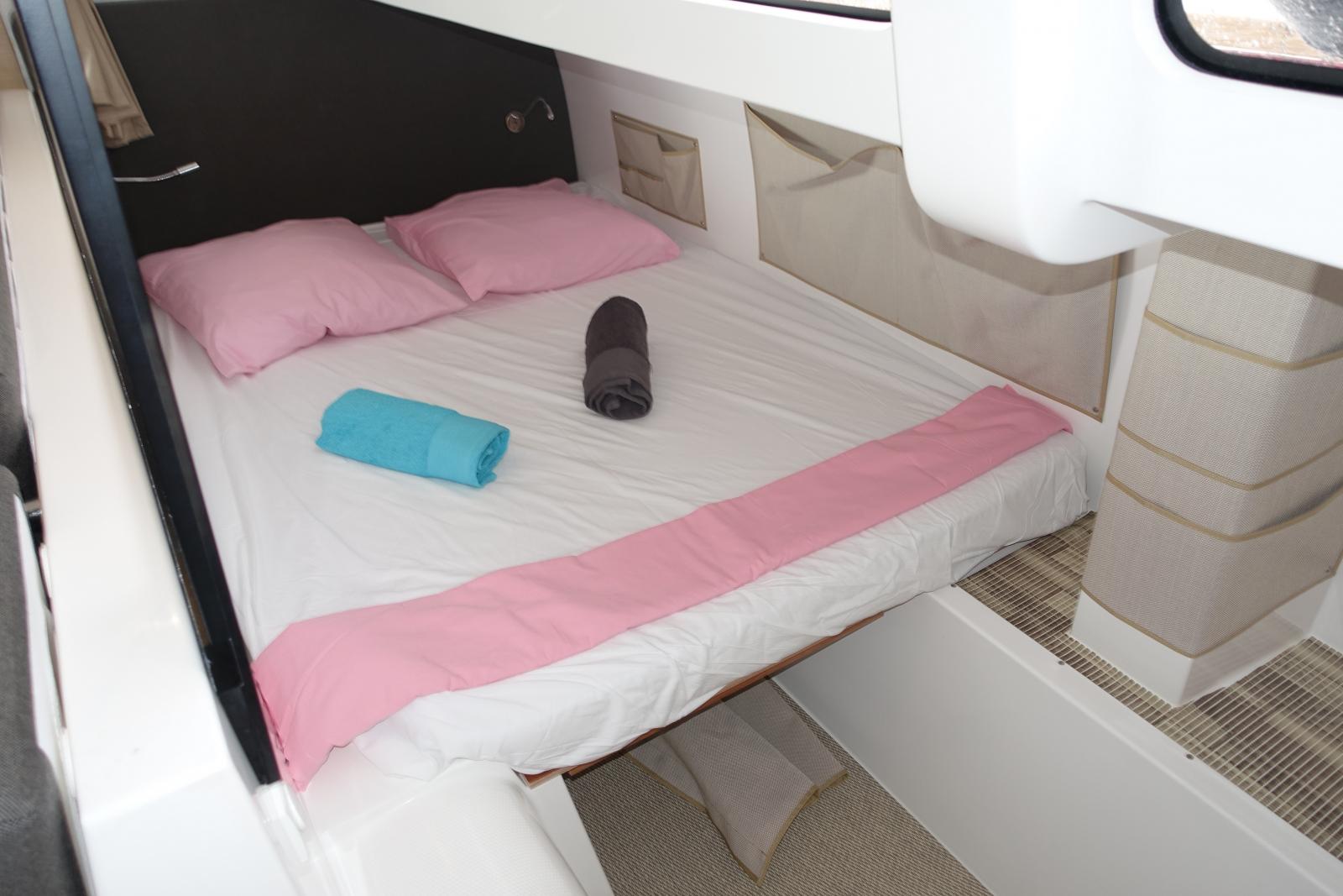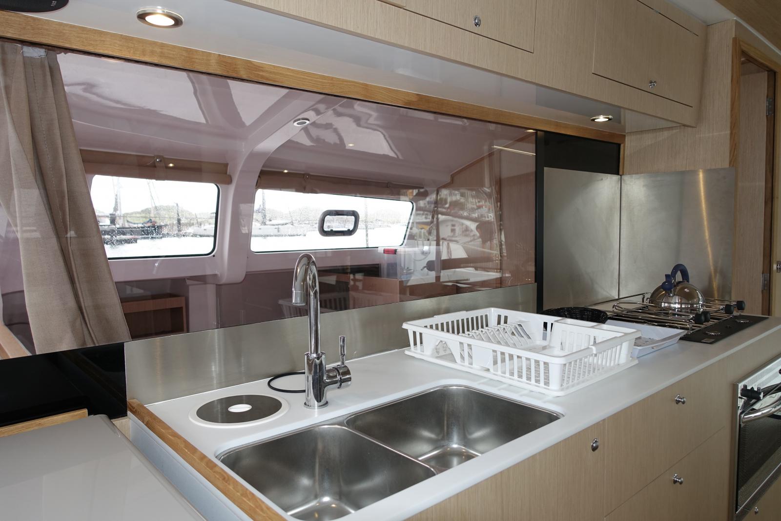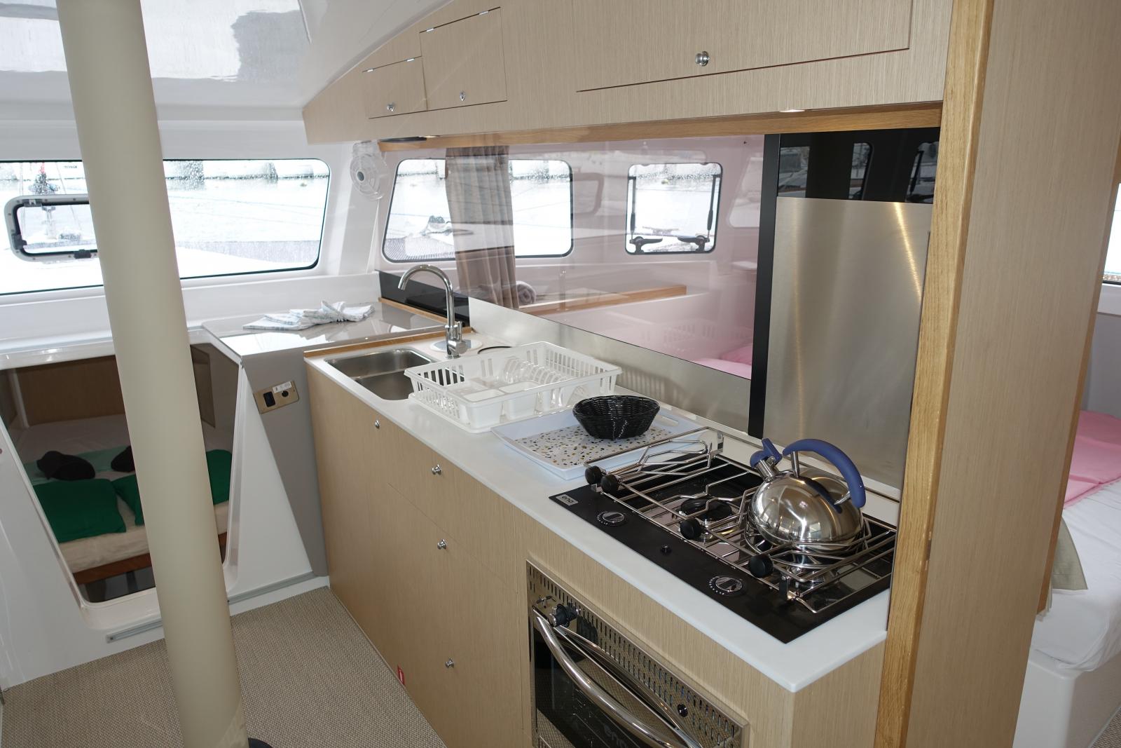 Côté cuisine, vous trouverez un réfrigérateur deux tiroirs (capacité 130 L) et un conservateur 75L dans la coque centrale,