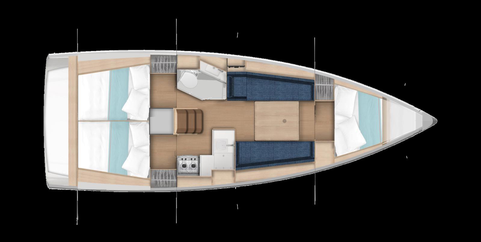 Avec une hauteur sous barrot supérieure à 1,85m, l'intérieur de ce voilier offre des espaces de vie exceptionnels pour un petit monocoque.